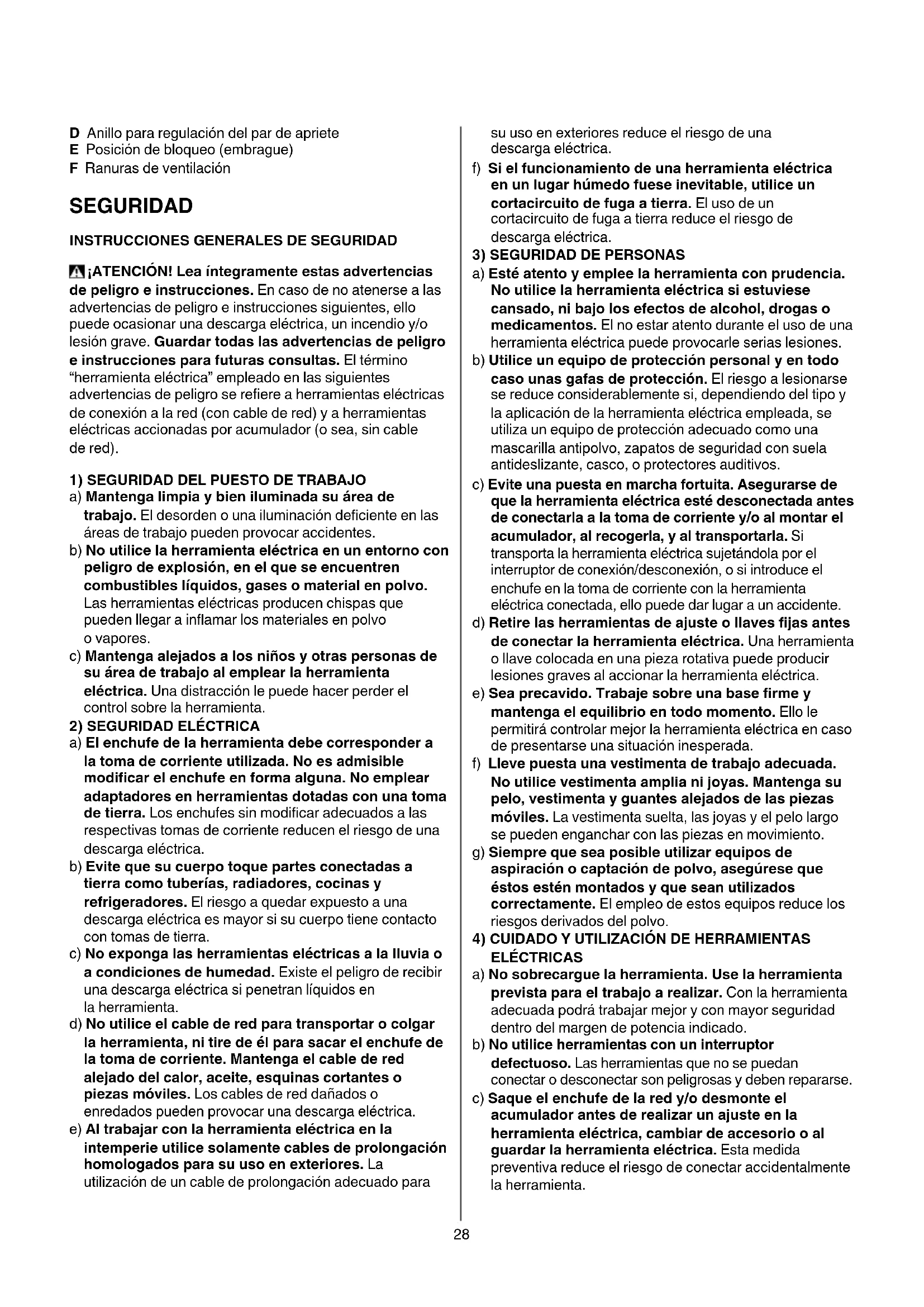 A Interruptor para encendido/apagado y control de velocidad B Interruptor para invertir la dirección de giro C Portabrocas sin llave28 D Anillo para regulación del par de apriete E Posición de bloqueo (embrague) F Ranuras de ventilación SEGURIDAD