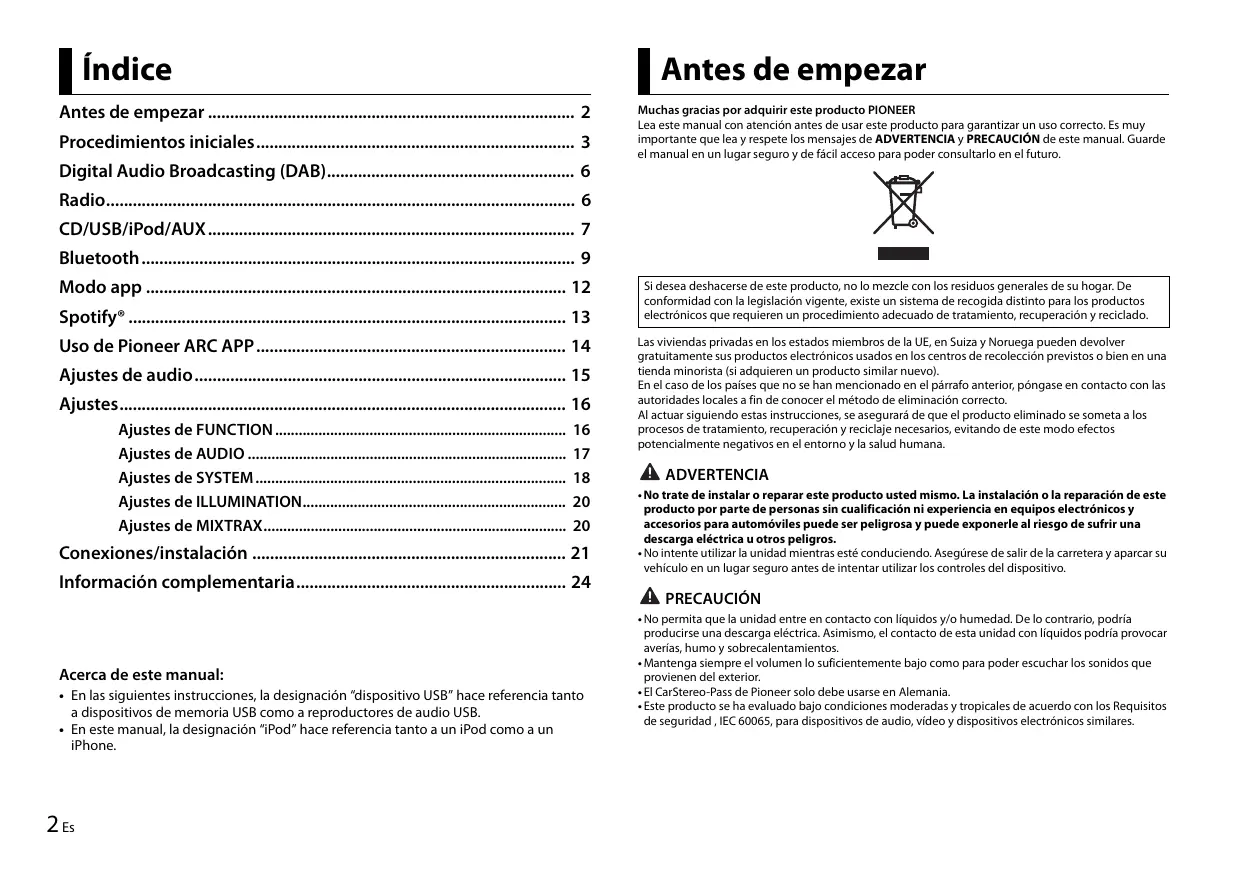 Collegare un dispositivo Bluetooth dell’elenco. S.RTRV USB iPod Antes de empezar Muchas gracias por adquirir este producto PIONEER Lea este manual con atención antes de usar este producto para garantizar un uso correcto. Es muy importante que lea y respete los mensajes de ADVERTENCIA y PRECAUCIÓN de este manual. Guarde el manual en un lugar seguro y de fácil acceso para poder consultarlo en el futuro. Acerca de este manual: