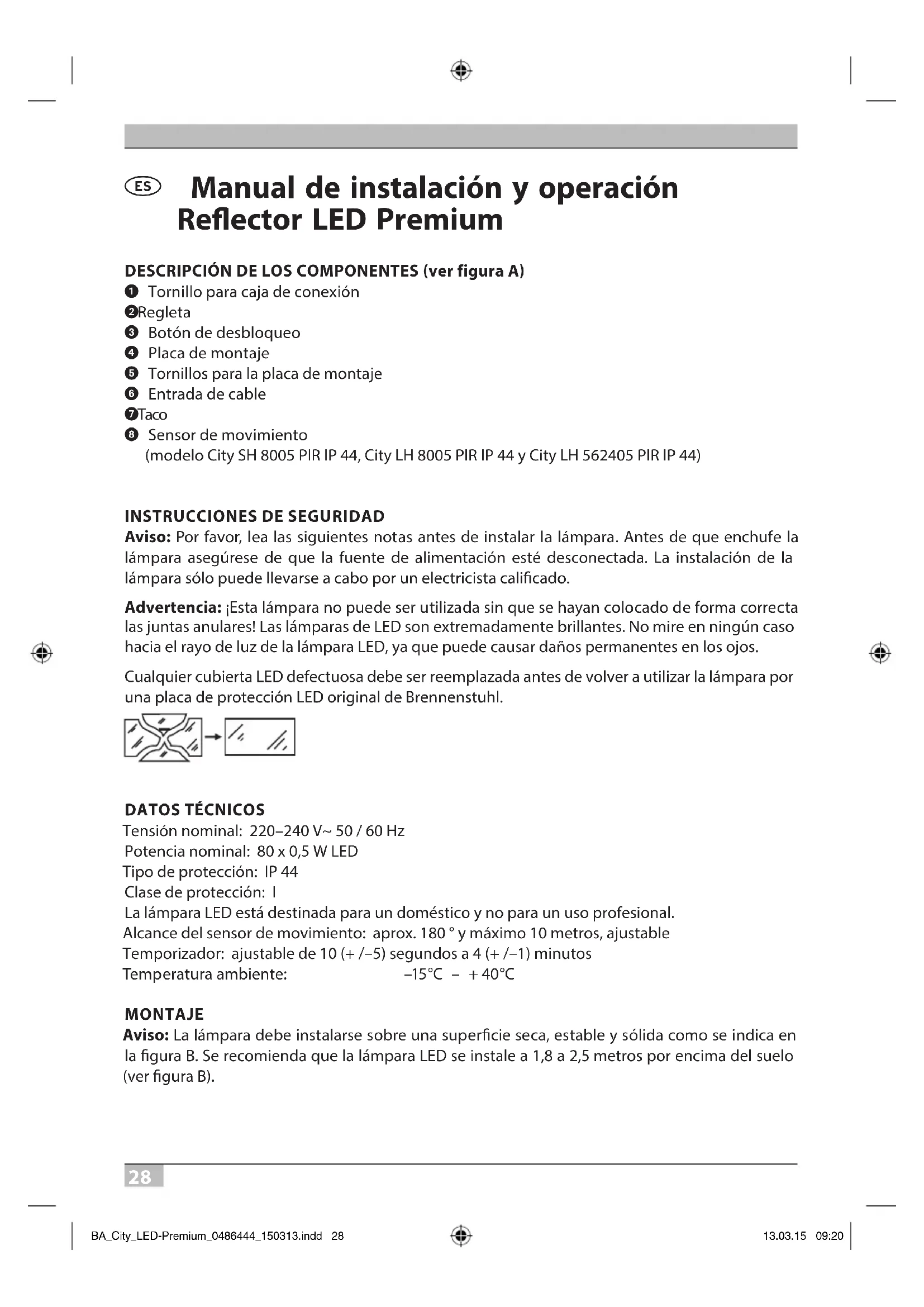 Tensión nominal: 220–240V~ 50 / 60Hz Potencia nominal: 80 x 0,5W LED Tipo de protección: IP 44 Clase de protección: I La lámpara LED está destinada para un doméstico y no para un uso profesional. Alcance del sensor de movimiento: aprox. 180 ° y máximo 10metros, ajustable Temporizador: ajustable de 10 (+ /–5) segundos a 4 (+ /–1) minutos Temp eratura ambiente: –15 °C – + 40 °C MONTAJE Aviso: La lámpara debe instalarse sobre una supercie seca, estable y sólida como se indica en la gura B. Se recomienda que la lámpara LED se instale a 1,8 a 2,5metros por encima del suelo (ver gura B). BA_City_LED-Premium_0486444_150313.indd 28 13.03.15 09:2029