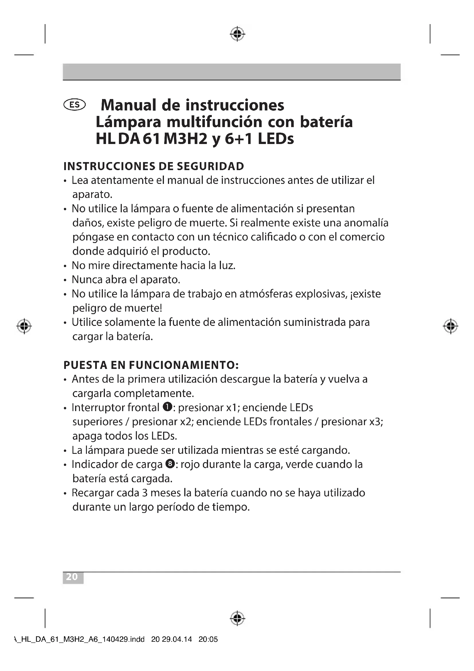 Manual de instrucciones Lámpara multifunción con batería HL DA 61 M3H2 y 6+1 LEDs