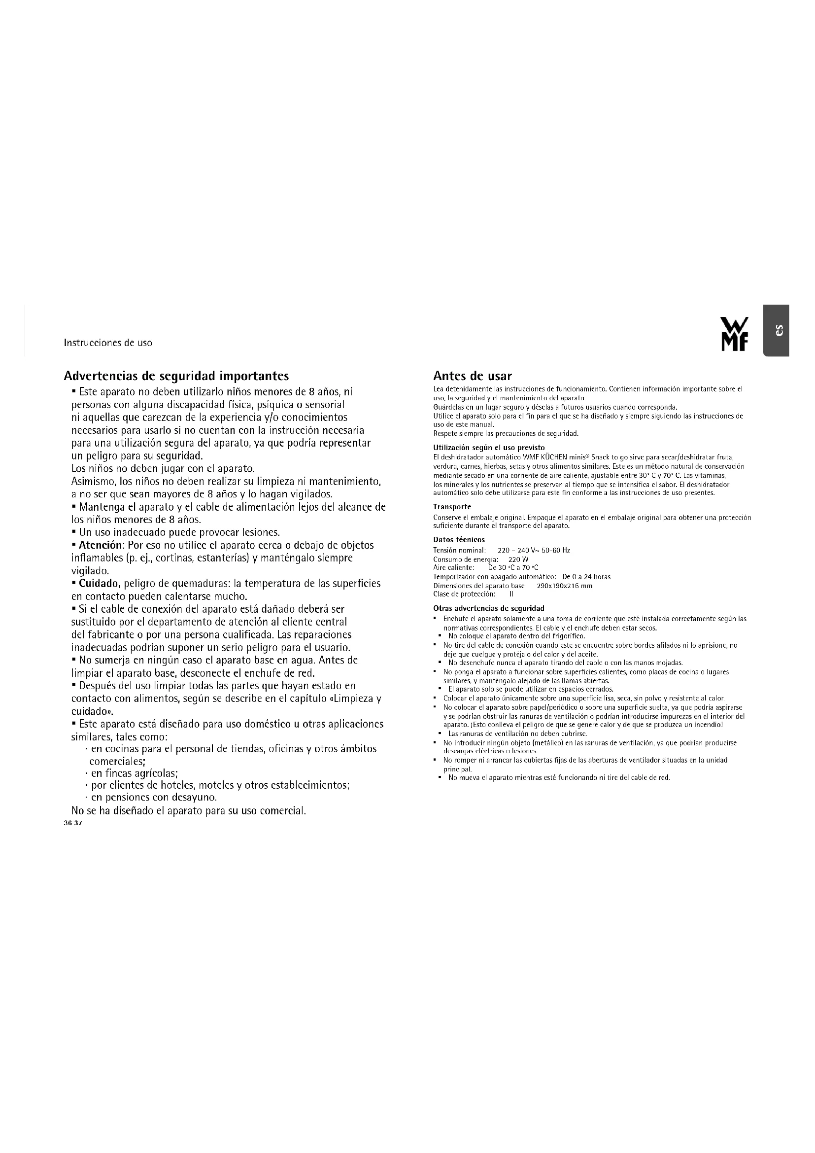 - Este aparato está diseñado para uso doméstico u otras aplicaciones similares, tales como: ⋅ en cocinas para el personal de tiendas, oficinas y otros ámbitos comerciales; ⋅ en fincas agrícolas; ⋅ por clientes de hoteles, moteles y otros establecimientos; ⋅ en pensiones con desayuno. No se ha diseñado el aparato para su uso comercial. Antes de usar Lea detenidamente las instrucciones de funcionamiento. Contienen información importante sobre el uso, la seguridad y el mantenimiento del aparato. Guárdelas en un lugar seguro y déselas a futuros usuarios cuando corresponda. Utilice el aparato solo para el fin para el que se ha diseñado y siempre siguiendo las instrucciones de uso de este manual. Respete siempre las precauciones de seguridad. Utilización según el uso previsto El deshidratador automático WMF KÜCHEN minis® Snack to go sirve para secar/deshidratar fruta, verdura, carnes, hierbas, setas y otros alimentos similares. Este es un método natural de conservación mediante secado en una corriente de aire caliente, ajustable entre 30° C y 70° C. Las vitaminas, los minerales y los nutrientes se preservan al tiempo que se intensifica el sabor. El deshidratador automático solo debe utilizarse para este fin conforme a las instrucciones de uso presentes. Transporte Conserve el embalaje original. Empaque el aparato en el embalaje original para obtener una protección suficiente durante el transporte del aparato. Datos técnicos Tensión nominal: 220 – 240 V~ 50-60 Hz Consumo de energía: 220 W Aire caliente: De 30 ºC a 70 ºC Temporizador con apagado automático: De 0 a 24 horas Dimensiones del aparato base: 290x190x216 mm Clase de protección: II Otras advertencias de seguridad