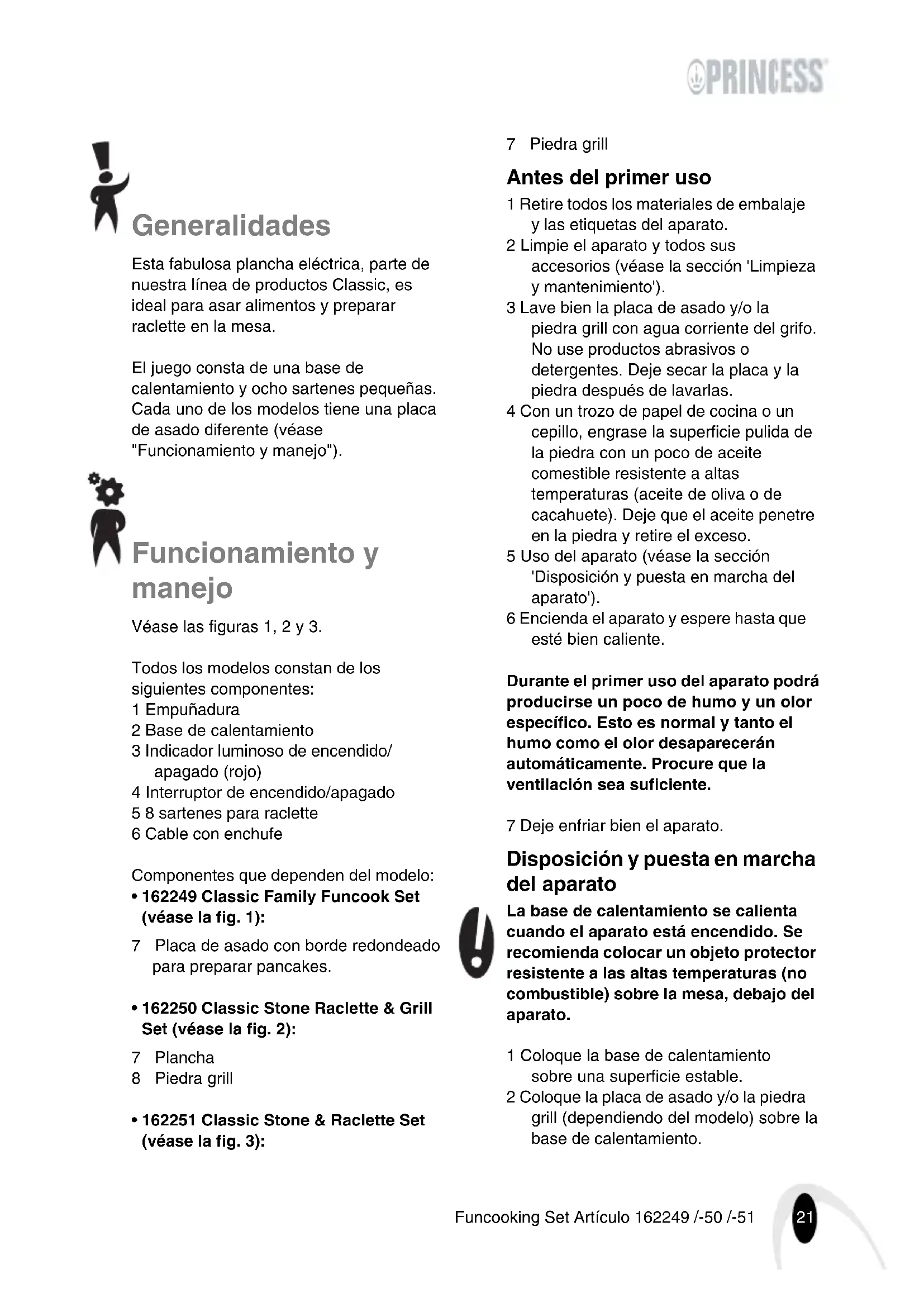 - 162251 Classic Stone & Raclette Set (véase la fig. 3): 7 Piedra grill Antes del primer uso 1 Retire todos los materiales de embalaje y las etiquetas del aparato. 2 Limpie el aparato y todos sus accesorios (véase la sección 'Limpieza y mantenimiento'). 3 Lave bien la placa de asado y/o la piedra grill con agua corriente del grifo. No use productos abrasivos o detergentes. Deje secar la placa y la piedra después de lavarlas. 4 Con un trozo de papel de cocina o un cepillo, engrase la superficie pulida de la piedra con un poco de aceite comestible resistente a altas temperaturas (aceite de oliva o de cacahuete). Deje que el aceite penetre en la piedra y retire el exceso. 5 Uso del aparato (véase la sección 'Disposición y puesta en marcha del aparato'). 6 Encienda el aparato y espere hasta que esté bien caliente. Durante el primer uso del aparato podrá producirse un poco de humo y un olor específico. Esto es normal y tanto el humo como el olor desaparecerán automáticamente. Procure que la ventilación sea suficiente. 7 Deje enfriar bien el aparato. Disposición y puesta en marcha del aparato La base de calentamiento se calienta cuando el aparato está encendido. Se recomienda colocar un objeto protector resistente a las altas temperaturas (no combustible) sobre la mesa, debajo del aparato. 1 Coloque la base de calentamiento sobre una superficie estable. 2 Coloque la placa de asado y/o la piedra grill (dependiendo del modelo) sobre la base de calentamiento.22 Funcooking Set Artículo 162249 /-50 /-51 3 Introduzca el enchufe en la toma de corriente. 4 Gire el botón de encendido/apagado hacia la derecha para encender el aparato. El indicador luminoso se enciende. Transcurridos 20 minutos aproximadamente la plancha estará a temperatura.