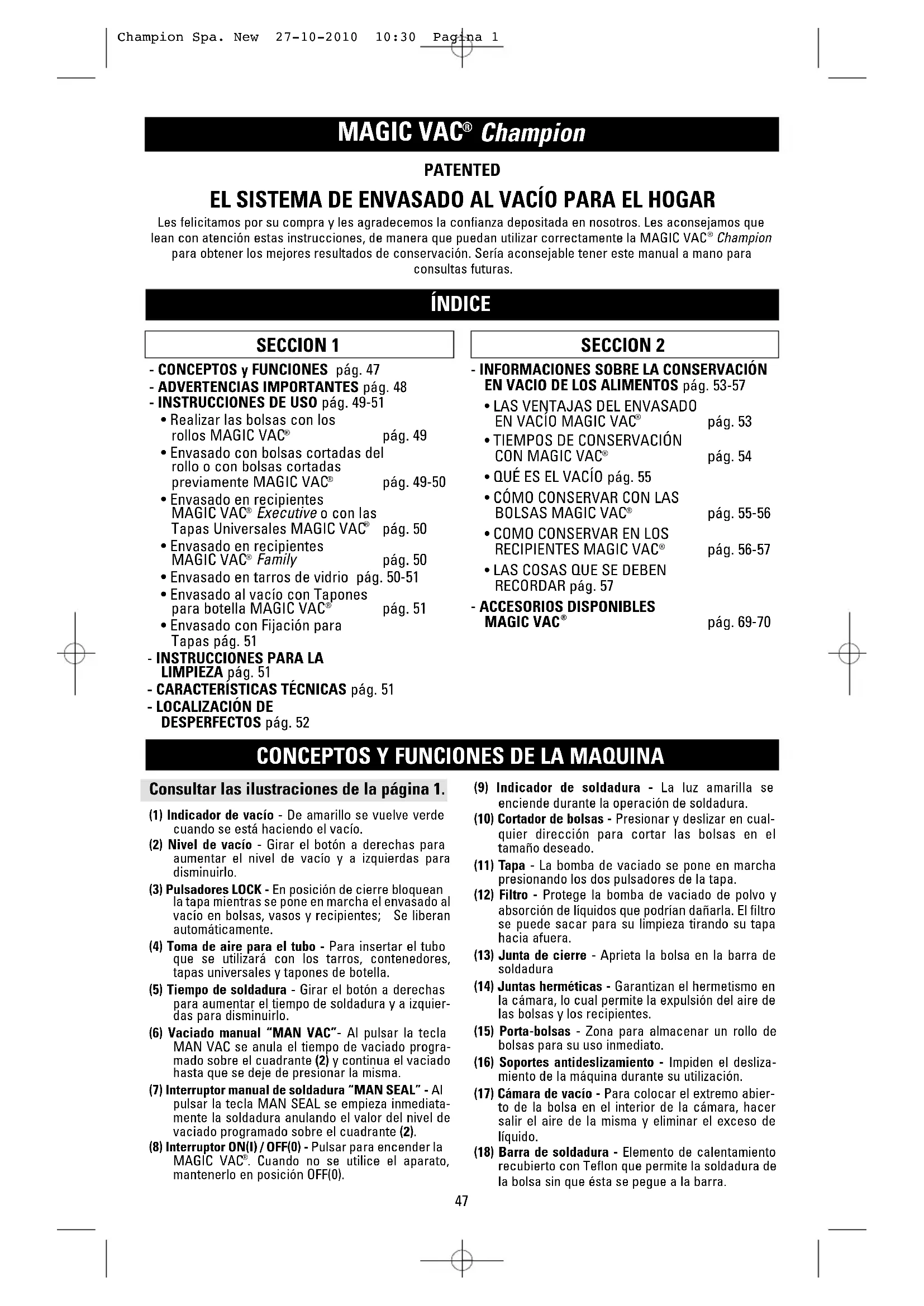 (1) Indicador de vacío - De amarillo se vuelve verdecuando se está haciendo el vacío.(2) Nivel de vacío - Girar el botón a derechas paraaumentar el nivel de vacío y a izquierdas paradisminuirlo.(3) Pulsadores LOCK - En posición de cierre bloqueanla tapa mientras se pone en marcha el envasado alvacío en bolsas, vasos y recipientes; Se liberanautomáticamente.(4) Toma de aire para el tubo - Para insertar el tuboque se utilizará con los tarros, contenedores,tapas universales y tapones de botella.(5) Tiempo de soldadura - Girar el botón a derechaspara aumentar el tiempo de soldadura y a izquier-das para disminuirlo.(6) Vaciado manual “MAN VAC”- Al pulsar la teclaMAN VAC se anula el tiempo de vaciado progra- mado sobre el cuadrante (2) y continua el vaciado hasta que se deje de presionar la misma.(7) Interruptor manual de soldadura “MAN SEAL” - Alpulsar la tecla MAN SEAL se empieza inmediata-mente la soldadura anulando el valor del nivel devaciado programado sobre el cuadrante (2).(8) Interruptor ON(I) / OFF(0) - Pulsar para encender laMAGIC VAC . Cuando no se utilice el aparato,mantenerlo en posición OFF(0). Consultar las ilustraciones de la página 1. (9) Indicador de soldadura - La luz amarilla seenciende durante la operación de soldadura. (10) Cortador de bolsas - Presionar y deslizar en cual-quier dirección para cortar las bolsas en eltamaño deseado. (11) Tapa - La bomba de vaciado se pone en marcha presionando los dos pulsadores de la tapa. (12) Filtro - Protege la bomba de vaciado de polvo y absorción de líquidos que podrían dañarla. El filtrose puede sacar para su limpieza tirando su tapahacia afuera. (13) Junta de cierre - Aprieta la bolsa en la barra de soldadura(14) Juntas herméticas - Garantizan el hermetismo enla cámara, lo cual permite la expulsión del aire delas bolsas y los recipientes.(15) Porta-bolsas - Zona para almacenar un rollo debolsas para su uso inmediato.(16) Soportes antideslizamiento - Impiden el desliza-miento de la máquina durante su utilización.(17) Cámara de vacío - Para colocar el extremo abier-to de la bolsa en el interior de la cámara, hacersalir el aire de la misma y eliminar el exceso delíquido. (18) Barra de soldadura - Elemento de calentamiento recubierto con Teflon que permite la soldadura dela bolsa sin que ésta se pegue a la barra. PATENTED ÍNDICE - CONCEPTOS y FUNCIONES pág. 47- ADVERTENCIAS IMPORTANTES pág. 48- INSTRUCCIONES DE USO pág. 49-51• Realizar las bolsas con los rollos MAGIC VAC pág. 49• Envasado con bolsas cortadas del rollo o con bolsas cortadas previamente MAGIC VAC pág. 49-50 • Envasado en recipientes MAGIC VAC
