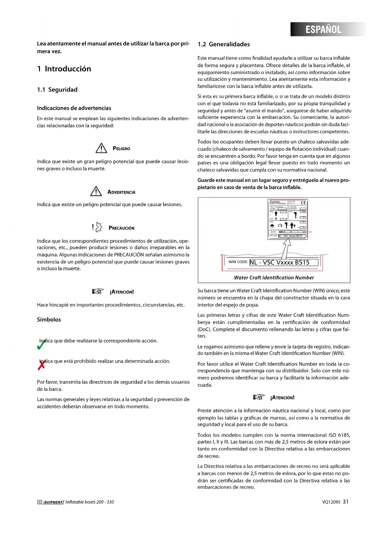 Indicaciones de advertencias En este manual se emplean las siguientes indicaciones de adverten- cias relacionadas con la seguridad: peLiGro Indica que existe un gran peligro potencial que puede causar lesio- nes graves o incluso la muerte. aDvertencia Indica que existe un peligro potencial que puede causar lesiones. precaución Indica que los correspondientes procedimientos de utilización, ope- raciones, etc., pueden producir lesiones o daños irreparables en la máquina. Algunas indicaciones de PRECAUCIÓN señalan asimismo la existencia de un peligro potencial que puede causar lesiones graves o incluso la muerte. ¡atención! Hace hincapié en importantes procedimientos, circunstancias, etc. Símbolos Indica que debe realizarse la correspondiente acción. Indica que está prohibido realizar una determinada acción. Por favor, transmita las directrices de seguridad a los demás usuarios de la barca. Las normas generales y leyes relativas a la seguridad y prevención de accidentes deberán observarse en todo momento. Su barca tiene un Water Craft Identication Number (WIN) único; este número se encuentra en la chapa del constructor situada en la cara interior del espejo de popa. Las primeras letras y cifras de este Water Craft Identication Num- berya están cumplimentadas en la certicación de conformidad (DoC). Complete el documento rellenando las letras y cifras que fal- ten. Le rogamos asimismo que rellene y envíe la tarjeta de registro, indican- do también en la misma el Water Craft Identication Number (WIN). Por favor utilice el Water Craft Identication Number en toda la co- rrespondencia que mantenga con su distribuidor. Solo con este nú- mero podremos identicar su barca y facilitarle la información ade- cuada. ¡atención! Preste atención a la información náutica nacional y local, como por ejemplo las tablas y grácas de mareas, así como a la normativa de seguridad y local para el uso de su barca. Todos los modelos cumplen con la norma internacional ISO 6185, partes I, II y III. Las barcas con más de 2,5 metros de eslora están por tanto en conformidad con la Directiva relativa a las embarcaciones de recreo. La Directiva relativa a las embarcaciones de recreo no será aplicable a barcas con menos de 2,5 metros de eslora, por lo que estas no po- drán ser certicadas de conformidad con la Directiva relativa a las embarcaciones de recreo.