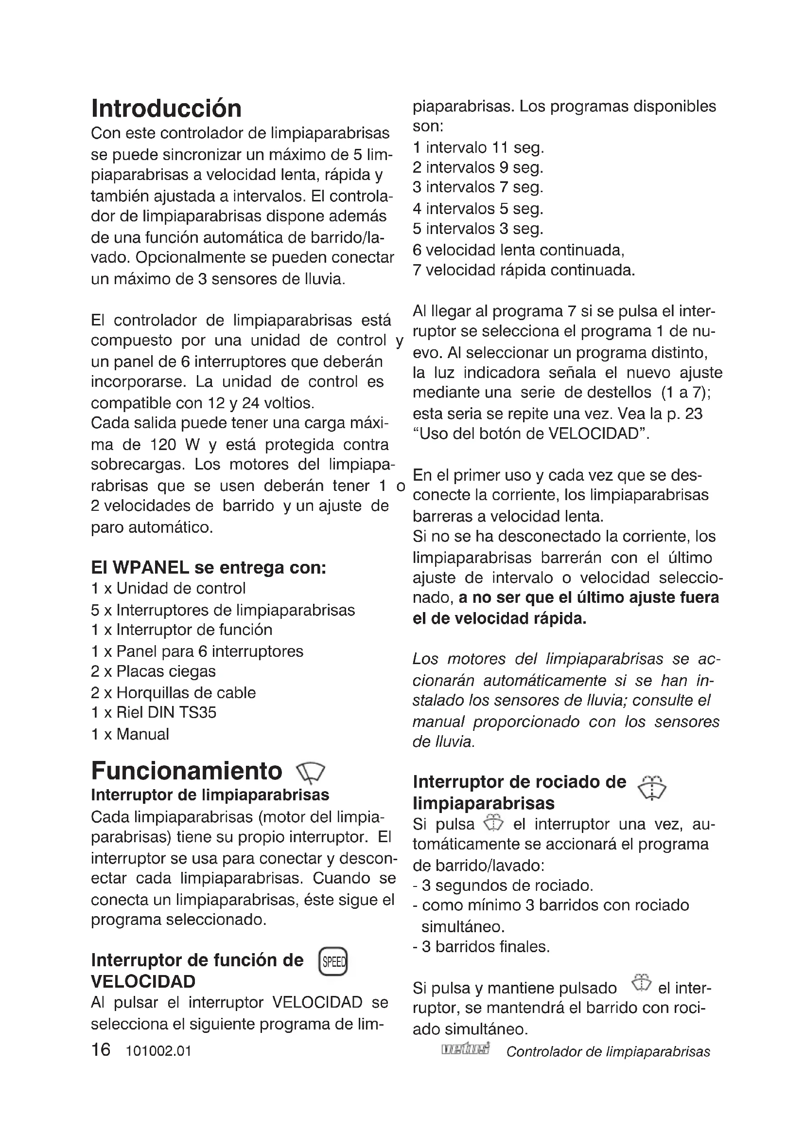 FRANÇAIS16 101002.01 Controlador de limpiaparabrisas Introducción Con este controlador de limpiaparabrisas se puede sincronizar un máximo de 5 lim- piaparabrisas a velocidad lenta, rápida y también ajustada a intervalos. El controla- dor de limpiaparabrisas dispone además de una función automática de barrido/la- vado. Opcionalmente se pueden conectar un máximo de 3 sensores de lluvia. El controlador de limpiaparabrisas está compuesto por una unidad de control y un panel de 6 interruptores que deberán incorporarse. La unidad de control es compatible con 12 y 24 voltios. Cada salida puede tener una carga máxi- ma de 120 W y está protegida contra sobrecargas. Los motores del limpiapa- rabrisas que se usen deberán tener 1 o 2 velocidades de barrido y un ajuste de paro automático. El WPANEL se entrega con: 1 x Unidad de control 5 x Interruptores de limpiaparabrisas 1 x Interruptor de función 1 x Panel para 6 interruptores 2 x Placas ciegas 2 x Horquillas de cable 1 x Riel DIN TS35 1 x Manual Funcionamiento Interruptor de limpiaparabrisas Cada limpiaparabrisas (motor del limpia- parabrisas) tiene su propio interruptor. El interruptor se usa para conectar y descon- ectar cada limpiaparabrisas. Cuando se conecta un limpiaparabrisas, éste sigue el programa seleccionado. Interruptor de función de VELOCIDAD Al pulsar el interruptor VELOCIDAD se selecciona el siguiente programa de lim- piaparabrisas. Los programas disponibles son: 1 intervalo 11 seg. 2 intervalos 9 seg. 3 intervalos 7 seg. 4 intervalos 5 seg. 5 intervalos 3 seg. 6 velocidad lenta continuada, 7 velocidad rápida continuada. Al llegar al programa 7 si se pulsa el inter- ruptor se selecciona el programa 1 de nu- evo. Al seleccionar un programa distinto, la luz indicadora señala el nuevo ajuste mediante una serie de destellos (1 a 7); esta seria se repite una vez. Vea la p. 23 “Uso del botón de VELOCIDAD”. En el primer uso y cada vez que se des- conecte la corriente, los limpiaparabrisas barreras a velocidad lenta. Si no se ha desconectado la corriente, los limpiaparabrisas barrerán con el último ajuste de intervalo o velocidad seleccio- nado, a no ser que el último ajuste fuera el de velocidad rápida. Los motores del limpiaparabrisas se ac- cionarán automáticamente si se han in- stalado los sensores de lluvia; consulte el manual proporcionado con los sensores de lluvia. Interruptor de rociado de limpiaparabrisas Si pulsa el interruptor una vez, au- tomáticamente se accionará el programa de barrido/lavado: - 3 segundos de rociado. - como mínimo 3 barridos con rociado simultáneo. - 3 barridos finales. Si pulsa y mantiene pulsado el inter- ruptor, se mantendrá el barrido con roci- ado simultáneo. SPEED101002.01 17 Controlador de limpiaparabrisas Barrerán todos los limpiaparabrisas, independientemente de la posición del interruptor del limpiaparabrisas. Luz de estado VELOCIDAD La luz de estado del interruptor de función indica el estado del controla- dor de limpiaparabrisas. On (encendido): el controlador de limpia- parabrisas está conectado, Off (apagado): el controlador de limpiapa- rabrisas está desconectado, Parpadeo rápido: la corriente es demasi- ado baja o hay un fallo interno, Dos series de parpadeos: indicación del programa seleccionado. Esto se muestra al conectar el controlador de limpiapara- brisas y luego ajustar un programa distinto. LED de estado El LED de estado de la unidad de control (entre los terminales + y - de la batería) muestra el estado del controlador de limpiaparabrisas: - Verde: el controlador de limpiapara- brisas está conectado, - Verde parpadeante: la corriente es demasiado baja, - Rojo: fallo interno, - Off (apagado): el controlador de limpia parabrisas no está conectado. Instalación Unidad de control Monte la unidad de control lo más cerca posible de los motores del limpiapara- brisas. De este modo los cables hacia los motores serán cortos. Monte la unidad de control en un riel DIN TS35 (vea la p. 27). Interruptores Coloque los interruptores donde el usu- ario pueda usarlos fácilmente. Instale el interruptor de función y un (1) interruptor de encendido-apagado para cada motor de limpiaparabrisas. Los interruptores son impermeables y llevan junta. Los interruptores se pueden colocar di- rectamente en un panel de instrumentos, o usar el panel proporcionado. Si no se usan todos los interruptores del panel pro- porcionado, los orificios se pueden tapar con las placas ciegas proporcionadas. Los paneles incorporados no disponen de junta. Con ayuda de la plantilla sumi- nistrada, realice un orificio en el panel de instrumentos. Conexiones Vea el croquis de conexiones en la p. 24. Corriente La unidad de control es compatible con CC de 12 y 24 voltios. La corriente adecuada para los motores del limpiaparabrisas debe corresponderse con la cor- riente de a bordo (12 o 24 V). El cable positivo de la unidad de control debe incluir un fusible principal y un in- terruptor. Use un fusible más pequeño en caso necesario, adecuado a la corriente total de los 5 motores de los limpiapara- brisas. Use cables de conexión con un diámetro suficiente. Vea en el croquis de conexiones el diámetro mínimo recomendado para el cable. Conecte la corriente a las horquillas de cable suministradas (ø 5 mm). ESPAÑOL SPEED DNG DNG DNGDNGDNG