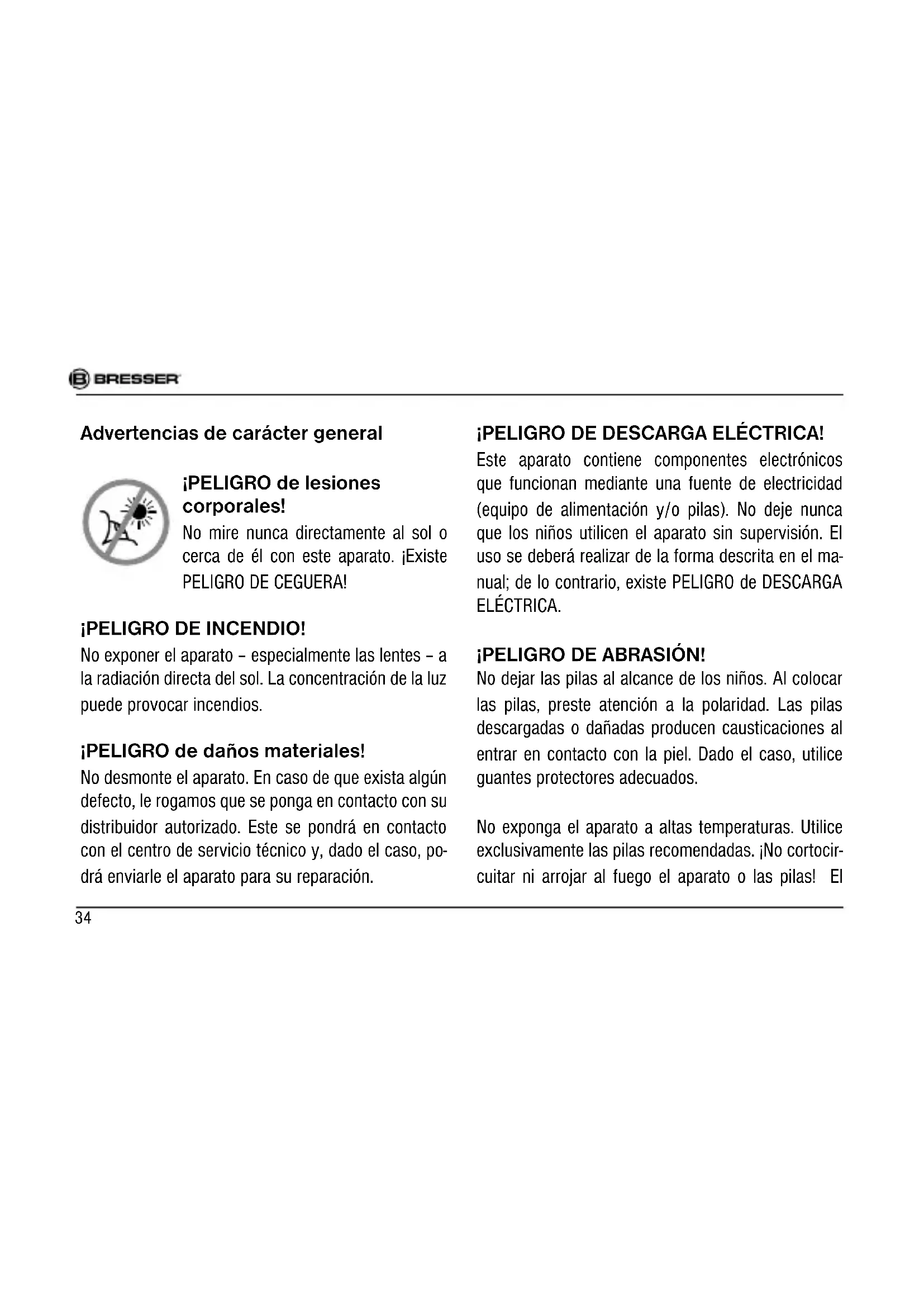 La durata regolare della garanzia è di 2 anni e decorre dalla data dell’acquisto. Per godere di un’estensione volontaria della garanzia come descritto sulla confezione regalo, è necessario registrarsi nel nostro sito Web. Le condizioni complete di garanzia e le informazioni sull’estensione di garanzia e i servizi di assistenza sono visibili al sito www.bresser.de/warranty_terms.34 Advertencias de carácter general ¡PELIGRO de lesiones corporales! No mire nunca directamente al sol o cerca de él con este aparato. ¡Existe PELIGRO DE CEGUERA! ¡PELIGRO DE INCENDIO! No exponer el aparato – especialmente las lentes – a la radiación directa del sol. La concentración de la luz puede provocar incendios. ¡PELIGRO de daños materiales! No desmonte el aparato. En caso de que exista algún defecto, le rogamos que se ponga en contacto con su distribuidor autorizado. Este se pondrá en contacto con el centro de servicio técnico y, dado el caso, po- drá enviarle el aparato para su reparación. ¡PELIGRO DE DESCARGA ELÉCTRICA! Este aparato contiene componentes electrónicos que funcionan mediante una fuente de electricidad (equipo de alimentación y/o pilas). No deje nunca que los niños utilicen el aparato sin supervisión. El uso se deberá realizar de la forma descrita en el ma- nual; de lo contrario, existe PELIGRO de DESCARGA ELÉCTRICA. ¡PELIGRO DE ABRASIÓN! No dejar las pilas al alcance de los niños. Al colocar las pilas, preste atención a la polaridad. Las pilas descargadas o dañadas producen causticaciones al entrar en contacto con la piel. Dado el caso, utilice guantes protectores adecuados. No exponga el aparato a altas temperaturas. Utilice exclusivamente las pilas recomendadas. ¡No cortocir- cuitar ni arrojar al fuego el aparato o las pilas! ElDE