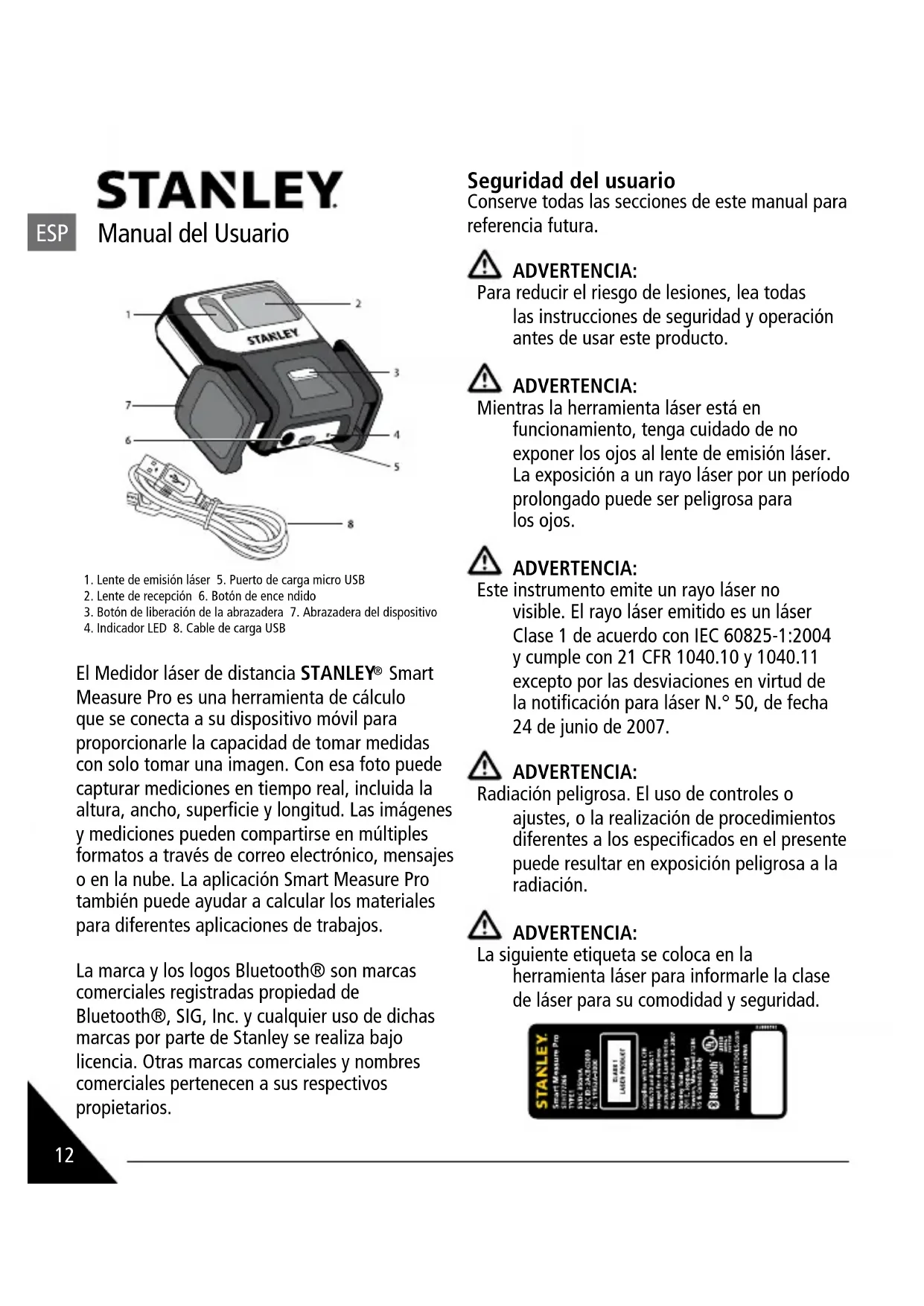 Smart Measure Pro es una herramienta de cálculo que se conecta a su dispositivo móvil para proporcionarle la capacidad de tomar medidas con solo tomar una imagen. Con esa foto puede capturar mediciones en tiempo real, incluida la altura, ancho, superficie y longitud. Las imágenes y mediciones pueden compartirse en múltiples formatos a través de correo electrónico, mensajes o en la nube. La aplicación Smart Measure Pro también puede ayudar a calcular los materiales para diferentes aplicaciones de trabajos. La marca y los logos Bluetooth® son marcas comerciales registradas propiedad de Bluetooth®, SIG, Inc. y cualquier uso de dichas marcas por parte de Stanley se realiza bajo licencia. Otras marcas comerciales y nombres comerciales pertenecen a sus respectivos propietarios. Seguridad del usuario Conserve todas las secciones de este manual para referencia futura. ADVERTENCIA: Para reducir el riesgo de lesiones, lea todas las instrucciones de seguridad y operación antes de usar este producto. ADVERTENCIA: Mientras la herramienta láser está en funcionamiento, tenga cuidado de no exponer los ojos al lente de emisión láser. La exposición a un rayo láser por un período prolongado puede ser peligrosa para los ojos. ADVERTENCIA: Este instrumento emite un rayo láser no visible. El rayo láser emitido es un láser Clase 1 de acuerdo con IEC 60825-1:2004 y cumple con 21 CFR 1040.10 y 1040.11 excepto por las desviaciones en virtud de la notificación para láser N.° 50, de fecha 24 de junio de 2007. ADVERTENCIA: Radiación peligrosa. El uso de controles o ajustes, o la realización de procedimientos diferentes a los especificados en el presente puede resultar en exposición peligrosa a la radiación. ADVERTENCIA: La siguiente etiqueta se coloca en la herramienta láser para informarle la clase de láser para su comodidad y seguridad. 1. Lente de emisión láser 5. Puerto de carga micro USB2. Lente de recepción 6. Botón de ence ndido3. Botón de liberación de la abrazadera 7. Abrazadera del dispositivo4. Indicador LED 8. Cable de carga USB13 NO retire ninguna etiqueta de advertencia de la carcasa. Este instrumento solo debe usarse para las tareas descritas en el Manual del producto. SIEMPRE asegúrese de que las personas en las cercanías del lugar de uso conozcan los peligros de mirar directamente al rayo láser. NO usar en combinación con otros instrumentos ópticos. No modifique la herramienta láser, realice ajustes ni utilice otras aplicaciones además de las que se describen en este documento. NO mire en el lente del rayo con instrumentos ópticos como lupas, binoculares o telescopios. NO mire fijamente al lente del rayo láser. NO utilice la herramienta láser si está dañada o rota. NO apunte la herramienta láser a otras personas. En la medida de lo posible, NO configure el instrumento al nivel de los ojos. SIEMPRE APAGUE la herramienta láser cuando no esté en uso. Dejar la herramienta láser ENCENDIDA aumenta el riesgo de que una persona mire fijamente al rayo láser en forma no intencional. NO utilice la herramienta láser en áreas combustibles, como ante la presencia de líquidos, gases o polvos inflamables. NO desensamble la herramienta láser. Las piezas del interior del aparato no pueden ser reparadas por el usuario. Desensamblar el láser anulará las garantías del producto. No modifique el producto de ninguna forma. Modificar la herramienta láser puede resultar en una exposición peligrosa a la radiación láser. NO use este instrumento en áreas donde exista riesgo de explosión. NO dirija el rayo láser hacia vehículos en movimiento o aviones. Seguridad de la batería NO salpique ni sumerja en agua u otros líquidos. NO guarde ni utilice en lugares en los que la temperatura pueda alcanzar o superar los