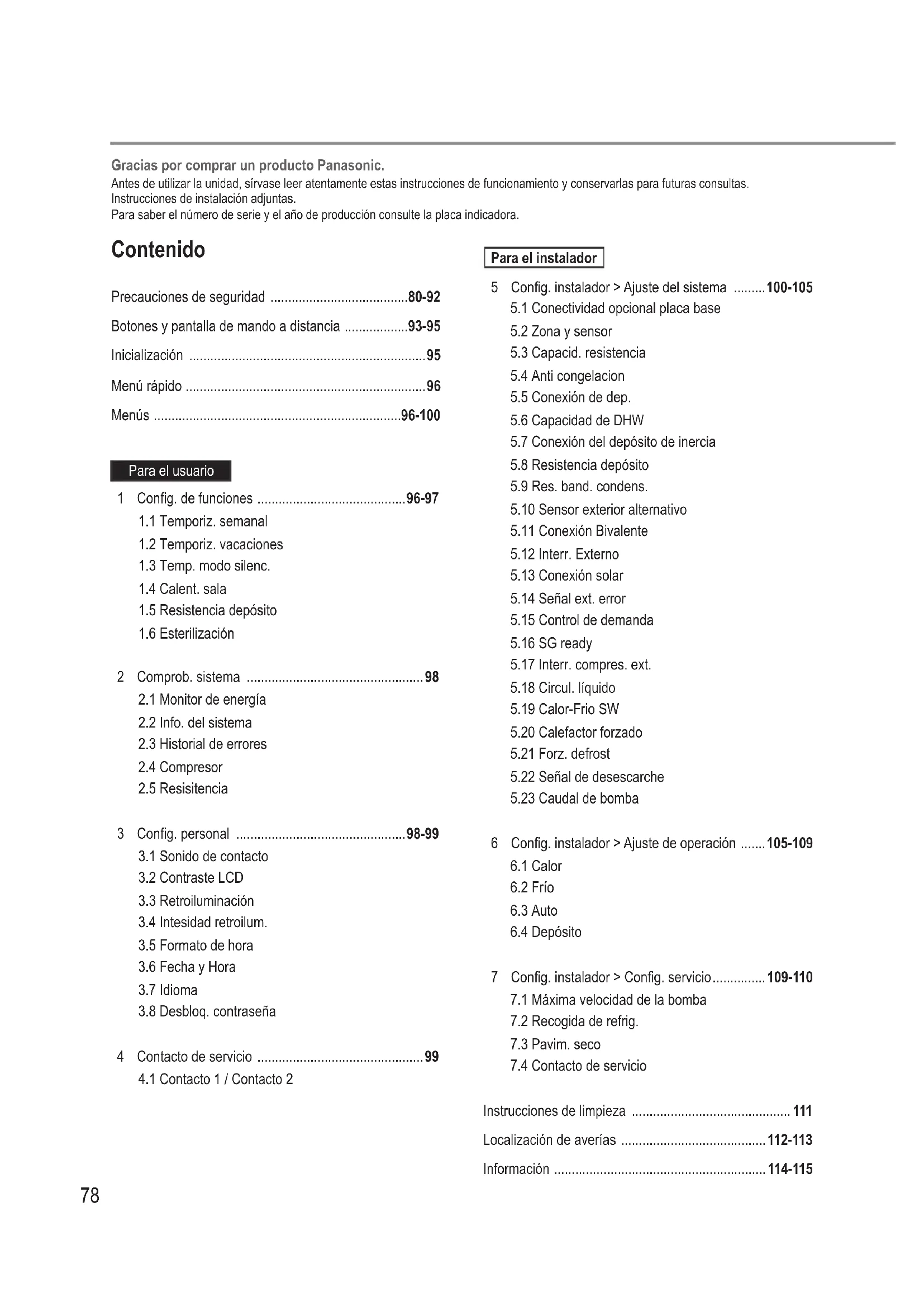 Instrucciones de limpieza ............................................. 111 Localización de averías ......................................... 112-113 Información ............................................................114-115 Gracias por comprar un producto Panasonic. Antes de utilizar la unidad, sírvase leer atentamente estas instrucciones de funcionamiento y conservarlas para futuras consultas. Instrucciones de instalación adjuntas. Para saber el número de serie y el año de producción consulte la placa indicadora.79