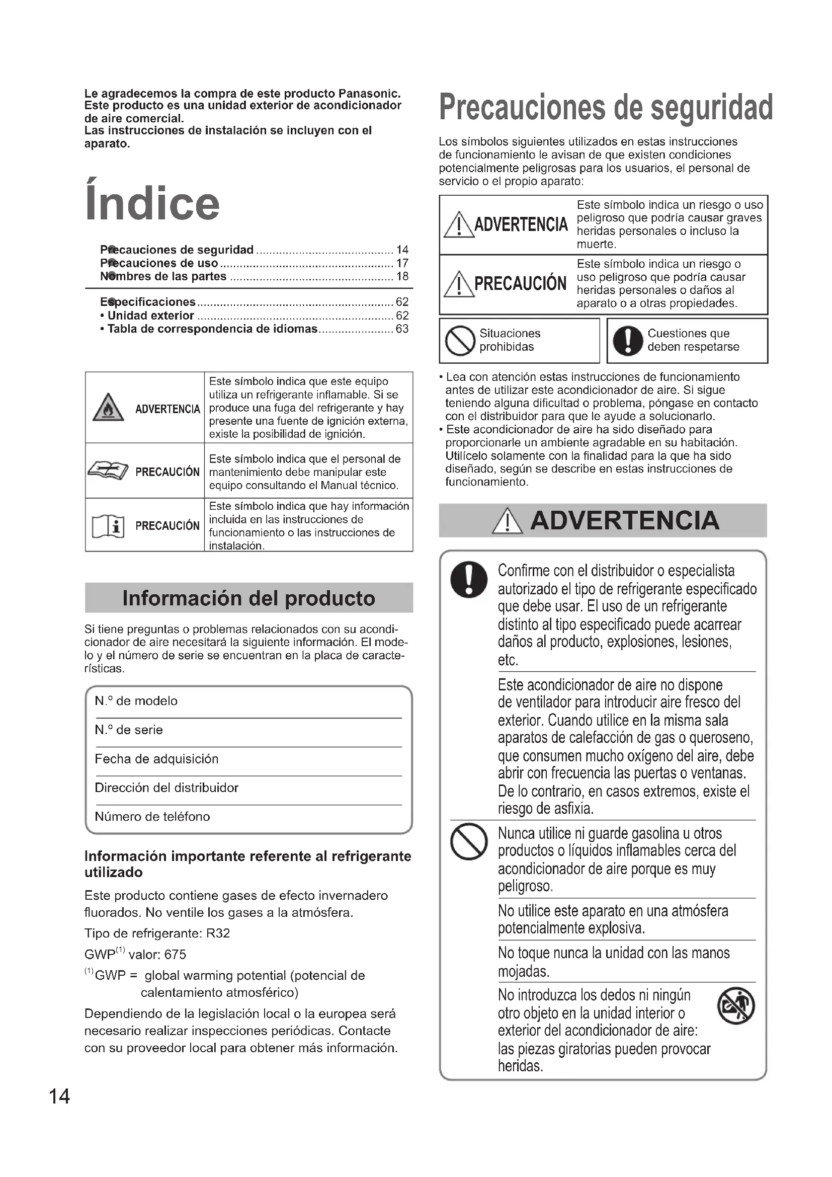 - Tabla de correspondencia de idiomas....................... 63 Índice Precauciones de seguridad Información del producto Sitienepreguntasoproblemasrelacionadosconsuacondi-cionadordeairenecesitarálasiguienteinformación.Elmode-loyelnúmerodeserieseencuentranenlaplacadecaracte-rísticas.N.ºdemodeloN.ºdeserieFechadeadquisiciónDireccióndeldistribuidorNúmerodeteléfonoConrmeconeldistribuidoroespecialistaautorizadoeltipoderefrigeranteespecicadoquedebeusar.Elusodeunrefrigerantedistintoaltipoespecicadopuedeacarreardañosalproducto,explosiones,lesiones, etc. Esteacondicionadordeairenodisponedeventiladorparaintroducirairefrescodelexterior.Cuandoutiliceenlamismasalaaparatosdecalefaccióndegasoqueroseno,queconsumenmuchooxígenodelaire,debeabrirconfrecuencialaspuertasoventanas.Delocontrario,encasosextremos,existeelriesgodeasxia.Nuncautiliceniguardegasolinauotrosproductosolíquidosinamablescercadelacondicionadordeaireporqueesmuypeligroso.Noutiliceesteaparatoenunaatmósferapotencialmenteexplosiva.Notoquenuncalaunidadconlasmanosmojadas.Nointroduzcalosdedosniningúnotroobjetoenlaunidadinterioroexteriordelacondicionadordeaire:laspiezasgiratoriaspuedenprovocarheridas.Lossímbolossiguientesutilizadosenestasinstruccionesdefuncionamientoleavisandequeexistencondicionespotencialmentepeligrosasparalosusuarios,elpersonaldeserviciooelpropioaparato: ADVERTENCIA Estesímboloindicaunriesgoousopeligrosoquepodríacausargravesheridaspersonalesoinclusolamuerte. PRECAUCIÓN Estesímboloindicaunriesgoousopeligrosoquepodríacausarheridaspersonalesodañosalaparatooaotraspropiedades. ADVERTENCIA Le agradecemos la compra de este producto Panasonic.Este producto es una unidad exterior de acondicionador de aire comercial.Las instrucciones de instalación se incluyen con el aparato.SituacionesprohibidasCuestionesquedebenrespetarse•Leaconatenciónestasinstruccionesdefuncionamientoantesdeutilizaresteacondicionadordeaire.Sisigueteniendoalgunadicultadoproblema,póngaseencontactoconeldistribuidorparaqueleayudeasolucionarlo.•Esteacondicionadordeairehasidodiseñadoparaproporcionarleunambienteagradableensuhabitación.Utilícelosolamenteconlanalidadparalaquehasidodiseñado,segúnsedescribeenestasinstruccionesdefuncionamiento.ADVERTENCIAEstesímboloindicaqueesteequipoutilizaunrefrigeranteinamable.Siseproduceunafugadelrefrigeranteyhaypresenteunafuentedeigniciónexterna,existelaposibilidaddeignición.PRECAUCIÓNEstesímboloindicaqueelpersonaldemantenimientodebemanipularesteequipoconsultandoelManualtécnico.PRECAUCIÓNEstesímboloindicaquehayinformaciónincluidaenlasinstruccionesdefuncionamientoolasinstruccionesdeinstalación.Información importante referente al refrigerante utilizadoEsteproductocontienegasesdeefectoinvernaderouorados.Noventilelosgasesalaatmósfera.Tipoderefrigerante:R32 GWP (1) valor:675 (1) GWP=globalwarmingpotential(potencialdecalentamientoatmosférico)Dependiendodelalegislaciónlocalolaeuropeaseránecesariorealizarinspeccionesperiódicas.Contacteconsuproveedorlocalparaobtenermásinformación. OI_00_310300_all.indb 14 2018/12/20 11:07:1515 ESPAÑOL ADVERTENCIA Sielrefrigeranteentraencontactocon unallamagenerarágastóxico. Pormotivosdeseguridad,asegúrese deapagarelacondicionadordeairey tambiéndedesconectarlaalimentación antesdeefectuarlimpiezaso reparaciones. Encasodeemergencia, desconecteelenchufede alimentacióndelatomade corriente,apagueeldisyuntoroapague elelementodedesconexióndela alimentaciónparaaislarelacondicionador deairedelafuentedesuministroeléctrico. Deshágasedeesteproductosegúnla legislaciónnacionalolocal. Esteproductonodebemodicarseni desmontarseenningúncaso.Launidad modicadaodesmontadapodríaprovocar unincendio,descargaseléctricaso lesiones. Losusuariosnodebenlimpiarelinterior delasunidadesinterioresyexteriores. Encarguelalimpiezaaundistribuidoro especialistaautorizado. Encasodequeesteaparatofuncione incorrectamente,nolorepareusted mismo.Póngaseencontactoconel distribuidordeventasoserviciospara solicitarunareparaciónyparadeshacerse delproducto. Noutilicecables manipulados, empalmados,prolongados odeorigendesconocido,paraevitar sobrecalentamientosyriesgodeincendios. Proporcioneunatomadecorrienteque vayaautilizarseexclusivamentepara cadaunidad,einstaleunelementode desconexióndelaalimentación,un disyuntordefugasatierra(ELCB)oun dispositivodecorrienteresidual(RCD)a mododeproteccióncontrasobrecorriente enlalíneaexclusiva. Proporcioneunatomadecorrientepara cadaunidad;yenelcableadojodeberán incorporarsemediosparaladesconexión completadelsuministroeléctricoque tenganunaseparacióndecontactoen todoslospolosenconformidadconlas normasdelcableado. Paraprevenirposiblespeligrosa causadeunfalloenelaislamiento, launidaddebeconectarseatierra. Elaparatodeberáguardarseenuna habitaciónenlaquenoexistanfuentes deigniciónencontinuofuncionamiento (porejemplo,llamasexpuestas,aparatos degasenfuncionamientoocalentadores eléctricosenfuncionamiento). Procurequelosrefrigerantesnoemitan olores. Laszonasnoventiladasenlaquese instaleunaparatoqueutilicerefrigerantes inamablessedeberáconstruirdeforma quelasfugasderefrigerante,encaso deproducirse,noseestanquenhasta elpuntoquepuedancrearunriesgode incendiooexplosión. Elaparatosedebealmacenarenuna zonabienventiladaenlaqueeltamaño delahabitacióncorrespondaalárea delahabitaciónespecicadaparael funcionamiento. Trasinstalarlaunidad,preguntesiempre alinstaladorlasuperciedesuelode lahabitaciónenlaqueestáinstalada launidadylacantidaddecargade refrigerante. Silaunidadoeldivisordelahabitación cambian,preguntesiemprealdistribuidor oalserviciodeatencióntécnica. Noutiliceningúnmétododiferentealque recomiendaelfabricanteparaacelerar elprocesodedescongelaciónnipara realizartareasdelimpieza. Noperforeniquemeelaparato. Enloscasosenlosqueseanecesario utilizarventilaciónmecánica,losoricios deventilacióndeberánestarlibresde obstrucciones. OI_00_310300_all.indb 15 2018/12/20 11:07:1616 Esteaparatoestápensadoparaser utilizadoporexpertosousuariosconla cualicaci