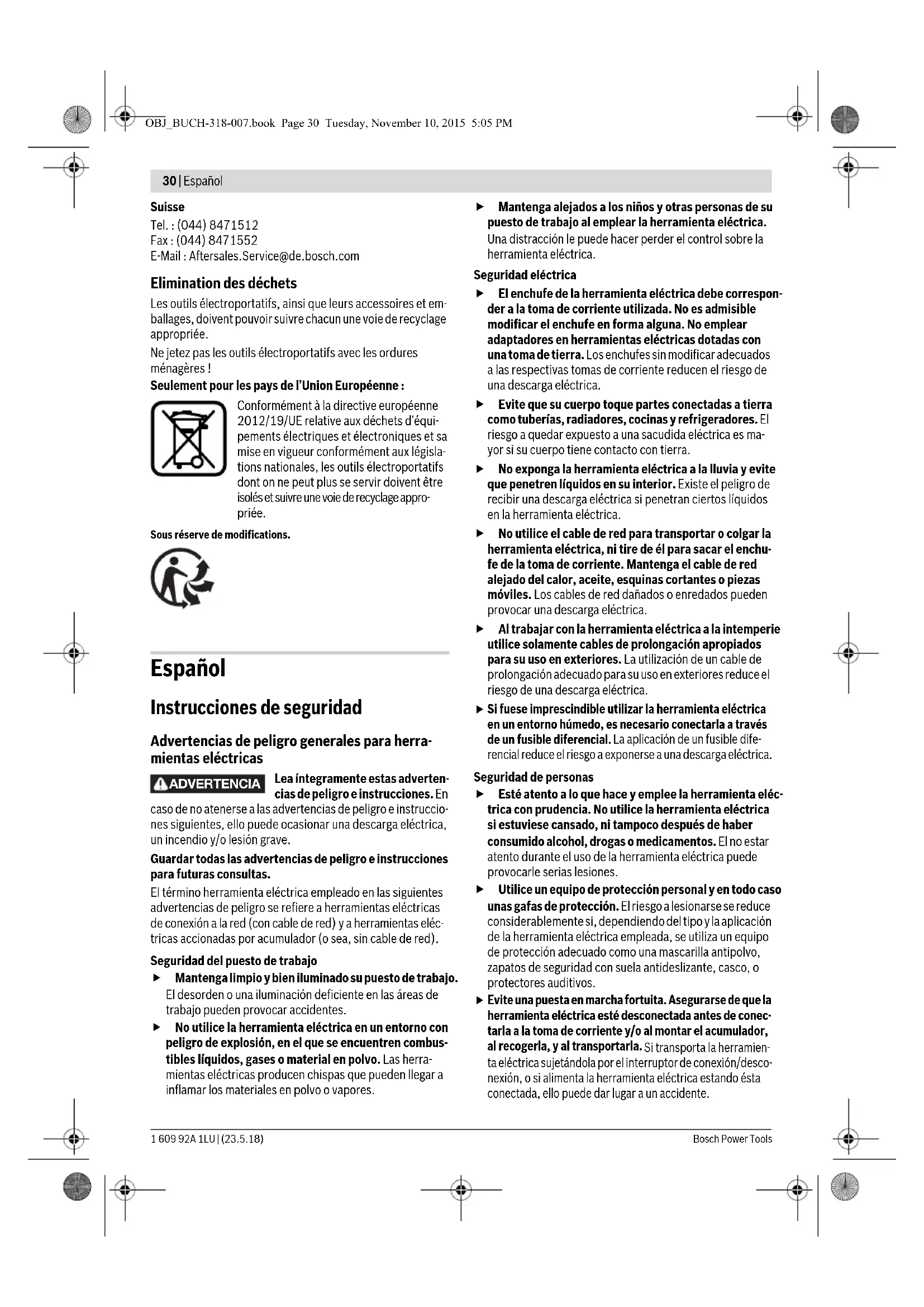 Evite una puesta en marcha fortuita. Asegurarse de que la herramienta eléctrica esté desconectada antes de conec- tarla a la toma de corriente y/o al montar el acumulador, al recogerla, y al transportarla. Si transporta la herramien- ta eléctrica sujetándola por el interruptor de conexión/desco- nexión, o si alimenta la herramienta eléctrica estando ésta conectada, ello puede dar lugar a un accidente. ADVERTENCIA OBJ_BUCH-318-007.book Page 30 Tuesday, November 10, 2015 5:05 PMEspañol | 31 Bosch Power Tools 1 609 92A 1LU | (23.5.18)