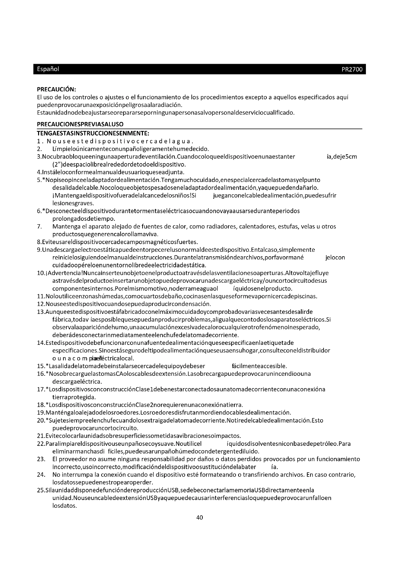 36. Nunca coloque el aparato sobre otro equipo eléctrico.