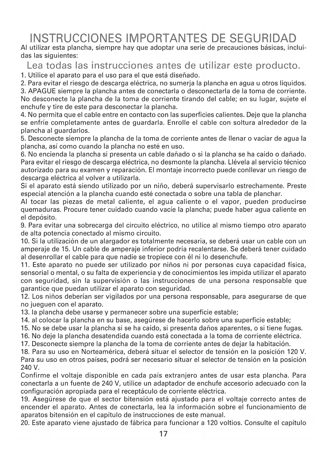 Al utilizar esta plancha, siempre hay que adoptar una serie de precauciones básicas, inclui- das las siguientes: Lea todas las instrucciones antes de utilizar este producto.