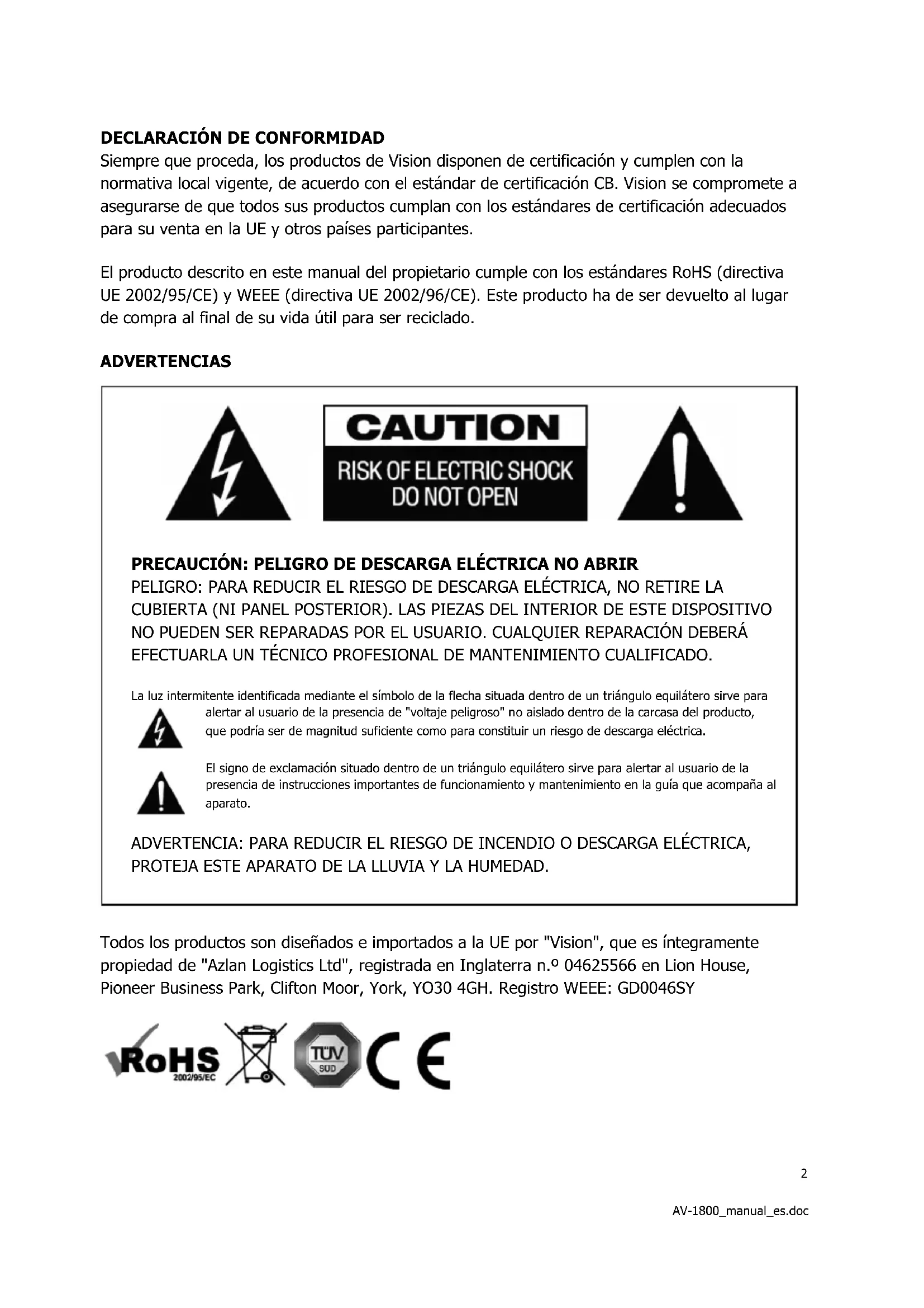 Todo los productos son diseñados e importados a la UE por "Vision", que es integralmente propiad de "Azlan Logistics Ltd", registrada en Inglaterra n.° 04625566 en Lion House, Pioneer Business Park, Clifton Moor, York, YO30 4GH. Registro WEEE: GD0046SY