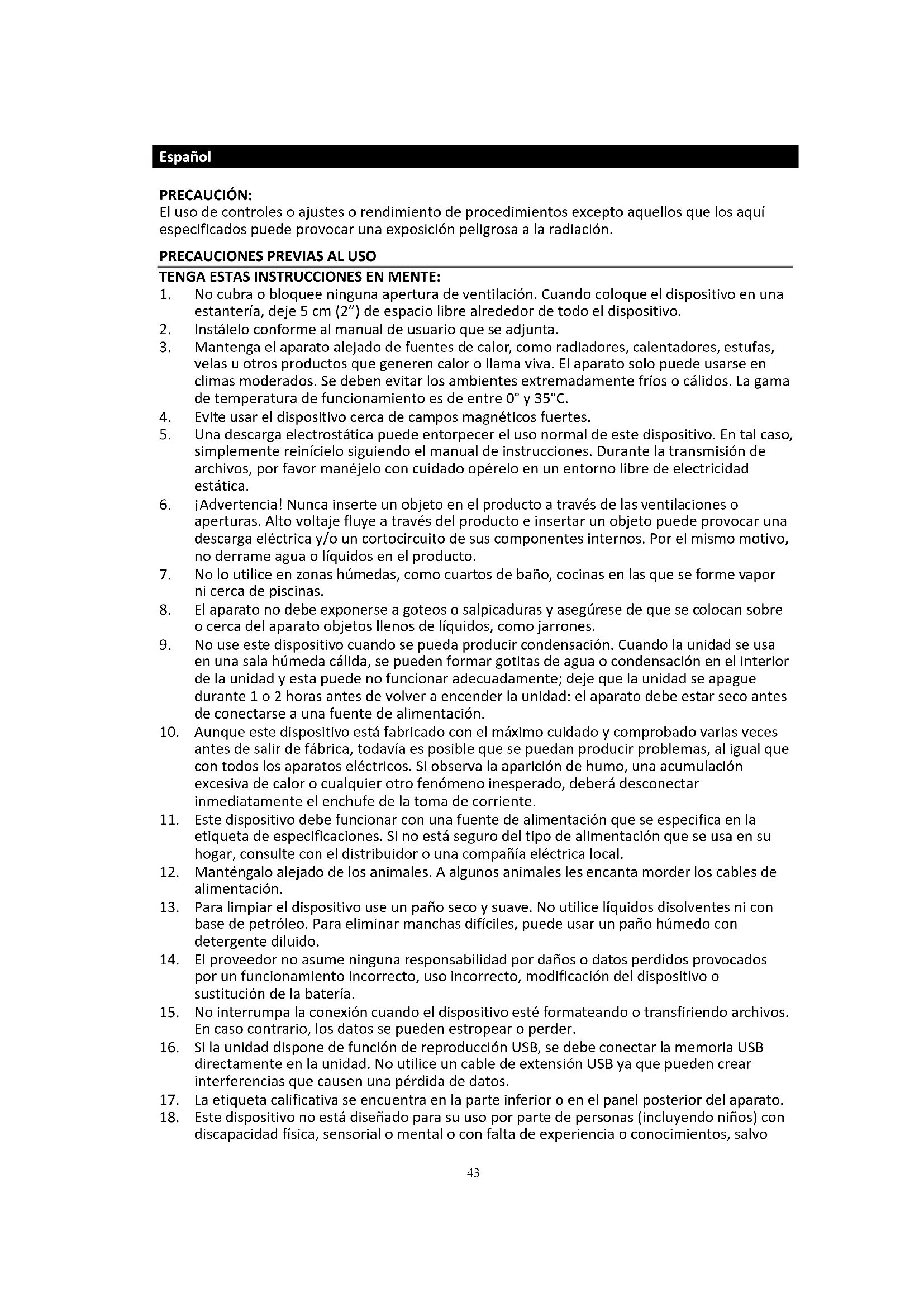 18. Este dispositivo no está diseñado para su uso por parte de personas (incluyendo niños) con