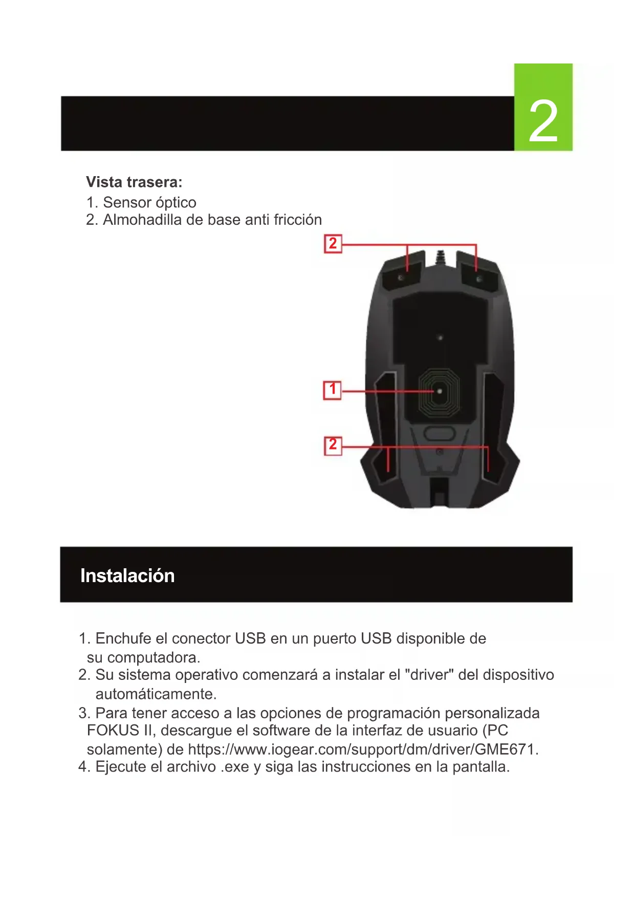 - Para tener acceso a las options de programacion personalizada FOKUS II, descargue el software de la interfaz de usuario (PC solamente) de https://www.iogear.com/support/dm/driver/GME671.