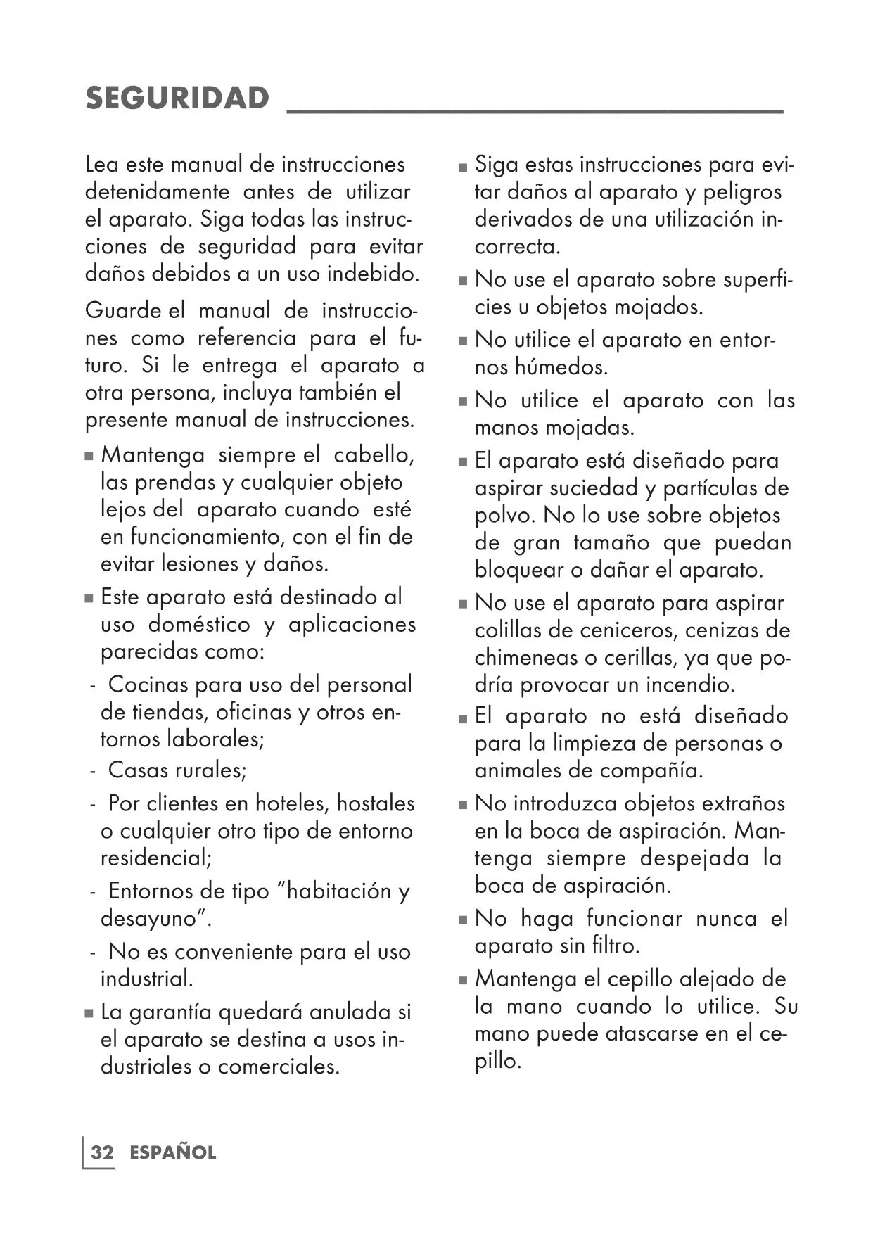 El aparato está diseñado para aspirar suciedad y partículas de polvo. No lo use sobre objetos de gran tamaño que puedan bloquear o dañar el aparato.