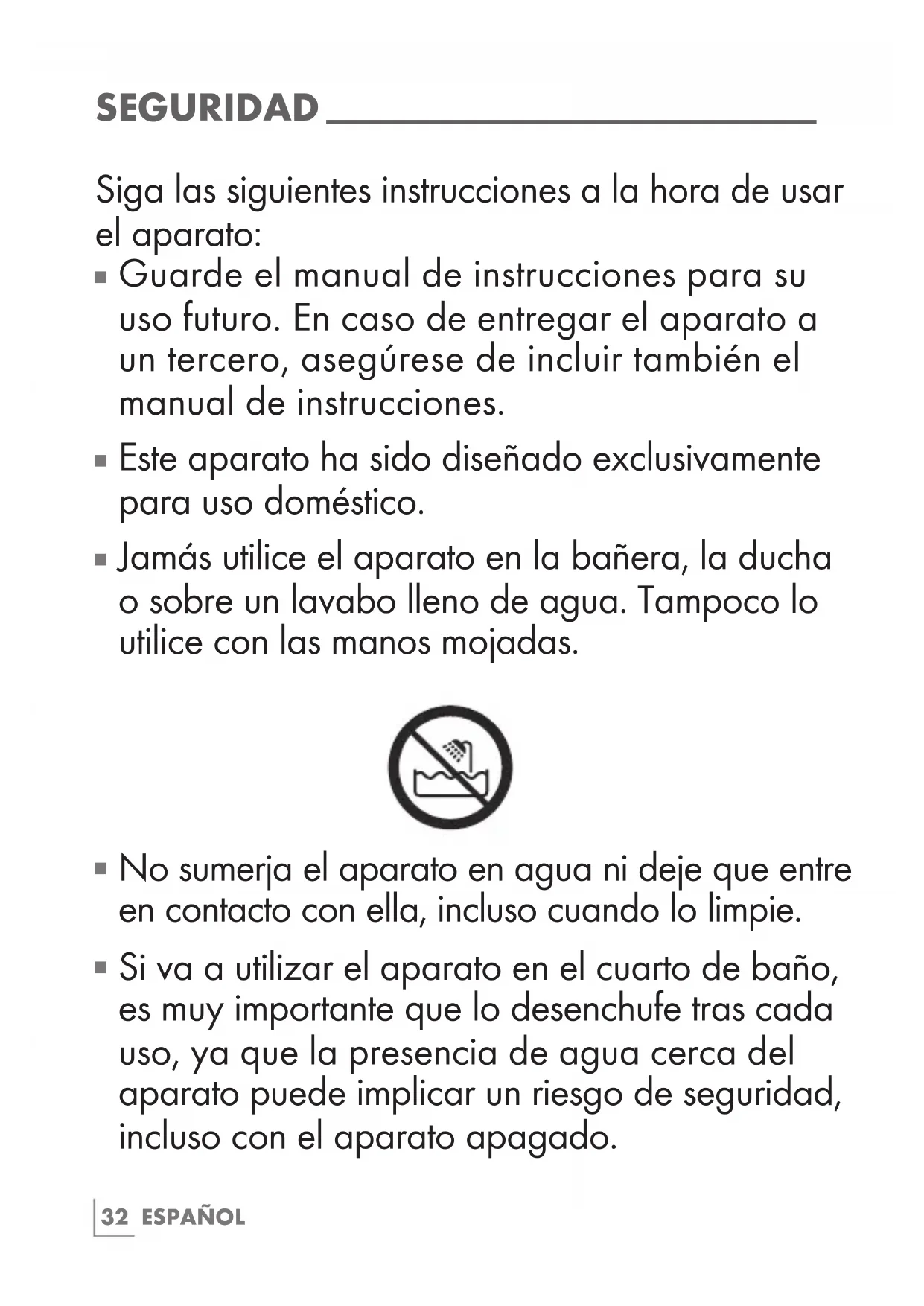 Jamás utilice el aparato en la bañera, la ducha o sobre un lavabo lleno de agua. Tampoco lo utilice con las manos mojadas.