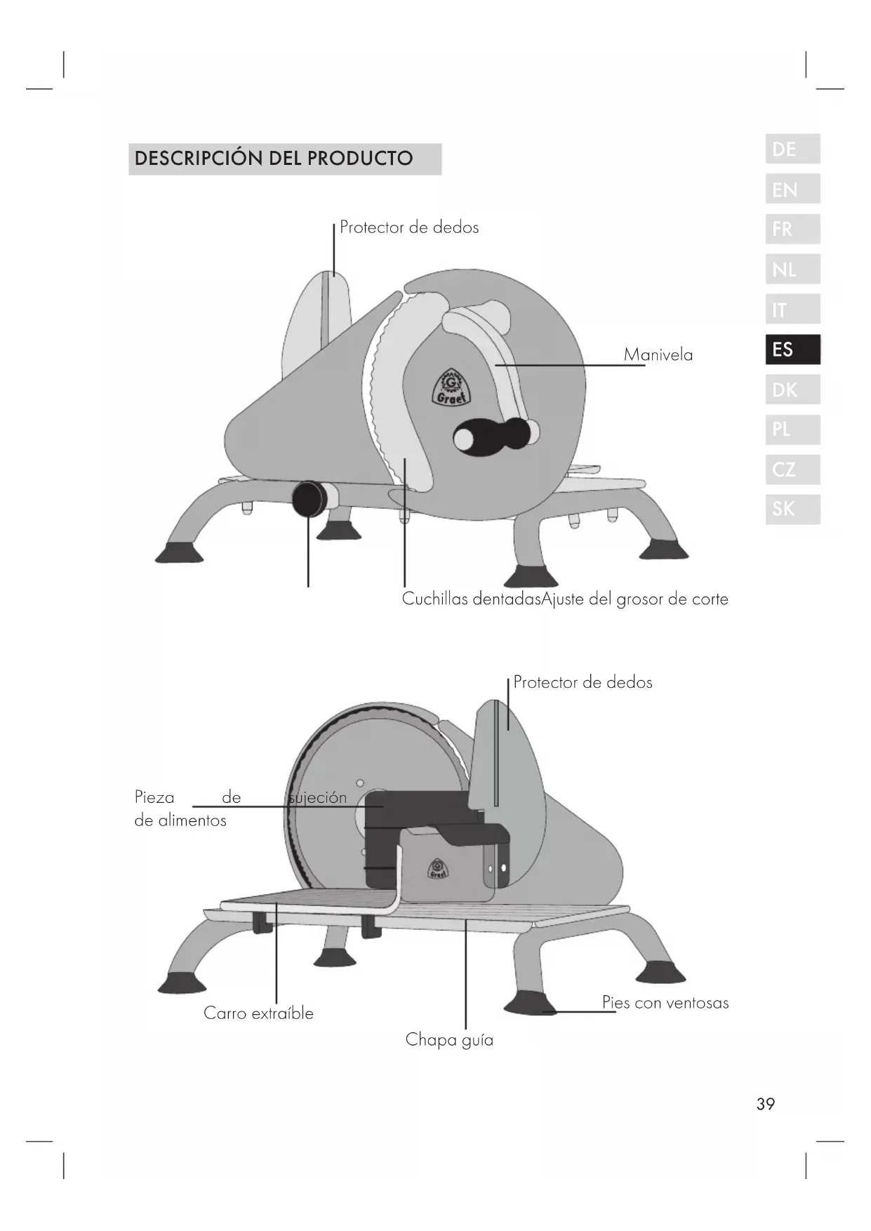 Protector de dedos Manivela Cuchillas dentadasAjuste del grosor de corte Carro extraíble Chapa guía Protector de dedos Pieza de sujeción de alimentos Pies con ventosas40 PRÓLOGO Estimado/a cliente: Ha tomado una buena decisión adquiriendo este cortador universal. Ha adquirido un producto de calidad reconocido. Le agradecemos su compra y le deseamos que disfrute con su nueva cortadora de alimentos. INFORMACIÓN ACERCA DEL PRESENTE MANUAL DE INSTRUC- CIONES Este manual de instrucciones forma parte del cortador universal manual (a partir de ahora denominado aparato) y le ofrece indicaciones importantes sobre la puesta en marcha, la seguridad, el uso correcto y el cuidado del aparato. El manual de instrucciones debe guardarse siempre a mano, cerca del aparato. Debe ser leído y utilizado por la persona encargada de: