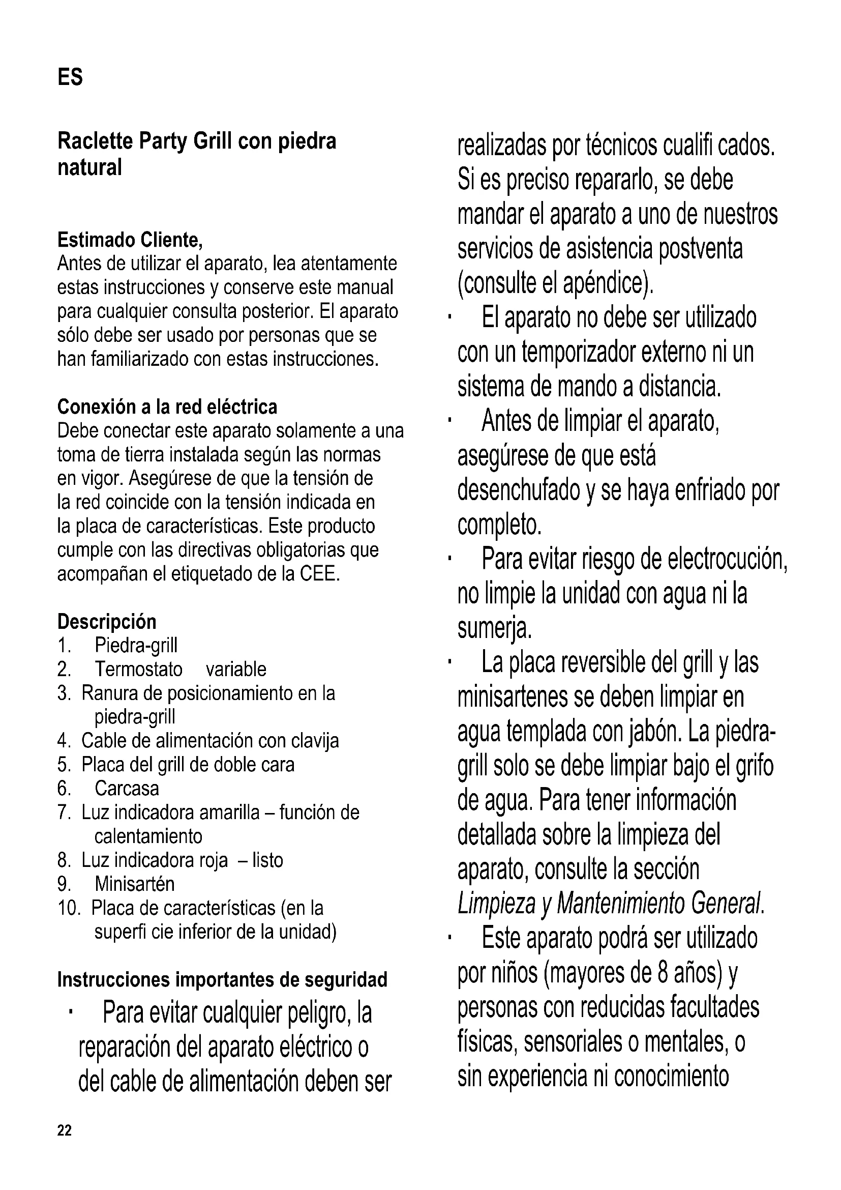 superfi cie inferior de la unidad) Instrucciones importantes de seguridad ∙ Para evitar cualquier peligro, la reparación del aparato eléctrico o del cable de alimentación deben ser realizadas por técnicos cualifi cados. Si es preciso repararlo, se debe mandar el aparato a uno de nuestros servicios de asistencia postventa (consulte el apéndice). ∙ El aparato no debe ser utilizado con un temporizador externo ni un sistema de mando a distancia. ∙ Antes de limpiar el aparato, asegúrese de que está desenchufado y se haya enfriado por completo. ∙ Para evitar riesgo de electrocución, no limpie la unidad con agua ni la sumerja. ∙ La placa reversible del grill y las minisartenes se deben limpiar en agua templada con jabón. La piedra- grill solo se debe limpiar bajo el grifo de agua. Para tener información detallada sobre la limpieza del aparato, consulte la sección Limpieza y Mantenimiento General. ∙ Este aparato podrá ser utilizado por niños (mayores de 8 años) y personas con reducidas facultades físicas, sensoriales o mentales, o sin experiencia ni conocimiento ES23 del producto, siempre que hayan recibido la supervisión o instrucciones referentes al uso del aparato y entiendan por completo el peligro y las precauciones de seguridad. ∙ Los niños no deben jugar con el aparato. ∙ No se debe permitir que los niños realicen ningún trabajo de limpieza o mantenimiento del aparato a menos que esté bajo vigilancia y tengan más de 8 años. ∙ El aparato y su cable eléctrico siempre se deben mantener fuera del alcance de niños menores de 8 años. ∙ Precaución: mantenga a los niños alejados del material de embalaje, porque podría ser peligroso, existe el peligro de asfi xia. ∙ Antes de utilizar el aparato, se debe comprobar que tanto la unidad principal como cualquier accesorio no están defectuosos. En caso de que el aparato haya caído sobre una superfi cie dura, o se haya tirado en exceso del cable de alimentación, no se deberá utilizar de nuevo: En caso de que el aparato caiga sobre una superfi cie dura, por ejemplo, no se debe utilizar de nuevo: incluso los desperfectos no visibles pueden tener efectos adversos sobre la seguridad en el uso del aparato. ∙ Las superfi cies del aparato, la placa del grill de doble cara, la piedra-grill y las minisartenes se calientan durante el uso. Precaución: peligro de quemaduras . ∙ No deje el aparato sin vigilar durante su funcionamiento. ∙ Se debe mantener el cable sufi cientemente alejado de las partes calientes del aparato. ∙ Durante el funcionamiento, se debe colocar el aparato sobre una superfi cie termorresistente, a prueba de salpicaduras y manchas. Cuando se cocinan alimentos con un contenido alto de grasa o humedad, no siempre se pueden evitar las salpicaduras. ∙ No coloque el grill junto a una pared ni esquina, y compruebe que no se guarda ningún material infl amable junto al grill. ∙ Antes de su utilización, la placa del grill de doble cara y la piedra-grill se deben colocar en el aparato sobre el elemento térmico. ∙ Desenchufe siempre el aparato - después del uso, - si hay una avería, y - antes de limpiarlo. ∙ Para desenchufar, no tire nunca del cable; coja la clavija. ∙ No se acepta responsabilidad en caso de averías debido al uso incorrecto del aparato o si estas instrucciones no han sido observadas debidamente. ∙ Este aparato ha sido diseñado para el uso doméstico u otra aplicación similar, por ejemplo - en ofi cinas y otros puntos comerciales, - en empresas agrícolas, - por los clientes de hoteles, pensiones, etc. y establecimientos similares, - en casas rurales. Modo de uso Antes del primer uso24 ∙ Retire por completo todo el material de embalaje. ∙ Antes de utilizar el grill por primera vez, limpie la placa del grill de doble cara, la piedra-grill y las minisartenes con un paño húmedo. ∙ Caliente el aparato y las minisartenes durante 10 minutos aproximadamente, sin incorporar ningún alimento, para eliminar el olor típico que se genera al encenderlo por primera vez (se puede apreciar cierta cantidad de humo). Por este motivo, se debe asegurar una ventilación adecuada abriendo las ventanas o el balcón. ∙ Después limpie el aparato conforme a las instrucciones de la sección Limpieza y Mantenimiento General. Piedra ∙ Coloque la piedra sobre el elemento térmico del aparato, con la cara suave hacia arriba. Cuidado: evite colocar la piedra fría sobre un elemento caliente. ∙ La piedra se puede utilizar para cocinar verduras, fi letes de carne o pescado, etc. según sea necesario. ∙ Esta piedra está hecha de material natural. Las pequeñas grietas producidas por la expansión y contracción durante el calentamiento y enfriamiento, así como un oscurecimiento, son normales y no tienen ningún efecto adverso. ∙ No coloque ningún alimento congelado ni alimentos que contengan vinagre (como pepinillos en vinagre o mostaza) sobre la piedra. Placa del grill de doble cara ∙ Coloque la placa del grill en el aparato sobre el componente calefactor. ∙ Con la cara acanalada hacia arriba, la placa del grill se puede utilizar para asar de forma normal. Aplicar un poco de aceite sobre la placa, antes de utilizarla. La cara contraria sirve para preparar 4 pequeños crepes o tortitas. Termostato variable y luz indicadora Si el termostato está ajustado al nivel máximo (a la derecha), el elemento térmico permanecerá encendido casi todo el tiempo. Si gira el botón del termostato hacia la izquierda (nivel inferior), el elemento térmico se apagará durante cierto tiempo y volverá a encenderse después. La luz indicadora amarilla permanecerá encendida cuando el elemento térmico esté encendido. Después de su uso, gire el botón del termostato hasta su posición más baja y desenchufe el aparato de la toma de pared. Funcionamiento ∙ Coloque la piedra-grill y la placa del grill de doble cara sobre el aparato, comprobando que la ranura de posicionamiento de la p