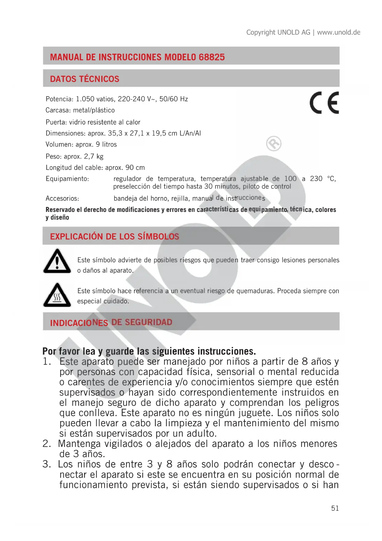 DISPOSICIÓN/PROTECCIÓN DEL MEDIO AMBIENTE Nuestros aparatos se fabrican con un alto nivel de calidad por un largo período de uso. El mantenimiento regular y las reparaciones de tipo técnico a través de nuestro servicio al cliente pueden prolongar la du- ración del aparato. Cuando un aparato está defectuoso y ya no puede repararse, por favor considere en la disposición final los siguientes puntos: Este producto no puede ser eliminado junto a la basura domiciliaria. Usted debe entregar este producto a un lugar oficial para el reciclaje de aparatos eléctricos o electrónicos. Mediante la clasificación por separado y el reciclaje de productos residuales, Usted contribuye a proteger los recursos naturales y asegura que el producto sea eliminado de forma salubre y acorde con el medio ambiente. La garantía para nuestros equipos es de 24 meses, y de 12 meses en el caso de uso comercial, a partir de la fecha de compra, cubriendo los daños que con un uso acorde a lo prescrito pueden atribuirse fehacientemente a defectos de fabri- cación. Dentro del período de garantía, solucionamos errores de material y de fabricación a consideración nuestra mediante reparación o cambio. Nuestros servicios de garantía son válidos únicamente para los aparatos que han sido vendidos en Alemania y Austria. Para todos los demás casos diríjase por favor al importador correspondiente. Aquellos aparatos que se presentan para eliminar errores, por favor enviarlos junto a una copia del comprobante de compra extendido a máquina, del cual debe desprenderse la fecha de compra, así como una breve descripción de las deficiencias, apropiadamente embalado y con los sellos correspondientes a nuestro servicio al cliente. En caso de garantía, los gastos de envío serán restituidos al cliente solamente en Alemania y Austria. Aquellos daños causados por desgaste están excluidos de la garantía, así como manipulación incorrecta, e incumplimiento de las condiciones de mantenimiento y cuidado. El derecho a garantía expira si las reparaciones o mantenimiento son realizadas por terceros. Todo reclamo del consumidor final ante el vendedor, comerciante no se ve afectado por esta garantía. Copyright UNOLD AG | www.unold.de59 Výkon: 1.050 W, 220-240 V~, 50/60 Hz Těleso: kov/plast Dvířka: Tepelně odolné sklo Rozměry: cca 35,3 x 27,1 x 19,5 cm D/Š/V Objem: cca 9 litrů Hmotnost: cca 2,7 kg Délka kabelu: cca 90 cm Vybavení: regulátor teploty, teplota nastavitelná v rozsahu 100-230 °C, předvolba času až 30 minut, kontrolka Příslušenství: plech na pečení, mřížový rošt, návod k obsluze Je vyhrazeno právo na omyly a změny vybavení, techniky, barev a designu