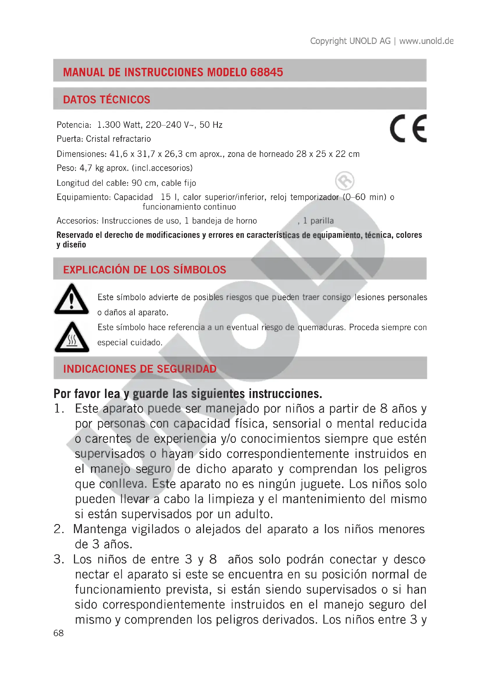 nectar el aparato si este se encuentra en su posición normal de funcionamiento prevista, si están siendo supervisados o si han sido correspondientemente instruidos en el manejo seguro del mismo y comprenden los peligros derivados. Los niños entre 3 y Copyright UNOLD AG | www.unold.de69 8 años no deberán conectar, manejar, limpiar ni realizar el man- tenimiento del aparato.