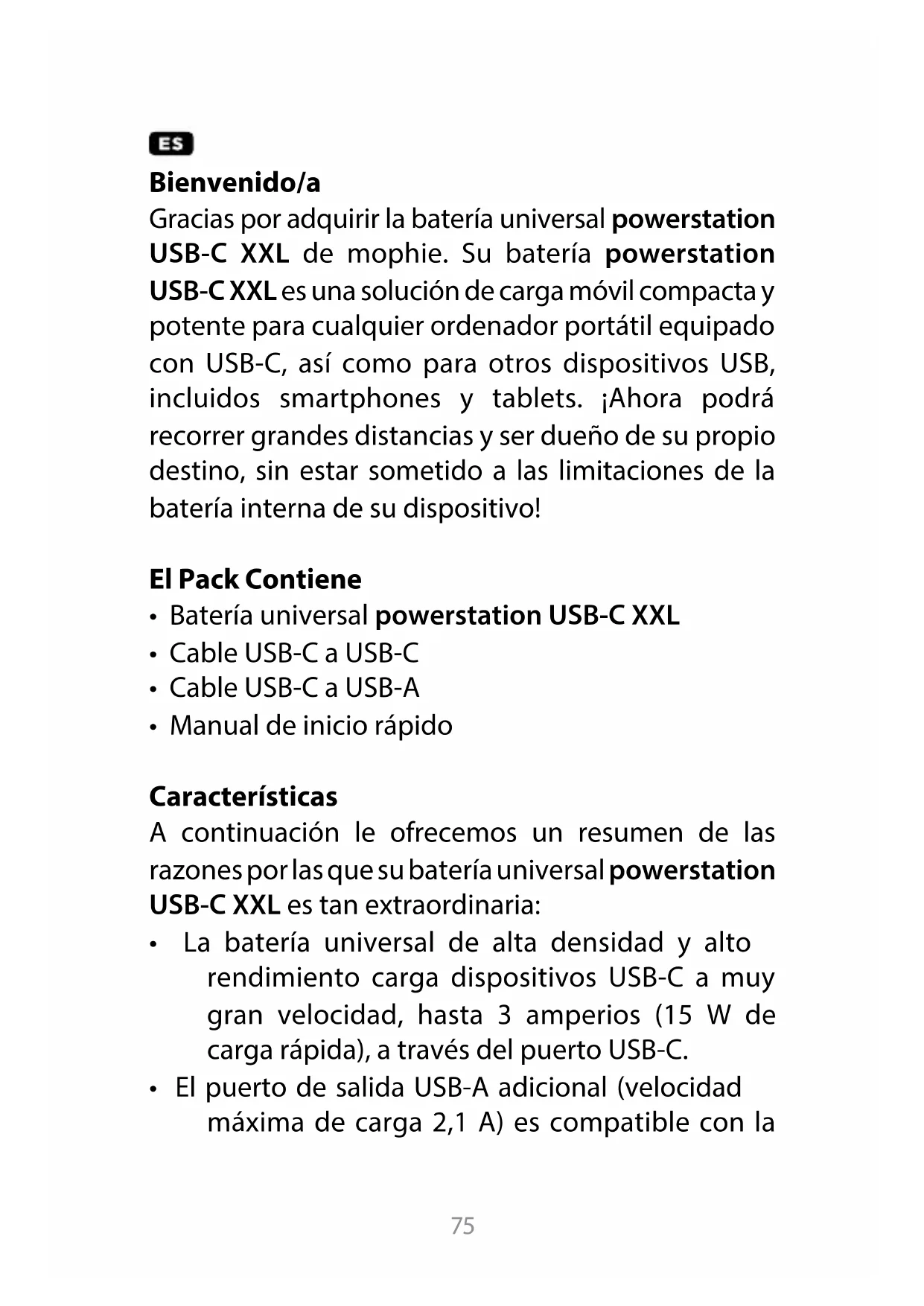 Gracias por adquirir la batería universal powerstation USB-C XXL de mophie. Su batería powerstation USB-C XXL es una solución de carga móvil compacta y potente para cualquier ordenador portátil equipado con USB-C, así como para otros dispositivos USB, incluidos smartphones y tablets. ¡Ahora podrá recorrer grandes distancias y ser dueño de su propio destino, sin estar sometido a las limitaciones de la batería interna de su dispositivo!
