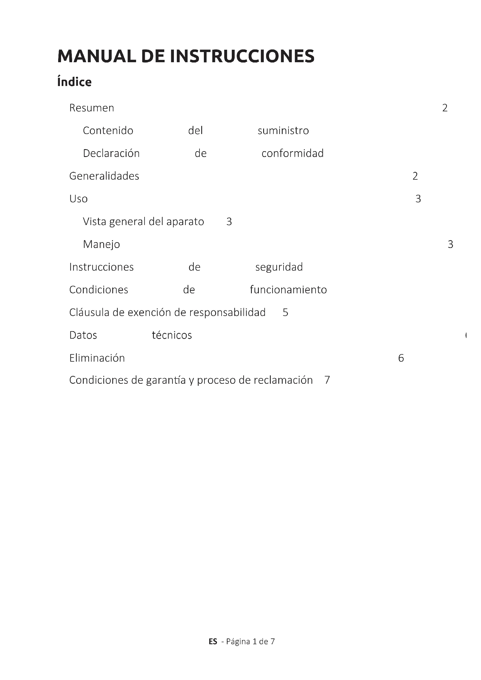 Peligro para niños y personas con capacidades mentales, sensoriales o físicas mer- madas: Los niños a menudo infravaloran los peligros o ni siquiera los detectan. Este aparato no está desnado a ser ulizado por personas (tampoco niños) con capacidades mentales, sensoriales o sicas mermadas o que no cuenten con la experiencia y/o los conocimientos necesarios, a no ser que los supervise una persona responsable de su seguridad o que hayan recibido instrucciones de esta sobre cómo ulizar el aparato y que hayan comprendido los peligros que implica. Los niños no deben acceder a este aparato sin supervisión. Asegúrese de que los niños no juegan con el aparato. No ulice el aparato en entornos extremadamente calientes, fríos, húmedos o polvorientos. No lo exponga a la radiación solar directa. Proteja el producto de llamas directas. ¡Peligro de explosión! Proteja el aparato en cualquier estado de funcionamiento contra golpes y caídas. Este aparato es sensible respecto a la descarga electrostáca. Por esta razón, proteja el aparato contra cualquier posible descarga electrostáca. Observaciones generalesES - Página 5 de 7 A n de evitar fallos de funcionamiento, no conecte las conexiones de salida USB del aparato con puertos USB de ordenadores u otros disposivos. Esas conexiones solo están desnadas a la carga de disposivos. No desmonte el aparato en sus componentes individuales, y no intente repararlo usted mismo. Conene piezas que no requieren mantenimiento, y además en este caso se exngue la garana. No introduzca en las aperturas del producto objetos que no estén previstos para el uso. Pueden causar un cortocircuito, que además puede dar lugar a un incendio. No maneje el aparato con manos mojadas. No ulice agua o soluciones químicas para limpiar el aparato. Use solo un paño seco. No intente reparar usted mismo el aparato. En ese caso se exngue la garana. No ulice el aparato si presenta daños visibles o se ha humedecido. Durante el uso, el aparato genera calor, lo cual es normal. No tape el producto durante el uso. ¡ADVERTENCIA! ¡Supercie caliente! Mientras el disposivo esté en uso, sujetarlo durante un empo pro- longado puede causar lesiones en la piel por su elevada temperatura. Cuando lo ulice, evite sujetarlo en las áreas que estén parcularmen- te calientes. No ulice el disposivo directamente sobre su cuerpo. Una vez frío, el disposivo se puede tocar de forma permanente.