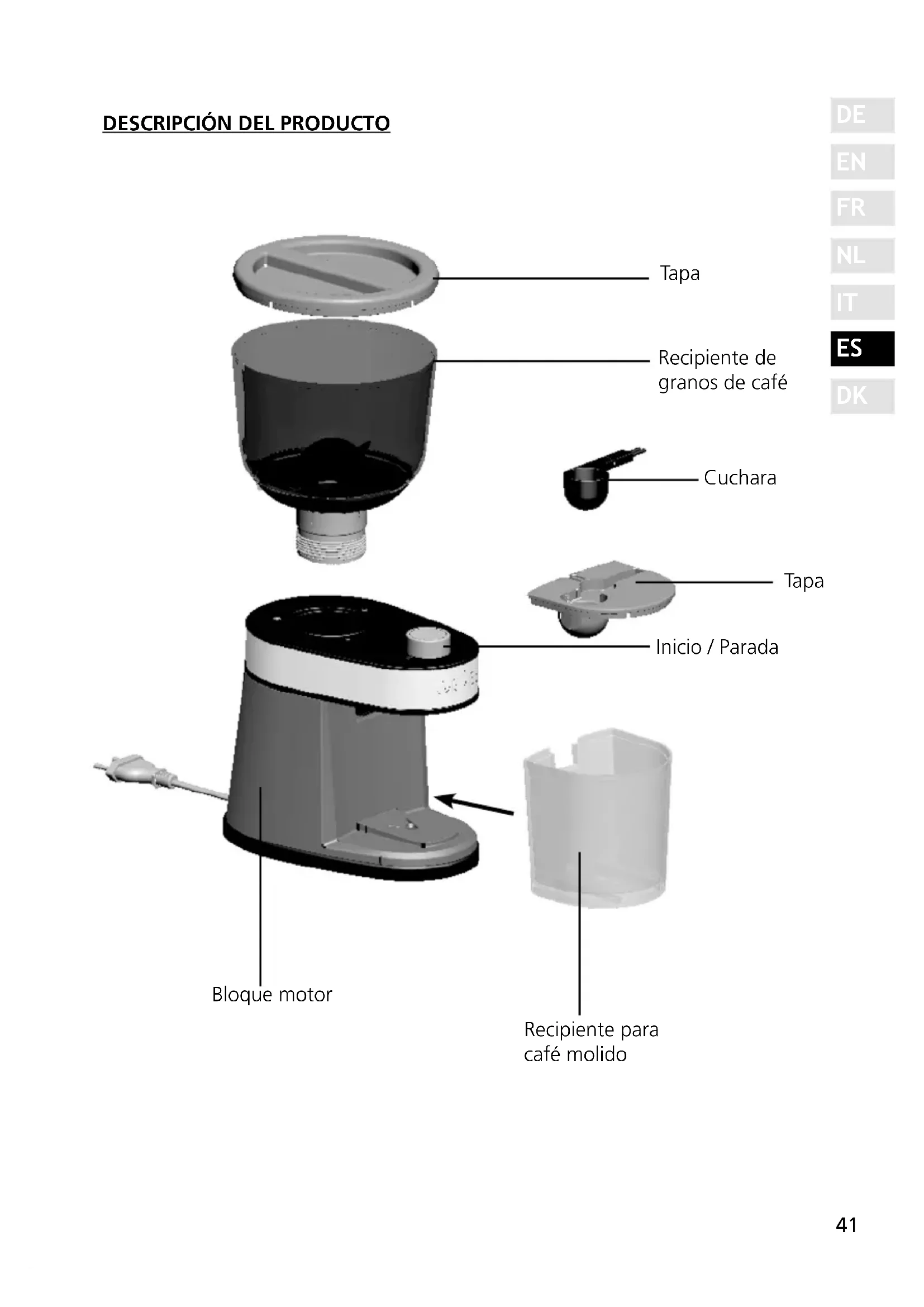 Bloque motor Recipiente para café molido Inicio / Parada Tapa Cuchara Recipiente de granos de café Tapa42 PRÓLOGO Estimado/a cliente: Ha hecho una excelente elección al comprar este molinillo de café. Ha adquirido un producto de calidad reconocido. Le agradecemos su compra y le deseamos que disfrute con su nuevo molinillo de café Graef.
