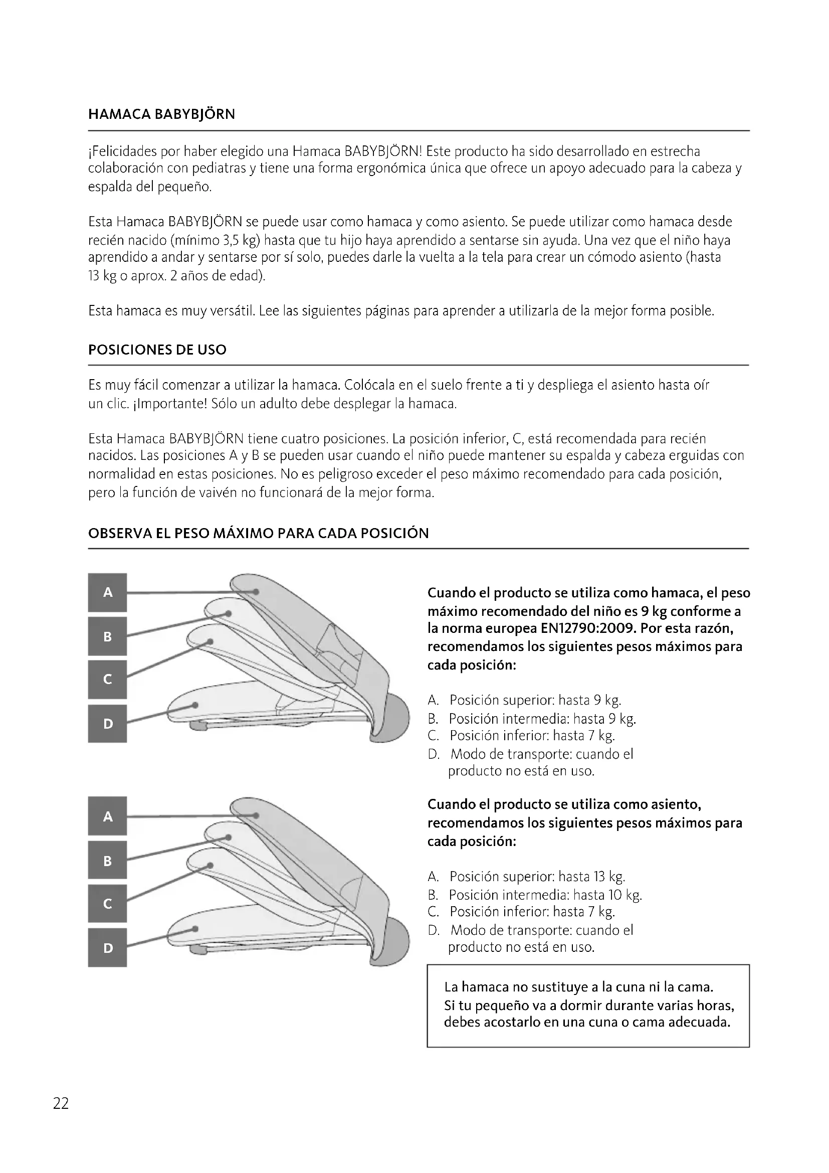 ¡Felicidades por haber elegido una Hamaca BABYBJÖRN! Este producto ha sido desarrollado en estrecha colaboración con pediatras y tiene una forma ergonómica única que ofrece un apoyo adecuado para la cabeza y espalda del pequeño. Esta Hamaca BABYBJÖRN se puede usar como hamaca y como asiento. Se puede utilizar como hamaca desde recién nacido (mínimo 3,5 kg) hasta que tu hijo haya aprendido a sentarse sin ayuda. Una vez que el niño haya aprendido a andar y sentarse por sí solo, puedes darle la vuelta a la tela para crear un cómodo asiento (hasta 13kg o aprox. 2 años de edad). Esta hamaca es muy versátil. Lee las siguientes páginas para aprender a utilizarla de la mejor forma posible. Cuando el producto se utiliza como hamaca, el peso máximo recomendado del niño es 9 kg conforme a la norma europea EN12790:2009. Por esta razón, recomendamos los siguientes pesos máximos para cada posición: A. Posición superior: hasta 9 kg. B. Posición intermedia: hasta 9 kg. C. Posición inferior: hasta 7 kg. D. Modo de transporte: cuando el producto no está en uso. OBSERVA EL PESO MÁXIMO PARA CADA POSICIÓN Cuando el producto se utiliza como asiento, recomendamos los siguientes pesos máximos para cada posición: A. Posición superior: hasta 13 kg. B. Posición intermedia: hasta 10 kg. C. Posición inferior: hasta 7 kg. D. Modo de transporte: cuando el producto no está en uso.
