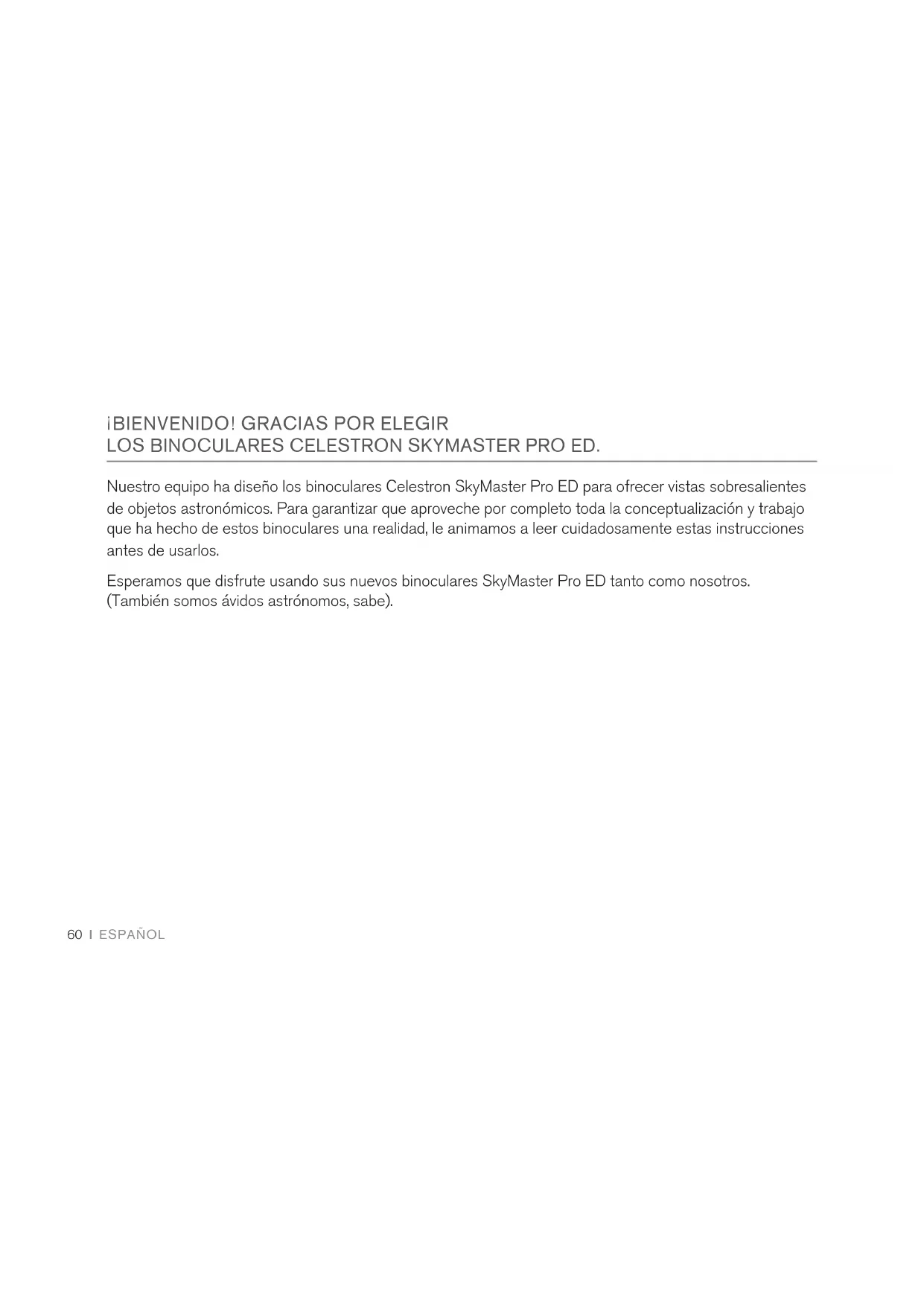 Nuestro equipo ha diseño los binoculares Celestron SkyMaster Pro ED para ofrecer vistas sobresalientes de objetos astronómicos. Para garantizar que aproveche por completo toda la conceptualización y trabajo que ha hecho de estos binoculares una realidad, le animamos a leer cuidadosamente estas instrucciones antes de usarlos. Esperamos que disfrute usando sus nuevos binoculares SkyMaster Pro ED tanto como nosotros. (También somos ávidos astrónomos, sabe).