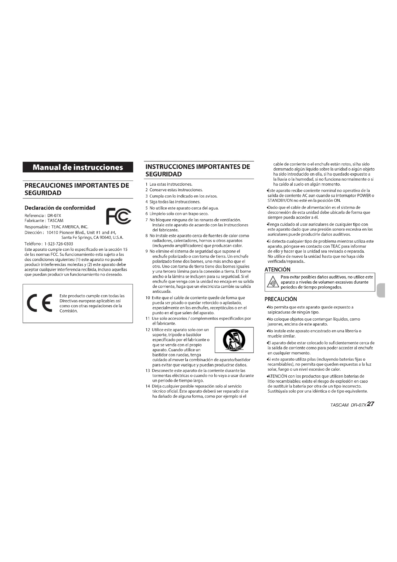 SEGURIDAD Declaración de conformidad Referencia : DR-07X Fabricante : TASCAM Responsable : TEAC AMERICA, INC. Dirección : 10410 Pioneer Blvd., Unit #1 and #4, Santa Fe Springs, CA 90640, U.S.A. Teléfono : 1-323-726-0303 Este aparato cumple con lo especificado en la sección 15 de las normas FCC. Su funcionamiento está sujeto a las dos condiciones siguientes: (1) este aparato no puede producir interferencias molestas y (2) este aparato debe aceptar cualquier interferencia recibida, incluso aquellas que puedan producir un funcionamiento no deseado. Este producto cumple con todas las DIrectivas europeas aplicables así como con otras regulaciones de la Comisión.