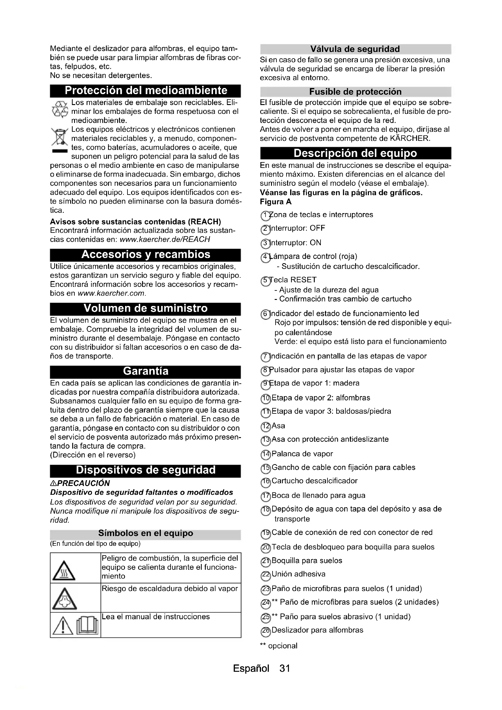 - Datos técnicos Español 31 Mediante el deslizador para alfombras, el equipo tam- bién se puede usar para limpiar alfombras de fibras cor- tas, felpudos, etc. No se necesitan detergentes. Protección del medioambiente Los materiales de embalaje son reciclables. Eli- minar los embalajes de forma respetuosa con el medioambiente. Los equipos eléctricos y electrónicos contienen materiales reciclables y, a menudo, componen- tes, como baterías, acumuladores o aceite, que suponen un peligro potencial para la salud de las personas o el medio ambiente en caso de manipularse o eliminarse de forma inadecuada. Sin embargo, dichos componentes son necesarios para un funcionamiento adecuado del equipo. Los equipos identificados con es- te símbolo no pueden eliminarse con la basura domés- tica. Avisos sobre sustancias contenidas (REACH) Encontrará información actualizada sobre las sustan- cias contenidas en: www.kaercher.de/REACH Accesorios y recambios Utilice únicamente accesorios y recambios originales, estos garantizan un servicio seguro y fiable del equipo. Encontrará información sobre los accesorios y recam- bios en www.kaercher.com. Volumen de suministro El volumen de suministro del equipo se muestra en el embalaje. Compruebe la integridad del volumen de su- ministro durante el desembalaje. Póngase en contacto con su distribuidor si faltan accesorios o en caso de da- ños de transporte. Garantía En cada país se aplican las condiciones de garantía in- dicadas por nuestra compañía distribuidora autorizada. Subsanamos cualquier fallo en su equipo de forma gra- tuita dentro del plazo de garantía siempre que la causa se deba a un fallo de fabricación o material. En caso de garantía, póngase en contacto con su distribuidor o con el servicio de posventa autorizado más próximo presen- tando la factura de compra. (Dirección en el reverso) Dispositivos de seguridad 몇 PRECAUCIÓN Dispositivo de seguridad faltantes o modificados Los dispositivos de seguridad velan por su seguridad. Nunca modifique ni manipule los dispositivos de segu- ridad. Símbolos en el equipo (En función del tipo de equipo) Válvula de seguridad Si en caso de fallo se genera una presión excesiva, una válvula de seguridad se encarga de liberar la presión excesiva al entorno. Fusible de protección El fusible de protección impide que el equipo se sobre- caliente. Si el equipo se sobrecalienta, el fusible de pro- tección desconecta el equipo de la red. Antes de volver a poner en marcha el equipo, diríjase al servicio de postventa competente de KÄRCHER. Descripción del equipo En este manual de instrucciones se describe el equipa- miento máximo. Existen diferencias en el alcance del suministro según el modelo (véase el embalaje). Véanse las figuras en la página de gráficos. Figura A 1 Zona de teclas e interruptores 2 Interruptor: OFF 3 Interruptor: ON 4 Lámpara de control (roja) - Sustitución de cartucho descalcificador. 5 Tecla RESET - Ajuste de la dureza del agua - Confirmación tras cambio de cartucho 6 Indicador del estado de funcionamiento led Rojo por impulsos: tensión de red disponible y equi- po calentándose Verde: el equipo está listo para el funcionamiento 7 Indicación en pantalla de las etapas de vapor 8 Pulsador para ajustar las etapas de vapor 9 Etapa de vapor 1: madera 10 Etapa de vapor 2: alfombras 11 Etapa de vapor 3: baldosas/piedra 12 Asa 13 Asa con protección antideslizante 14 Palanca de vapor 15 Gancho de cable con fijación para cables 16 Cartucho descalcificador 17 Boca de llenado para agua 18 Depósito de agua con tapa del depósito y asa de transporte 19 Cable de conexión de red con conector de red 20 Tecla de desbloqueo para boquilla para suelos 21 Boquilla para suelos 22 Unión adhesiva 23 Paño de microfibras para suelos (1 unidad) 24 ** Paño de microfibras para suelos (2 unidades) 25 ** Paño para suelos abrasivo (1 unidad) 26 Deslizador para alfombras ** opcional Peligro de combustión, la superficie del equipo se calienta durante el funciona- miento Riesgo de escaldadura debido al vapor Lea el manual de instrucciones32 Español Primera puesta en marcha CUIDADO Daños en el equipo por calcificación El cartucho descalcificador solo alcanzará su máximo rendimiento si antes de la 1.ª puesta en funcionamiento adapta el equipo a la dureza del agua local. Ajuste el equipo a la dureza del agua local. Antes de usar el equipo en una zona con un nivel de du- reza del agua diferente (p. ej. en caso de mudanza), ajuste el equipo a la dureza actual del agua. p. 37