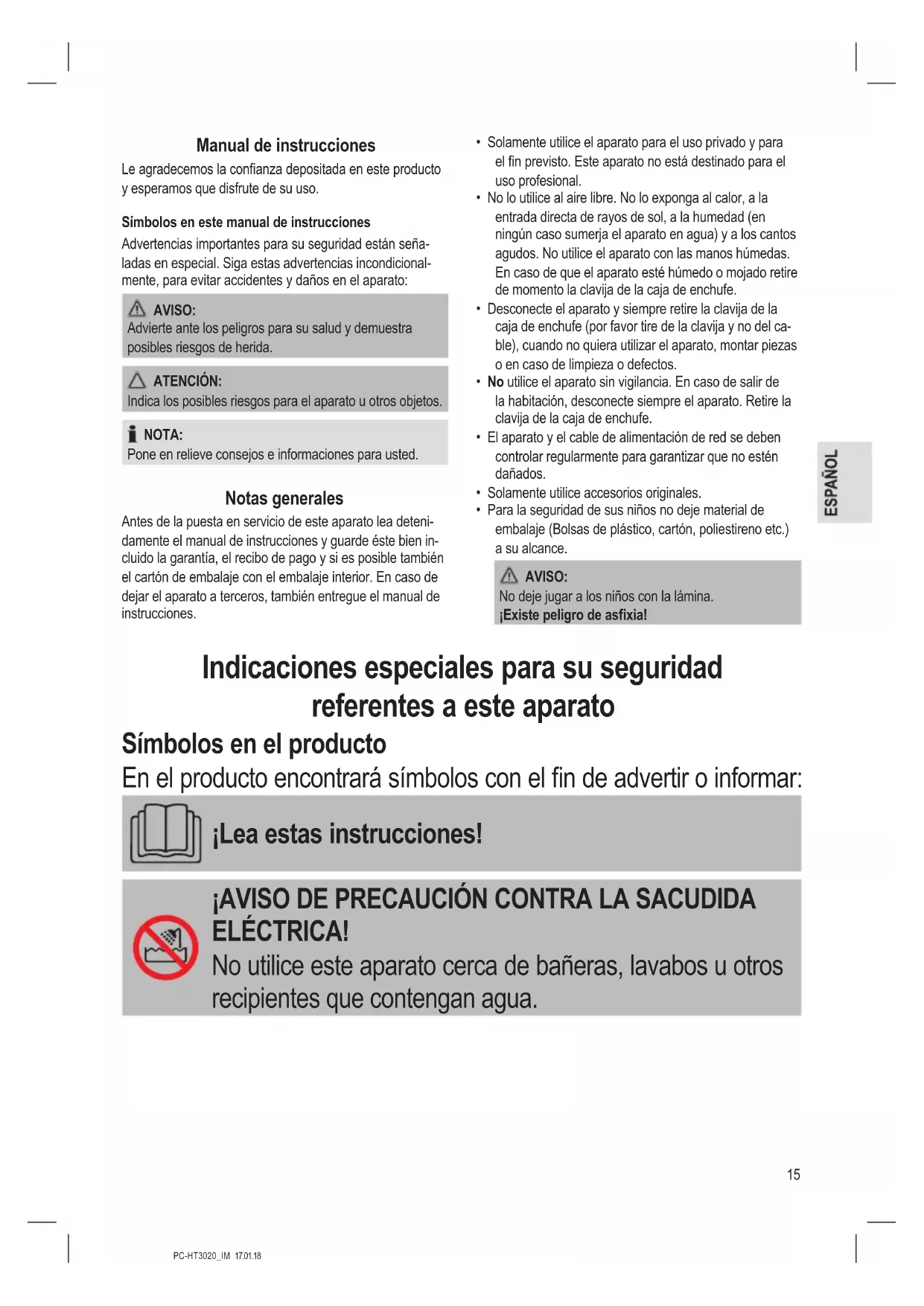 - Para la seguridad de sus niños no deje material de embalaje (Bolsas de plástico, cartón, poliestireno etc.) a su alcance. AVISO: No deje jugar a los niños con la lámina. ¡Existe peligro de asxia! Indicaciones especiales para su seguridad referentes a este aparato Símbolos en el producto En el producto encontrará símbolos con el n de advertir o informar: ¡Lea estas instrucciones! ¡AVISO DE PRECAUCIÓN CONTRA LA SACUDIDA ELÉCTRICA! No utilice este aparato cerca de bañeras, lavabos u otros recipientes que contengan agua.16 PC-HT3020_IM 17.01.18 AVISO: