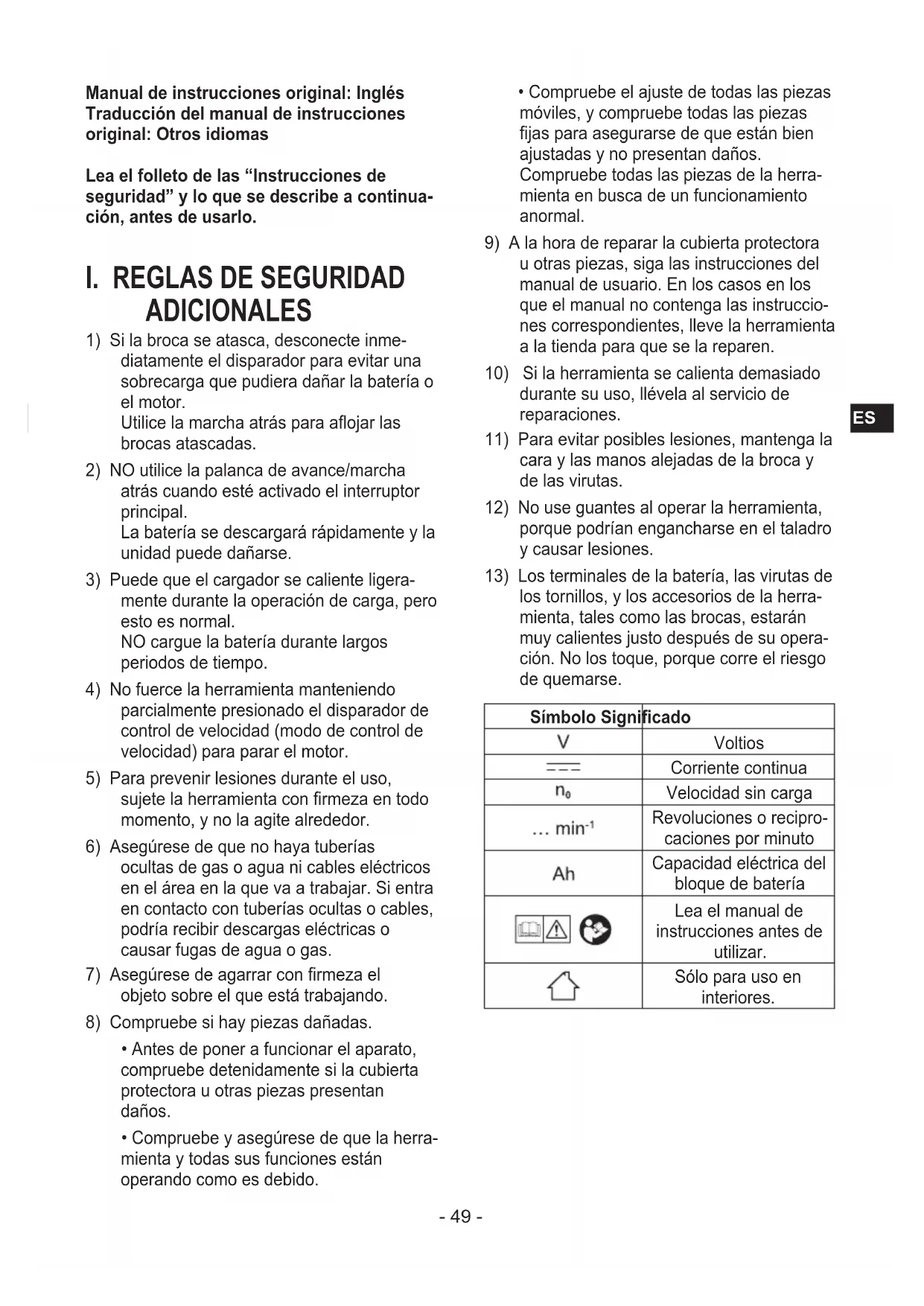 los tornillos, y los accesorios de la herra- mienta, tales como las brocas, estarán muy calientes justo después de su opera- ción. No los toque, porque corre el riesgo de quemarse. Símbolo Signicado Voltios Corriente continua Velocidad sin carga Revoluciones o recipro- caciones por minuto Capacidad eléctrica del bloque de batería Lea el manual de instrucciones antes de utilizar. Sólo para uso en interiores.- 50 -