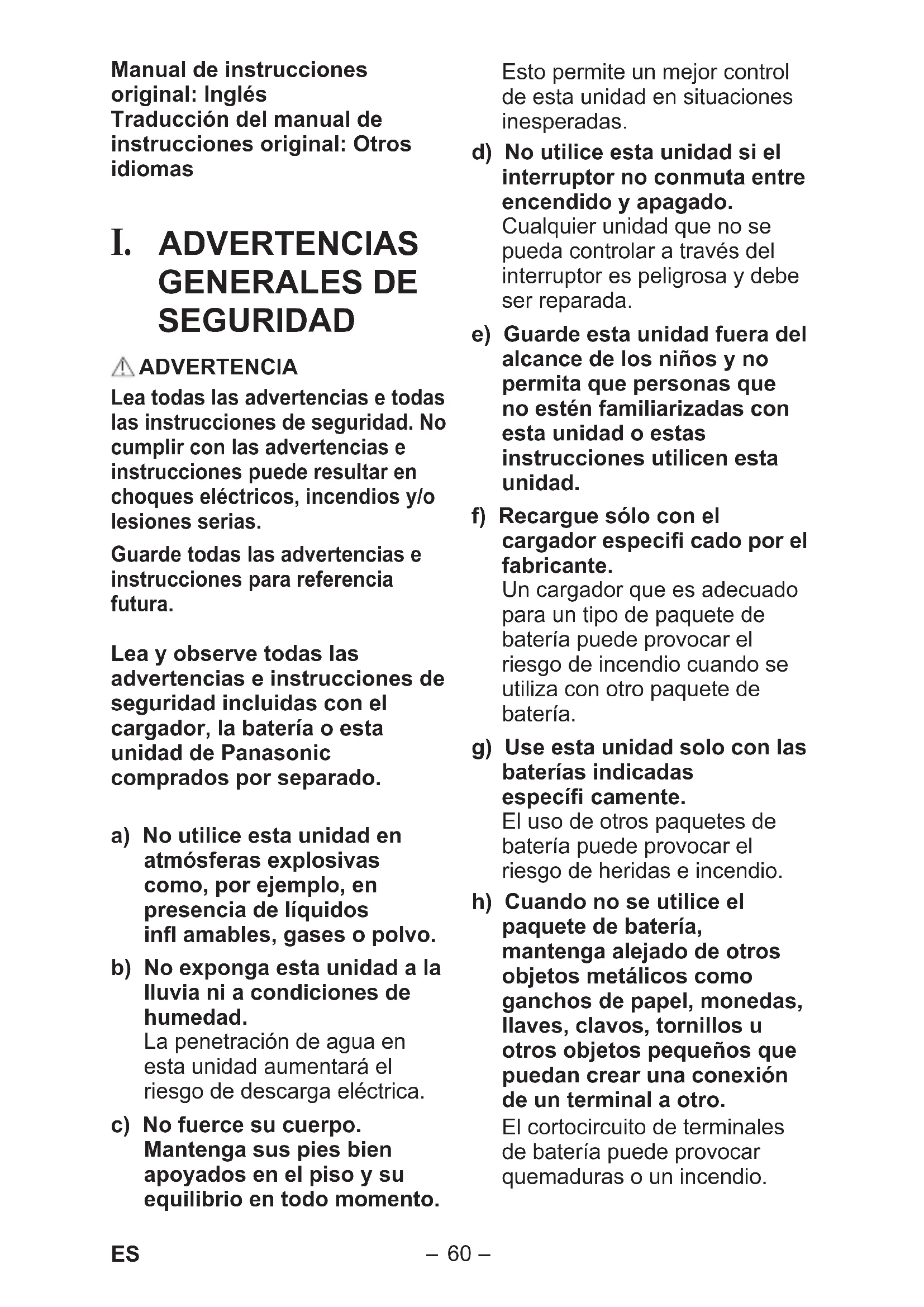 ADVERTENCIAS GENERALES DE SEGURIDAD ADVERTENCIA Lea todas las advertencias e todas las instrucciones de seguridad. No cumplir con las advertencias e instrucciones puede resultar en choques eléctricos, incendios y/o lesiones serias. Guarde todas las advertencias e instrucciones para referencia futura. Lea y observe todas las advertencias e instrucciones de seguridad incluidas con el cargador, la batería o esta unidad de Panasonic comprados por separado. a) No utilice esta unidad en atmósferas explosivas como, por ejemplo, en presencia de líquidos infl amables, gases o polvo. b) No exponga esta unidad a la lluvia ni a condiciones de humedad. La penetración de agua en esta unidad aumentará el riesgo de descarga eléctrica. c) No fuerce su cuerpo. Mantenga sus pies bien apoyados en el piso y su equilibrio en todo momento. Esto permite un mejor control de esta unidad en situaciones inesperadas. d) No utilice esta unidad si el interruptor no conmuta entre encendido y apagado. Cualquier unidad que no se pueda controlar a través del interruptor es peligrosa y debe ser reparada. e) Guarde esta unidad fuera del alcance de los niños y no permita que personas que no estén familiarizadas con esta unidad o estas instrucciones utilicen esta unidad. f) Recargue sólo con el cargador especifi cado por el fabricante. Un cargador que es adecuado para un tipo de paquete de batería puede provocar el riesgo de incendio cuando se utiliza con otro paquete de batería. g) Use esta unidad solo con las baterías indicadas específi camente. El uso de otros paquetes de batería puede provocar el riesgo de heridas e incendio. h) Cuando no se utilice el paquete de batería, mantenga alejado de otros objetos metálicos como ganchos de papel, monedas, llaves, clavos, tornillos u otros objetos pequeños que puedan crear una conexión de un terminal a otro. El cortocircuito de terminales de batería puede provocar quemaduras o un incendio. EY971037C401.indb60EY971037C401.indb60 2019/08/2320:52:362019/08/2320:52:36-