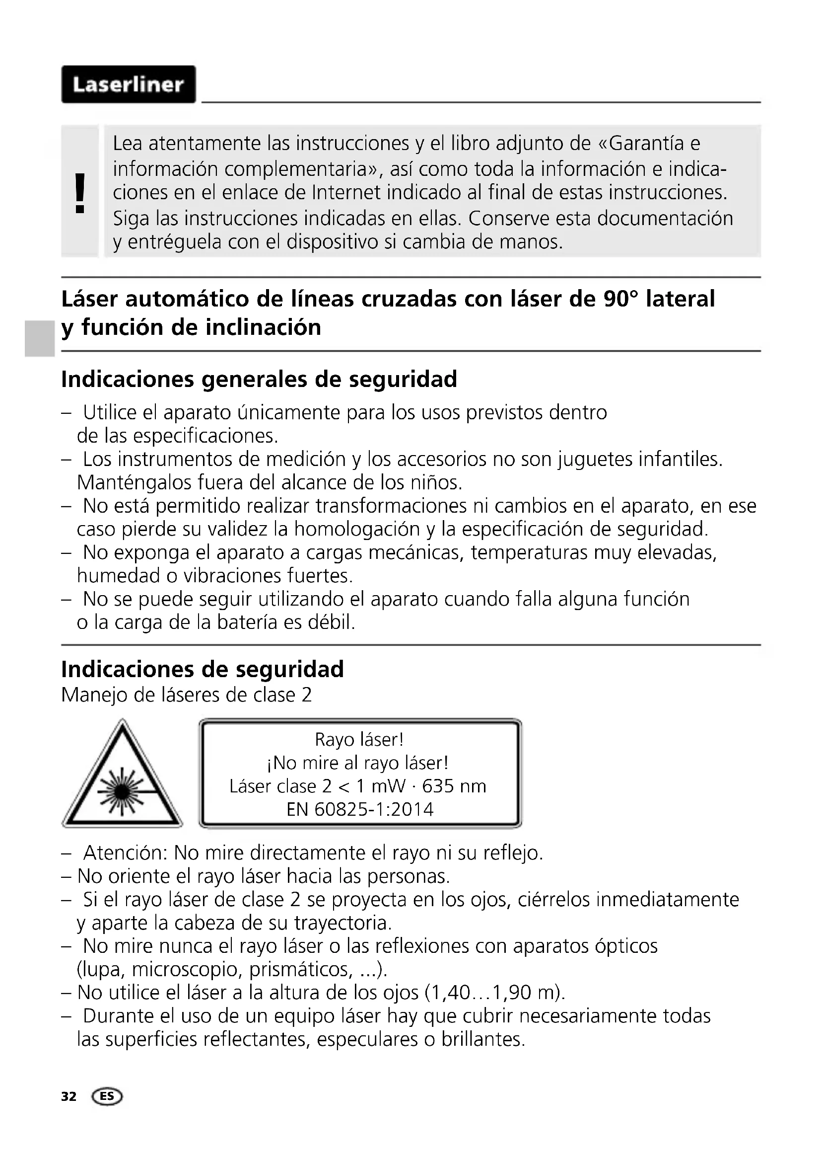 – Atención: No mire directamente el rayo ni su reejo. – No oriente el rayo láser hacia las personas. – Si el rayo láser de clase 2 se proyecta en los ojos, ciérrelos inmediatamente y aparte la cabeza de su trayectoria. – No mire nunca el rayo láser o las reexiones con aparatos ópticos (lupa, microscopio, prismáticos, ...). – No utilice el láser a la altura de los ojos (1,40…1,90 m). – Durante el uso de un equipo láser hay que cubrir necesariamente todas las supercies reectantes, especulares o brillantes. Indicaciones de seguridad Manejo de láseres de clase 2 Indicaciones generales de seguridad – Utilice el aparato únicamente para los usos previstos dentro de las especicaciones. – Los instrumentos de medición y los accesorios no son juguetes infantiles. Manténgalos fuera del alcance de los niños. – No está permitido realizar transformaciones ni cambios en el aparato, en ese caso pierde su validez la homologación y la especicación de seguridad. – No exponga el aparato a cargas mecánicas, temperaturas muy elevadas, humedad o vibraciones fuertes. – No se puede seguir utilizando el aparato cuando falla alguna función o la carga de la batería es débil. Rayo láser! ¡No mire al rayo láser! Láser clase 2 < 1 mW · 635 nm EN 60825-1:2014 Láser automático de líneas cruzadas con láser de 90° lateral y función de inclinación ES33 CompactCube-Laser 3