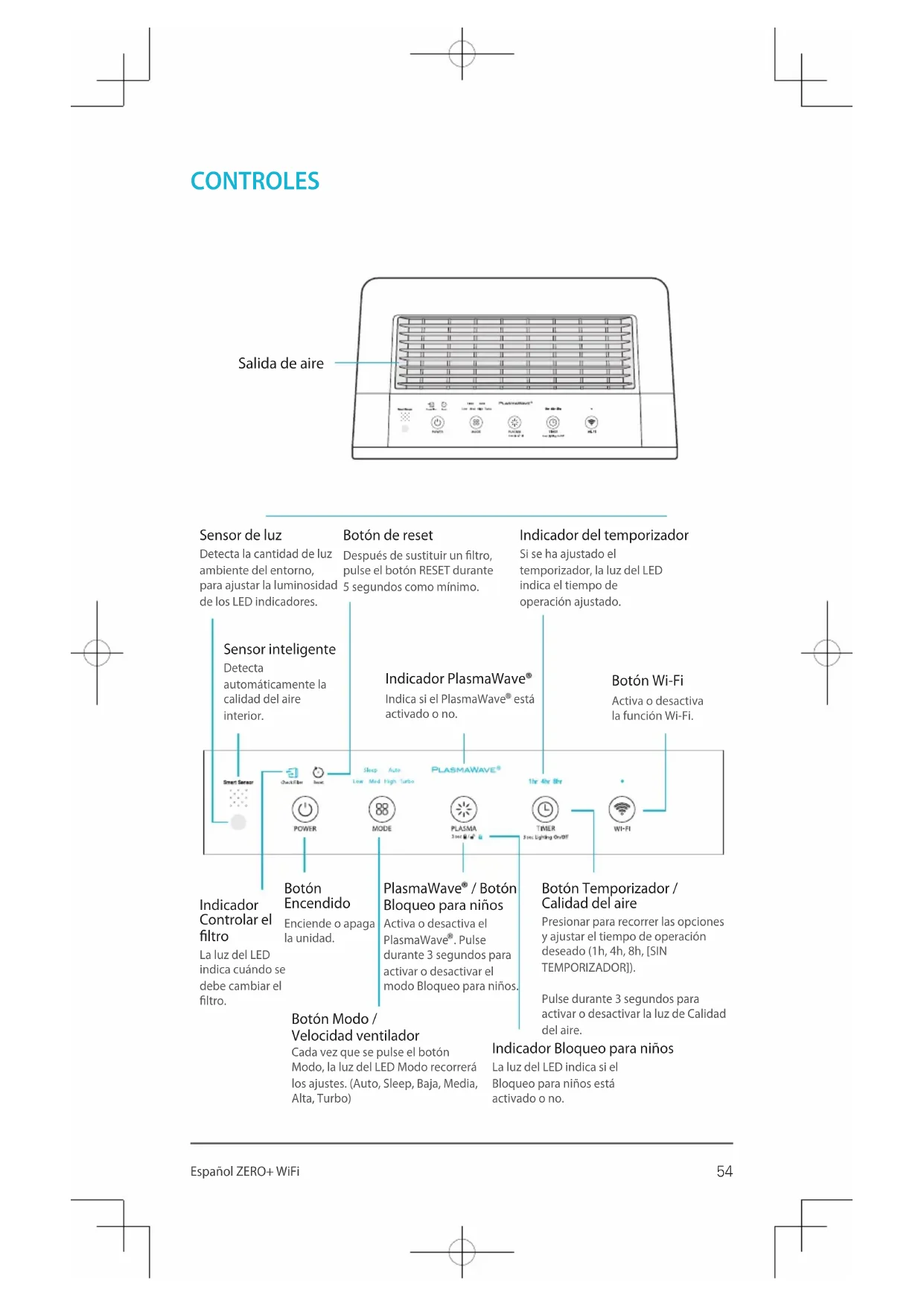 ZERO+ WiFi (AZPU373-HWE) User Manual Model Use & Care Guide Please read and follow all safety rules and instructionsin this manual before operating.The product warranty is printed on the back of thisguide, so please keep it in a safe place for future use.54 Español ZERO+ WiFi CONTROLES Salida de aire Sensor de luz Detecta la cantidad de luz ambiente del entorno, para ajustar la luminosidad de los LED indicadores. Botón Modo / Velocidad ventilador Cada vez que se pulse el botón Modo, la luz del LED Modo recorrerá los ajustes. (Auto, Sleep, Baja, Media, Alta, Turbo) Indicador Bloqueo para niños La luz del LED indica si el Bloqueo para niños está activado o no. Indicador del temporizador Si se ha ajustado el temporizador, la luz del LED indica el tiempo de operación ajustado. Indicador PlasmaWave Indica si el PlasmaWave está activado o no. Botón Temporizador / Calidad del aire Presionar para recorrer las opciones y ajustar el tiempo de operación deseado (1h, 4h, 8h, [SIN TEMPORIZADOR]). Pulse durante 3 segundos para activar o desactivar la luz de Calidad del aire. Sensor inteligente Detecta automáticamente la calidad del aire interior. Botón Wi-Fi Activa o desactiva la función Wi-Fi. Botón de reset Después de sustituir un ltro, pulse el botón RESET durante 5 segundos como mínimo. Botón Encendido Enciende o apaga la unidad. Indicador Controlar el ltro La luz del LED indica cuándo se debe cambiar el ltro. PlasmaWave / Botón Bloqueo para niños Activa o desactiva el PlasmaWave . Pulse durante 3 segundos para activar o desactivar el modo Bloqueo para niños.55 Español ZERO+ WiFi