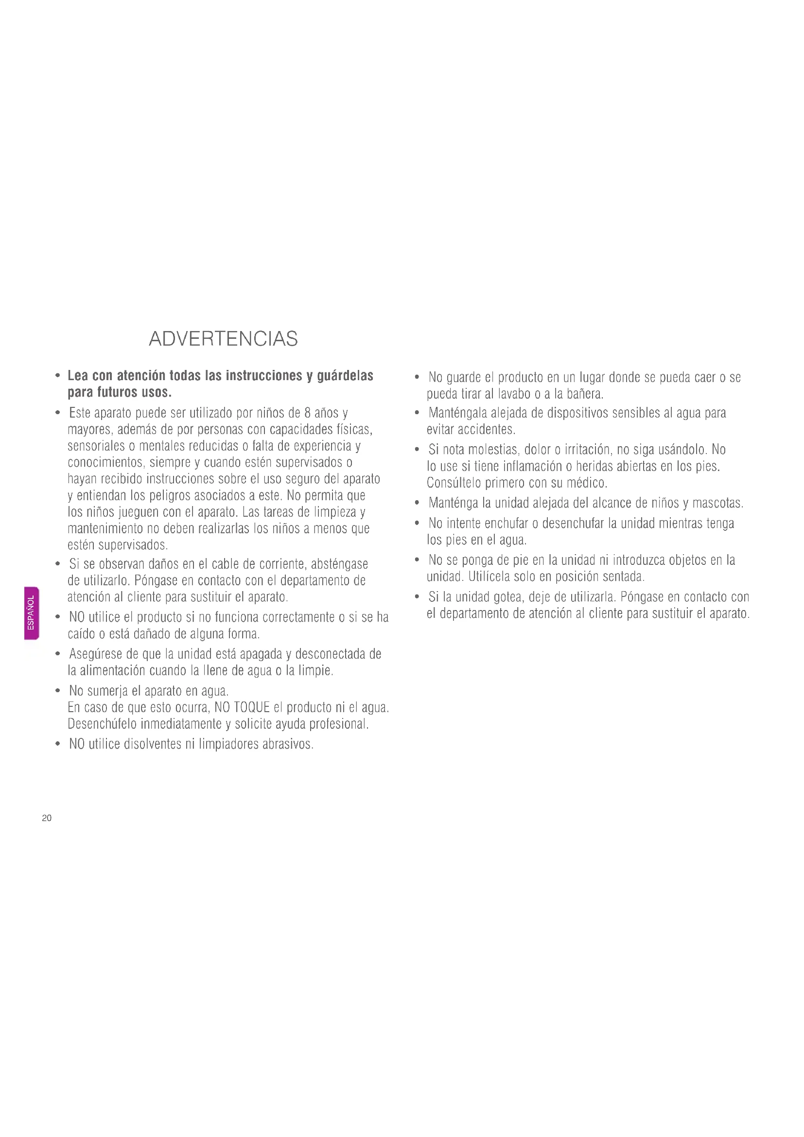 Conectela a la corrente. Introduzca los pies en el agua. Para ENCENDER la unidad pulse el boton