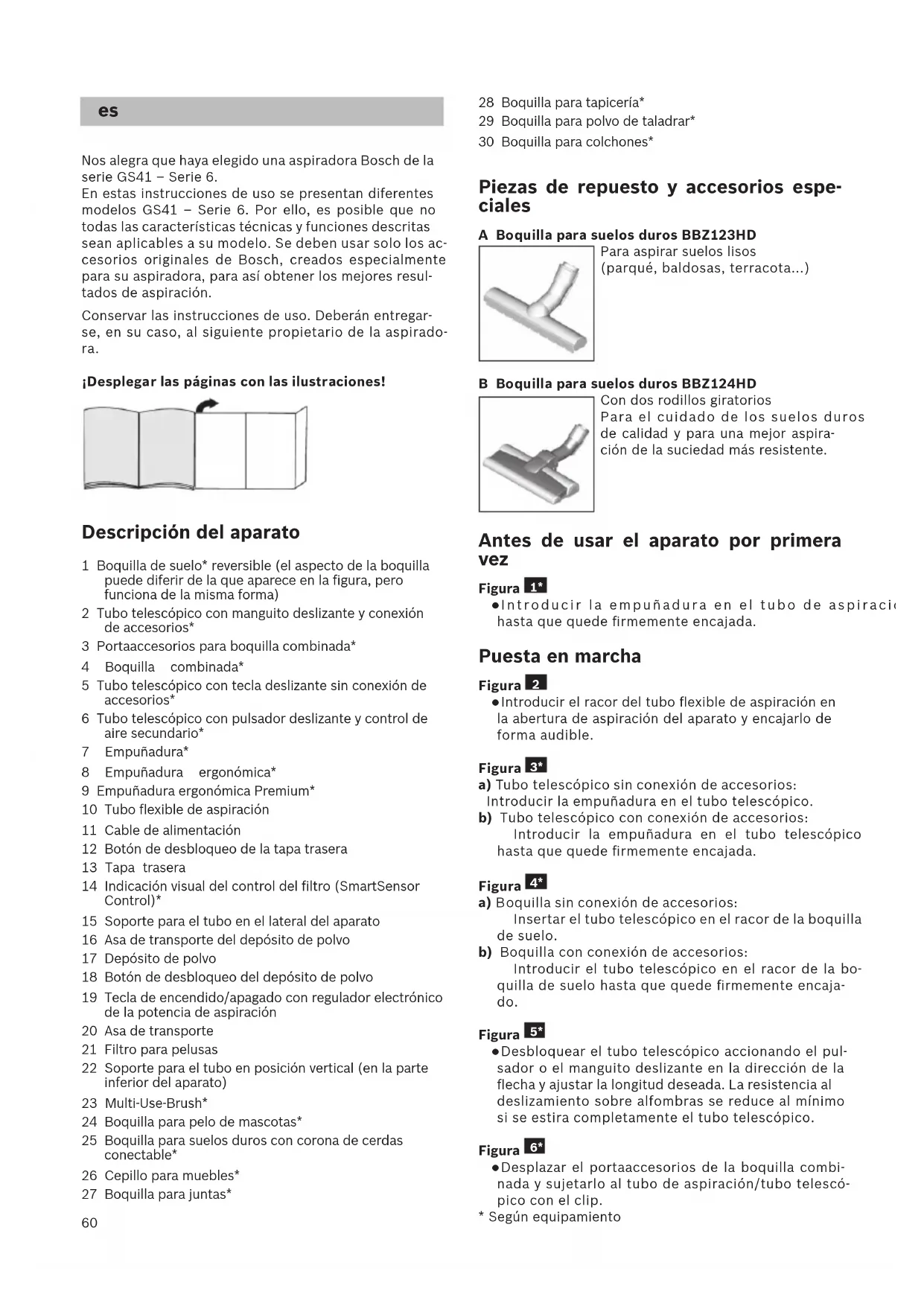 - Según equipamiento Nos alegra que haya elegido una aspiradora Bosch de la serie GS41 – Serie 6. En estas instrucciones de uso se presentan diferentes modelos GS41 – Serie 6. Por ello, es posible que no todas las características técnicas y funciones descritas sean aplicables a su modelo. Se deben usar solo los ac- cesorios originales de Bosch, creados especialmente para su aspiradora, para así obtener los mejores resul- tados de aspiración. Conservar las instrucciones de uso. Deberán entregar- se, en su caso, al siguiente propietario de la aspirado- ra. ¡Desplegar las páginas con las ilustraciones! Descripción del aparato 1 Boquilla de suelo* reversible (el aspecto de la boquilla puede diferir de la que aparece en la figura, pero funciona de la misma forma) 2 Tubo telescópico con manguito deslizante y conexión de accesorios* 3 Portaaccesorios para boquilla combinada* 4 Boquilla combinada* 5 Tubo telescópico con tecla deslizante sin conexión de accesorios* 6 Tubo telescópico con pulsador deslizante y control de aire secundario* 7 Empuñadura* 8 Empuñadura ergonómica* 9 Empuñadura ergonómica Premium* 10 Tubo flexible de aspiración 11 Cable de alimentación 12 Botón de desbloqueo de la tapa trasera 13 Tapa trasera 14 Indicación visual del control del filtro (SmartSensor Control)* 15 Soporte para el tubo en el lateral del aparato 16 Asa de transporte del depósito de polvo 17 Depósito de polvo 18 Botón de desbloqueo del depósito de polvo 19 Tecla de encendido/apagado con regulador electrónico de la potencia de aspiración 20 Asa de transporte 21 Filtro para pelusas 22 Soporte para el tubo en posición vertical (en la parte inferior del aparato) 23 Multi-Use-Brush* 24 Boquilla para pelo de mascotas* 25 Boquilla para suelos duros con corona de cerdas conectable* 26 Cepillo para muebles* 27 Boquilla para juntas*61