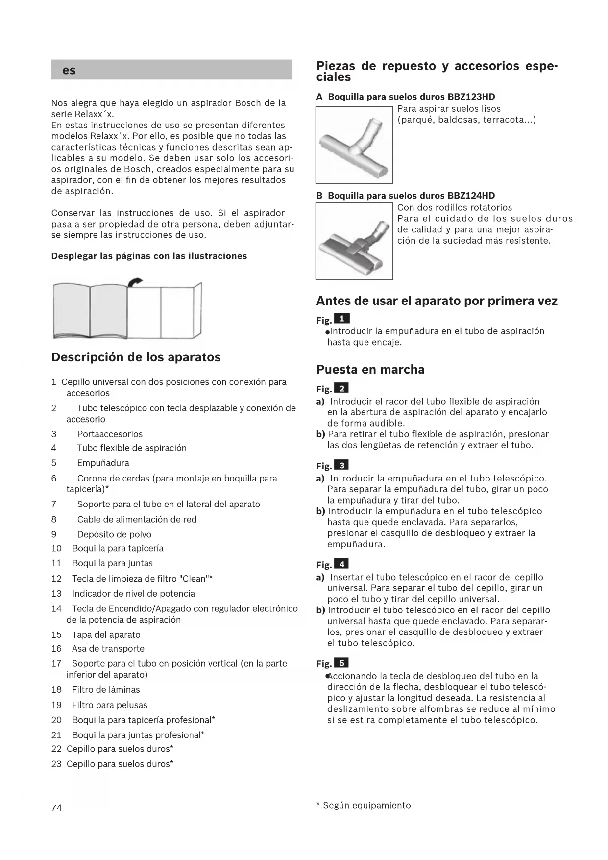 - mallista riippuen74 Nos alegra que haya elegido un aspirador Bosch de la serie Relaxx´x. En estas instrucciones de uso se presentan diferentes modelos Relaxx´x. Por ello, es posible que no todas las características técnicas y funciones descritas sean ap- licables a su modelo. Se deben usar solo los accesori- os originales de Bosch, creados especialmente para su aspirador, con el fin de obtener los mejores resultados de aspiración. Conservar las instrucciones de uso. Si el aspirador pasa a ser propiedad de otra persona, deben adjuntar- se siempre las instrucciones de uso. Desplegar las páginas con las ilustraciones Descripción de los aparatos 1 Cepillo universal con dos posiciones con conexión para accesorios 2 Tubo telescópico con tecla desplazable y conexión de accesorio 3 Portaaccesorios 4 Tubo flexible de aspiración 5 Empuñadura 6 Corona de cerdas (para montaje en boquilla para tapicería)* 7 Soporte para el tubo en el lateral del aparato 8 Cable de alimentación de red 9 Depósito de polvo 10 Boquilla para tapicería 11 Boquilla para juntas 12 Tecla de limpieza de filtro "Clean"* 13 Indicador de nivel de potencia 14 Tecla de Encendido/Apagado con regulador electrónico de la potencia de aspiración 15 Tapa del aparato 16 Asa de transporte 17 Soporte para el tubo en posición vertical (en la parte inferior del aparato) 18 Filtro de láminas 19 Filtro para pelusas 20 Boquilla para tapicería profesional* 21 Boquilla para juntas profesional* 22 Cepillo para suelos duros* 23 Cepillo para suelos duros* Piezas de repuesto y accesorios espe- ciales A Boquilla para suelos duros BBZ123HD Para aspirar suelos lisos (parqué, baldosas, terracota...) B Boquilla para suelos duros BBZ124HD Con dos rodillos rotatorios Para el cuidado de los suelos duros de calidad y para una mejor aspira- ción de la suciedad más resistente. Antes de usar el aparato por primera vez Fig.