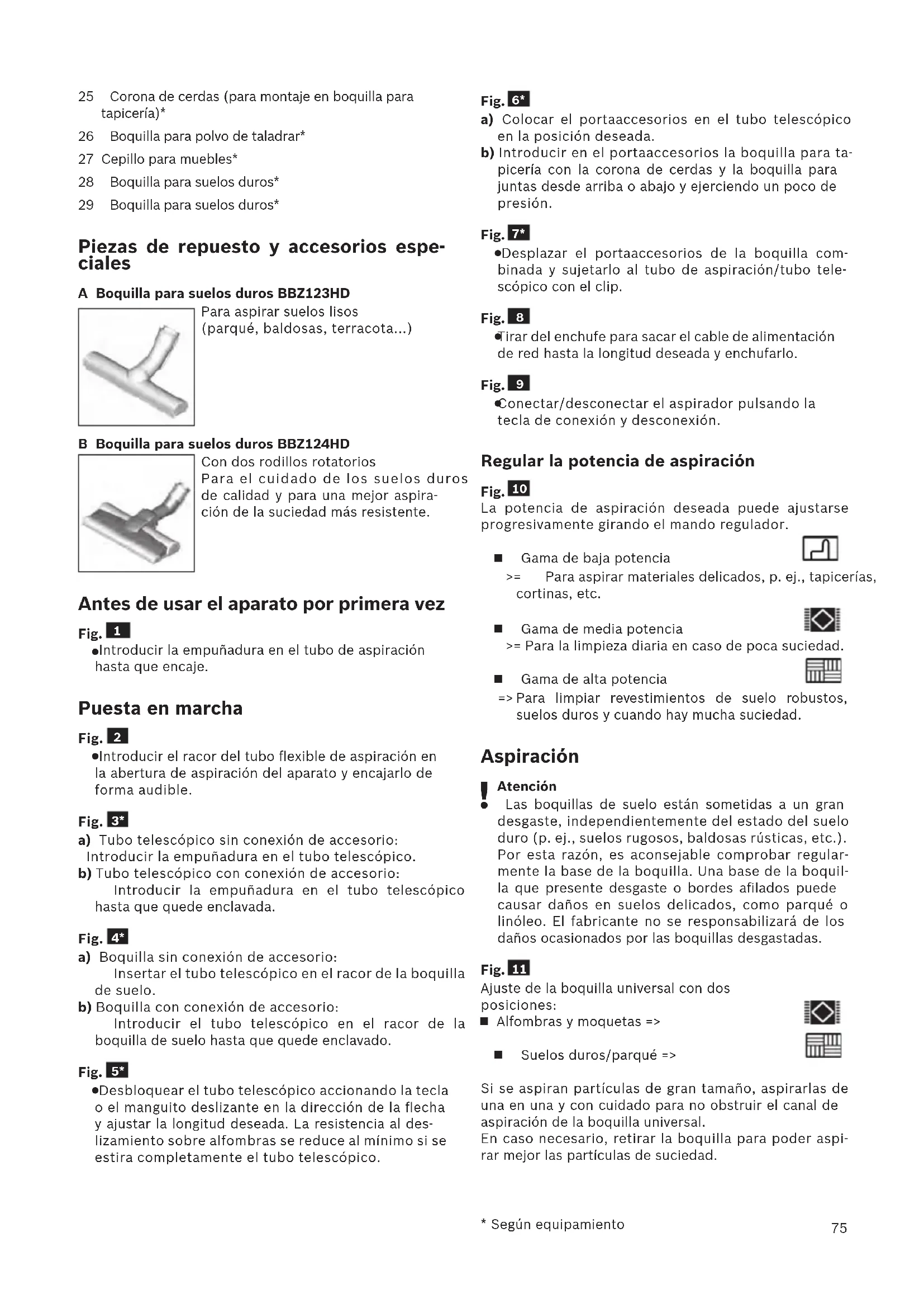 - Según equipamiento 25 Corona de cerdas (para montaje en boquilla para tapicería)* 26 Boquilla para polvo de taladrar* 27 Cepillo para muebles* 28 Boquilla para suelos duros* 29 Boquilla para suelos duros* Piezas de repuesto y accesorios espe- ciales A Boquilla para suelos duros BBZ123HD Para aspirar suelos lisos (parqué, baldosas, terracota...) B Boquilla para suelos duros BBZ124HD Con dos rodillos rotatorios Para el cuidado de los suelos duros de calidad y para una mejor aspira- ción de la suciedad más resistente. Antes de usar el aparato por primera vez Fig.
