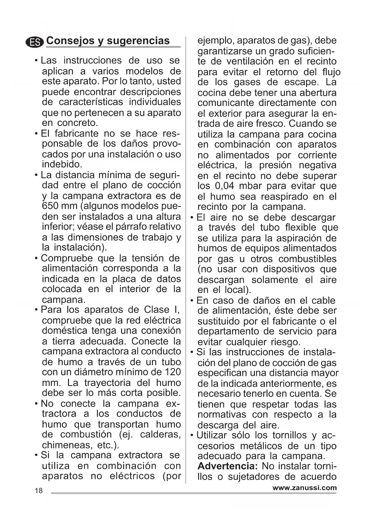 - Utilizar sólo los tornillos y ac- cesorios metálicos de un tipo adecuado para la campana. Advertencia: No instalar torni- llos o sujetadores de acuerdo ES19 www.zanussi.com con estas instrucciones puede provocar descargas eléctricas.