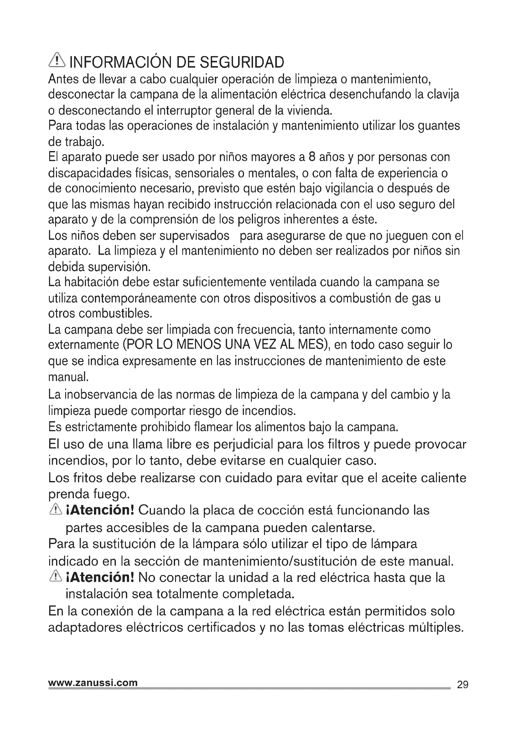 Antes de llevar a cabo cualquier operación de limpieza o mantenimiento, desconectar la campana de la alimentación eléctrica desenchufando la clavija o desconectando el interruptor general de la vivienda. Para todas las operaciones de instalación y mantenimiento utilizar los guantes de trabajo. El aparato puede ser usado por niños mayores a 8 años y por personas con discapacidades físicas, sensoriales o mentales, o con falta de experiencia o de conocimiento necesario, previsto que estén bajo vigilancia o después de que las mismas hayan recibido instrucción relacionada con el uso seguro del aparato y de la comprensión de los peligros inherentes a éste. Los niños deben ser supervisados para asegurarse de que no jueguen con el aparato. La limpieza y el mantenimiento no deben ser realizados por niños sin debida supervisión. La habitación debe estar suficientemente ventilada cuando la campana se utiliza contemporáneamente con otros dispositivos a combustión de gas u otros combustibles. La campana debe ser limpiada con frecuencia, tanto internamente como externamente (POR LO MENOS UNA VEZ AL MES), en todo caso seguir lo que se indica expresamente en las instrucciones de mantenimiento de este manual. La inobservancia de las normas de limpieza de la campana y del cambio y la limpieza puede comportar riesgo de incendios. Es estrictamente prohibido flamear los alimentos bajo la campana. El uso de una llama libre es perjudicial para los filtros y puede provocar incendios, por lo tanto, debe evitarse en cualquier caso. Los fritos debe realizarse con cuidado para evitar que el aceite caliente prenda fuego. ¡Atención! Cuando la placa de cocción está funcionando las partes accesibles de la campana pueden calentarse. Para la sustitución de la lámpara sólo utilizar el tipo de lámpara indicado en la sección de mantenimiento/sustitución de este manual. ¡Atención! No conectar la unidad a la red eléctrica hasta que la instalación sea totalmente completada. En la conexión de la campana a la red eléctrica están permitidos solo adaptadores eléctricos certificados y no las tomas eléctricas múltiples.30 www.zanussi.com