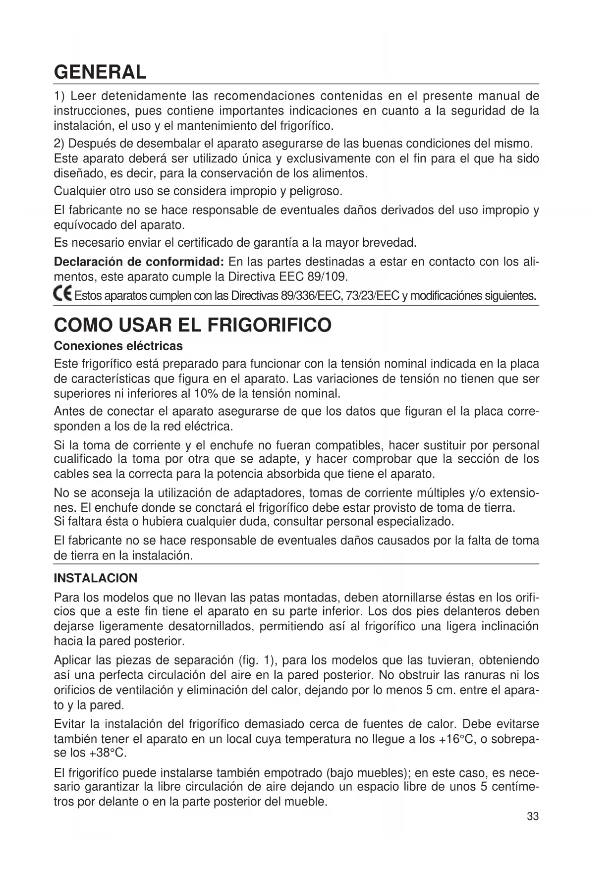Conexiones eléctricas Este frigorífico está preparado para funcionar con la tensión nominal indicada en la placa de características que figura en el aparato. Las variaciones de tensión no tienen que ser superiores ni inferiores al 10% de la tensión nominal. Antes de conectar el aparato asegurarse de que los datos que figuran el la placa corre- sponden a los de la red eléctrica. Si la toma de corriente y el enchufe no fueran compatibles, hacer sustituir por personal cualificado la toma por otra que se adapte, y hacer comprobar que la sección de los cables sea la correcta para la potencia absorbida que tiene el aparato. No se aconseja la utilización de adaptadores, tomas de corriente múltiples y/o extensio- nes. El enchufe donde se conctará el frigorífico debe estar provisto de toma de tierra. Si faltara ésta o hubiera cualquier duda, consultar personal especializado. El fabricante no se hace responsable de eventuales daños causados por la falta de toma de tierra en la instalación. INSTALACION Para los modelos que no llevan las patas montadas, deben atornillarse éstas en los orifi- cios que a este fin tiene el aparato en su parte inferior. Los dos pies delanteros deben dejarse ligeramente desatornillados, permitiendo así al frigorífico una ligera inclinación hacia la pared posterior. Aplicar las piezas de separación (fig. 1), para los modelos que las tuvieran, obteniendo así una perfecta circulación del aire en la pared posterior. No obstruir las ranuras ni los orificios de ventilación y eliminación del calor, dejando por lo menos 5 cm. entre el apara- to y la pared. Evitar la instalación del frigorífico demasiado cerca de fuentes de calor. Debe evitarse también tener el aparato en un local cuya temperatura no llegue a los +16°C, o sobrepa- se los +38°C. El frigorifíco puede instalarse también empotrado (bajo muebles); en este caso, es nece- sario garantizar la libre circulación de aire dejando un espacio libre de unos 5 centíme- tros por delante o en la parte posterior del mueble. 33Una mala instalación podría causar daños a personas, animles u objetos, de los cuales el fabricante no podría hacerse responsable. CONSEJOS PARA EL CONTROL DE LA TEMPERATURA Y PARA EL RESPETO DE