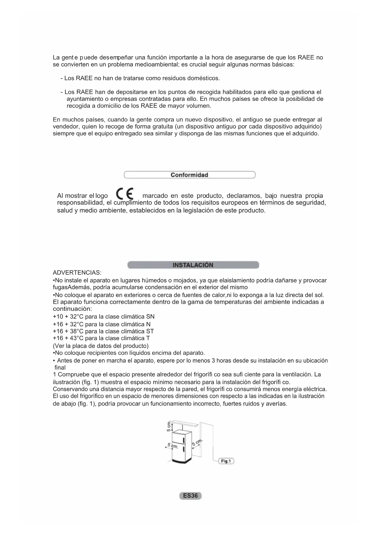 Este dispositivo tiene el distintivo de la directiva europea 2012/19/UE sobre Residuos de Aparatos Eléctricos y Electrónicos (RAEE). Los RAEE contienen tanto sustancias contaminantes (que pueden repercutir negativamente en el medio ambiente) como componentes básicos (que pueden reutilizarse). Es importante que los RAEE se sometan a tratamientos específicos con el objeto de extraer y eliminar, de forma adecuada, todos los agentes contaminantes. Igual de importante es recuperar y reciclar todo el material posible. ES35El aparato funciona correctamente dentro de la gama de temperaturas del ambiente indicadas a continuación: ADVERTENCIAS: islamiento podría dañarse y provocar fugasAdemás, podría acumularse condensación en el exterior del mismo r,ni lo exponga a la luz directa del sol. +10 + 32°C para la clase climática SN +16 + 32°C para la clase climática N +16 + 38°C para la clase climática ST +16 + 43°C para la clase climática T (Ver la placa de datos del producto)