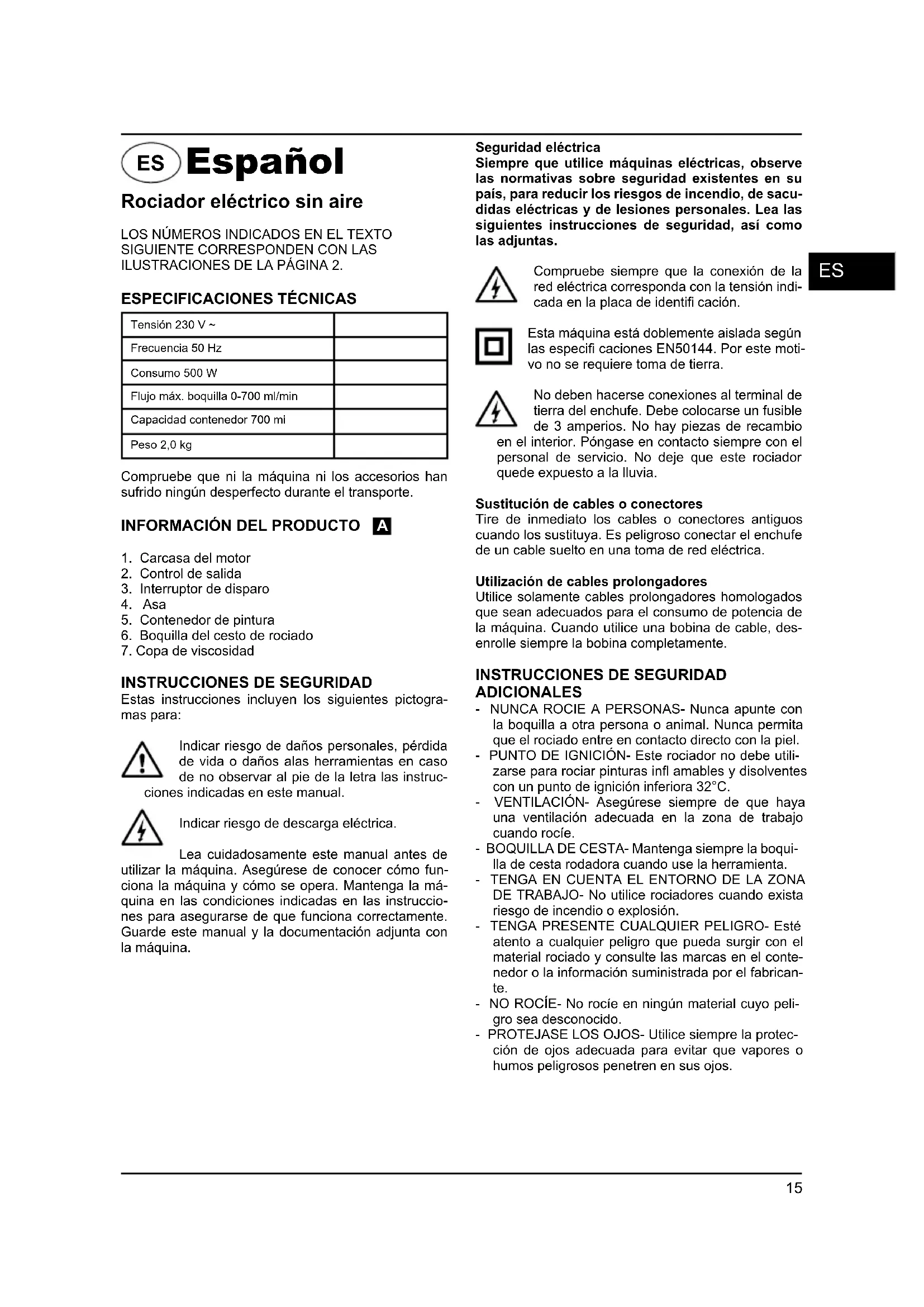 Estas instrucciones incluyen los siguientes pictogra- mas para: Indicar riesgo de daños personales, pérdida de vida o daños alas herramientas en caso de no observar al pie de la letra las instruc- ciones indicadas en este manual. Indicar riesgo de descarga eléctrica. Lea cuidadosamente este manual antes de utilizar la máquina. Asegúrese de conocer cómo fun- ciona la máquina y cómo se opera. Mantenga la má- quina en las condiciones indicadas en las instruccio- nes para asegurarse de que funciona correctamente. Guarde este manual y la documentación adjunta con la máquina. Seguridad eléctrica Siempre que utilice máquinas eléctricas, observe las normativas sobre seguridad existentes en su país, para reducir los riesgos de incendio, de sacu- didas eléctricas y de lesiones personales. Lea las siguientes instrucciones de seguridad, así como las adjuntas. Compruebe siempre que la conexión de la red eléctrica corresponda con la tensión indi- cada en la placa de identifi cación. Esta máquina está doblemente aislada según las especifi caciones EN50144. Por este moti- vo no se requiere toma de tierra. No deben hacerse conexiones al terminal de tierra del enchufe. Debe colocarse un fusible de 3 amperios. No hay piezas de recambio en el interior. Póngase en contacto siempre con el personal de servicio. No deje que este rociador quede expuesto a la lluvia. Sustitución de cables o conectores Tire de inmediato los cables o conectores antiguos cuando los sustituya. Es peligroso conectar el enchufe de un cable suelto en una toma de red eléctrica. Utilización de cables prolongadores Utilice solamente cables prolongadores homologados que sean adecuados para el consumo de potencia de la máquina. Cuando utilice una bobina de cable, des- enrolle siempre la bobina completamente.