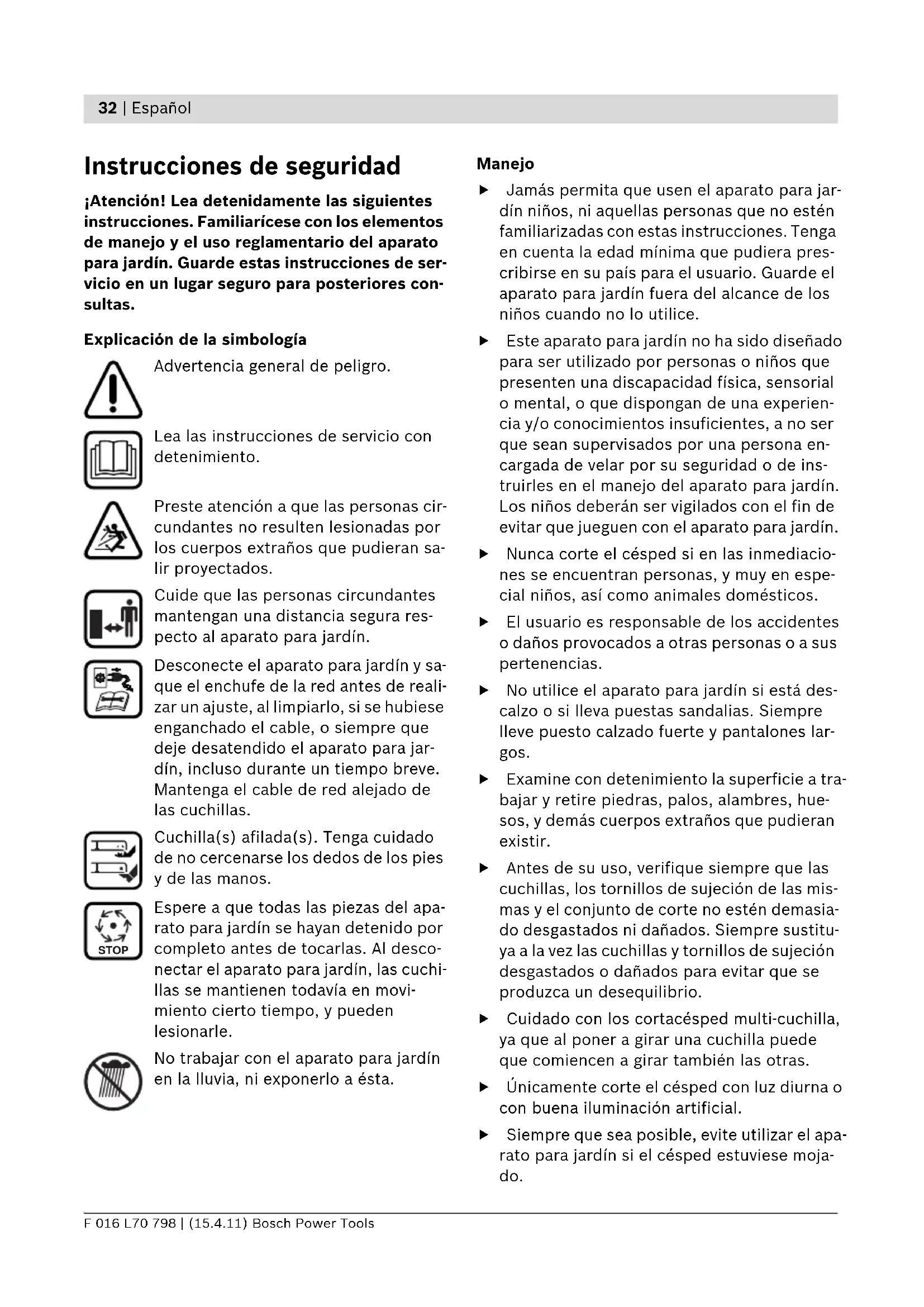 Instrucciones de seguridad ¡Atención! Lea detenidamente las siguientes instrucciones. Familiarícese con los elementos de manejo y el uso reglamentario del aparato para jardín. Guarde estas instrucciones de ser- vicio en un lugar seguro para posteriores con- sultas. Explicación de la simbología Advertencia general de peligro. Lea las instrucciones de servicio con detenimiento. Preste atención a que las personas cir- cundantes no resulten lesionadas por los cuerpos extraños que pudieran sa- lir proyectados. Cuide que las personas circundantes mantengan una distancia segura res- pecto al aparato para jardín. Desconecte el aparato para jardín y sa- que el enchufe de la red antes de reali- zar un ajuste, al limpiarlo, si se hubiese enganchado el cable, o siempre que deje desatendido el aparato para jar- dín, incluso durante un tiempo breve. Mantenga el cable de red alejado de las cuchillas. Cuchilla(s) afilada(s). Tenga cuidado de no cercenarse los dedos de los pies y de las manos. Espere a que todas las piezas del apa- rato para jardín se hayan detenido por completo antes de tocarlas. Al desco- nectar el aparato para jardín, las cuchi- llas se mantienen todavía en movi- miento cierto tiempo, y pueden lesionarle. No trabajar con el aparato para jardín en la lluvia, ni exponerlo a ésta. Manejo f Jamás permita que usen el aparato para jar- dín niños, ni aquellas personas que no estén familiarizadas con estas instrucciones. Tenga en cuenta la edad mínima que pudiera pres- cribirse en su país para el usuario. Guarde el aparato para jardín fuera del alcance de los niños cuando no lo utilice. f Este aparato para jardín no ha sido diseñado para ser utilizado por personas o niños que presenten una discapacidad física, sensorial o mental, o que dispongan de una experien- cia y/o conocimientos insuficientes, a no ser que sean supervisados por una persona en- cargada de velar por su seguridad o de ins- truirles en el manejo del aparato para jardín. Los niños deberán ser vigilados con el fin de evitar que jueguen con el aparato para jardín. f Nunca corte el césped si en las inmediacio- nes se encuentran personas, y muy en espe- cial niños, así como animales domésticos. f El usuario es responsable de los accidentes o daños provocados a otras personas o a sus pertenencias. f No utilice el aparato para jardín si está des- calzo o si lleva puestas sandalias. Siempre lleve puesto calzado fuerte y pantalones lar- gos. f Examine con detenimiento la superficie a tra- bajar y retire piedras, palos, alambres, hue- sos, y demás cuerpos extraños que pudieran existir. f Antes de su uso, verifique siempre que las cuchillas, los tornillos de sujeción de las mis- mas y el conjunto de corte no estén demasia- do desgastados ni dañados. Siempre sustitu- ya a la vez las cuchillas y tornillos de sujeción desgastados o dañados para evitar que se produzca un desequilibrio. f Cuidado con los cortacésped multi-cuchilla, ya que al poner a girar una cuchilla puede que comiencen a girar también las otras. f Únicamente corte el césped con luz diurna o con buena iluminación artificial. f Siempre que sea posible, evite utilizar el apa- rato para jardín si el césped estuviese moja- do. STOP OBJ_BUCH-1393-001.book Page 32 Friday, April 15, 2011 10:36 AMEspañol | 33 Bosch Power Tools F 016 L70 798 | (15.4.11) f Siempre marche de forma pausada y nunca de forma apresurada. f El trabajo en pendientes puede resultar peli- groso. – No corte el césped en pendientes muy pronunciadas. – Cuide en mantener un paso seguro al tra- bajar superficies inclinadas o césped hú- medo. – Siempre corte el césped en superficies in- clinadas procediendo de un lado a otro y jamás hacia arriba o hacia abajo. – Proceda con especial cautela al invertir la dirección de marcha en pendientes. – Preste gran atención al andar hacia atrás o al tirar del aparato para jardín hacia Ud. – Siempre corte el césped empujando el aparato para jardín hacia delante y jamás atrayéndolo hacia su cuerpo. f Las cuchillas deberán estar detenidas si tu- viese que inclinar el aparato para jardín para transportarlo, al sobrepasar áreas sin césped y al aproximarse o apartarse del lugar en el que desee cortar el césped. f No incline el aparato para jardín al poner en marcha el motor, a no ser que ello sea nece- sario por ser el césped muy alto. En este ca- so, presione hacia abajo la empuñadura lo imprescindible nada más, para bascular ha- cia arriba el lado contrario del aparato para jardín al que se encuentra Ud. Cuide que am- bas manos estén sujetando la empuñadura cuando vuelva a descender el aparato para jardín. f Conecte el aparato para jardín según se indi- ca en las instrucciones de uso, prestando atención a que sus pies mantengan una sepa- ración suficiente respecto a las piezas en ro- tación. f No aproxime sus manos ni los pies a las pie- zas en rotación. f Guarde una separación respecto a la zona de expulsión al trabajar con el aparato para jar- dín. f Jamás alce o sustente el aparato para jardín con el motor en marcha. f Jamás trabaje con el aparato para jardín si los dispositivos protectores o cubiertas estu- viesen defectuosos, o sin estar montados los dispositivos de seguridad como, p. ej., la cu- bierta de protección y/o el cesto colector de césped. f Proceda con especial cautela al efectuar tra- bajos de ajuste en el cortacésped para no atraparse las manos o pies entre las cuchillas móviles y las piezas fijas del cortacésped. f Mantenga apartados de las cuchillas los ca- bles de red y prolongación. La cuchilla puede dañar los cables exponiéndose Ud. así a tocar partes que se encuentren bajo tensión. Aten- ción, podría sufrir una descarga eléctrica. Extraiga el enchufe de la toma de corriente: – Siempre que se aparte del aparato para jar- dín. – Antes de eliminar una obstrucción de mate- rial. – Al examinar, limpiar o manipular en el apara- to para ja