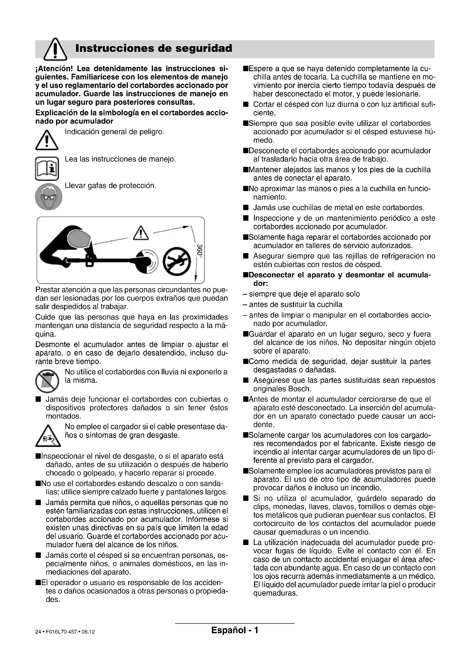 Sous réserve de modifications Elimination de déchets Service après-vente Déclaration de conformité F016L70 457.book Seite 6 Montag, 18. Dezember 2006 9:45 09 23 • F016L70 457 • 06.12Español - 1 ¡Atención! Lea detenidamente las instrucciones si- guientes. Familiarícese con los elementos de manejo y el uso reglamentario del cortabordes accionado por acumulador. Guarde las instrucciones de manejo en un lugar seguro para posteriores consultas. Explicación de la simbología en el cortabordes accio- nado por acumulador Indicación general de peligro. Lea las instrucciones de manejo. Llevar gafas de protección. Prestar atención a que las personas circundantes no pue- dan ser lesionadas por los cuerpos extraños que puedan salir despedidos al trabajar. Cuide que las personas que haya en las proximidades mantengan una distancia de seguridad respecto a la má- quina. Desmonte el acumulador antes de limpiar o ajustar el aparato, o en caso de dejarlo desatendido, incluso du- rante breve tiempo. No utilice el cortabordes con lluvia ni exponerlo a la misma. ■ Jamás deje funcionar el cortabordes con cubiertas o dispositivos protectores dañados o sin tener éstos montados. No emplee el cargador si el cable presentase da- ños o síntomas de gran desgaste. ■ Inspeccionar el nivel de desgaste, o si el aparato está dañado, antes de su utilización o después de haberlo chocado o golpeado, y hacerlo reparar si procede. ■ No use el cortabordes estando descalzo o con sanda- lias; utilice siempre calzado fuerte y pantalones largos. ■ Jamás permita que niños, o aquellas personas que no estén familiarizadas con estas instrucciones, utilicen el cortabordes accionado por acumulador. Infórmese si existen unas directivas en su país que limiten la edad del usuario. Guarde el cortabordes accionado por acu- mulador fuera del alcance de los niños. ■ Jamás corte el césped si se encuentran personas, es- pecialmente niños, o animales domésticos, en las in- mediaciones del aparato. ■ El operador o usuario es responsable de los acciden- tes o daños ocasionados a otras personas o propieda- des. ■ Espere a que se haya detenido completamente la cu- chilla antes de tocarla. La cuchilla se mantiene en mo- vimiento por inercia cierto tiempo todavía después de haber desconectado el motor, y puede lesionarle. ■ Cortar el césped con luz diurna o con luz artificial sufi- ciente. ■ Siempre que sea posible evite utilizar el cortabordes accionado por acumulador si el césped estuviese hú- medo. ■ Desconecte el cortabordes accionado por acumulador al trasladarlo hacia otra área de trabajo. ■ Mantener alejados las manos y los pies de la cuchilla antes de conectar el aparato. ■ No aproximar las manos o pies a la cuchilla en funcio- namiento. ■ Jamás use cuchillas de metal en este cortabordes. ■ Inspeccione y de un mantenimiento periódico a este cortabordes accionado por acumulador. ■ Solamente haga reparar el cortabordes accionado por acumulador en talleres de servicio autorizados. ■ Asegurar siempre que las rejillas de refrigeración no estén cubiertas con restos de césped. ■ Desconectar el aparato y desmontar el acumula- dor: – siempre que deje el aparato solo – antes de sustituir la cuchilla – antes de limpiar o manipular en el cortabordes accio- nado por acumulador. ■ Guardar el aparato en un lugar seguro, seco y fuera del alcance de los niños. No depositar ningún objeto sobre el aparato. ■ Como medida de seguridad, dejar sustituir la partes desgastadas o dañadas. ■ Asegúrese que las partes sustituidas sean repuestos originales Bosch. ■ Antes de montar el acumulador cerciorarse de que el aparato esté desconectado. La inserción del acumula- dor en un aparato conectado puede causar un acci- dente. ■ Solamente cargar los acumuladores con los cargado- res recomendados por el fabricante. Existe riesgo de incendio al intentar cargar acumuladores de un tipo di- ferente al previsto para el cargador. ■ Solamente emplee los acumuladores previstos para el aparato. El uso de otro tipo de acumuladores puede provocar daños e incluso un incendio. ■ Si no utiliza el acumulador, guárdelo separado de clips, monedas, llaves, clavos, tornillos o demás obje- tos metálicos que pudieran puentear sus contactos. El cortocircuito de los contactos del acumulador puede causar quemaduras o un incendio. ■ La utilización inadecuada del acumulador puede pro- vocar fugas de líquido. Evite el contacto con él. En caso de un contacto accidental enjuagar el área afec- tada con abundante agua. En caso de un contacto con los ojos recurra además inmediatamente a un médico. El líquido del acumulador puede irritar la piel o producir quemaduras. Instrucciones de seguridad 360° F016L70 457.book Seite 1 Montag, 18. Dezember 2006 9:45 09 24 • F016L70 457 • 06.12Español - 2 El aparato ha sido diseñado para cortar césped y malas hierbas debajo de arbustos, y en pendientes o bordes que no sean accesibles con el cortacés- ped. Su uso reglamentario implica además la utilización a una temperatura ambiente entre 0 °C y 40 °C. Este manual contiene instrucciones importantes para el montaje correcto y la utilización segura de su aparato. Por ello, es muy importante que lea deteni- damente esta instrucciones. Saque con cuidado del embalaje el cortabordes ac- cionado por acumulador y verifique si se adjuntan todas las piezas mencionadas a continuación: – Cortadora peinadora – Caperuza protectora – Plato de corte – Cuchilla de corte – Cargador – Instrucciones de manejo Si faltasen piezas, o si alguna de ellas estuviese dañada, di- ríjase por favor al comercio de su adquisición. 1 Interruptor de conexión/desconexión 2 Empuñadura 3 Empuñadura guía 4 Barra superior 5 Barra inferior 6 Cabezal 7 Rejillas de refrigeración 8 Caperuza protectora 9 Acumulador 10 Cargador 11 Alojamiento para carga del acumulador 12 Indicador por LED 13 Enchufe de red** 14 N
