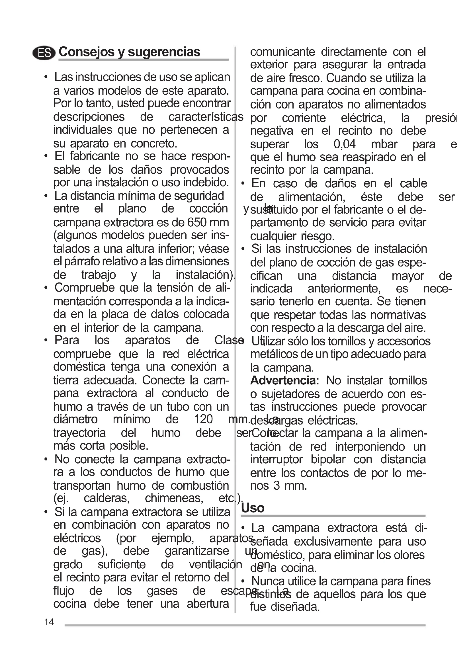 - No deje nunca llamas altas bajo la campana cuando está en fun- cionamiento.