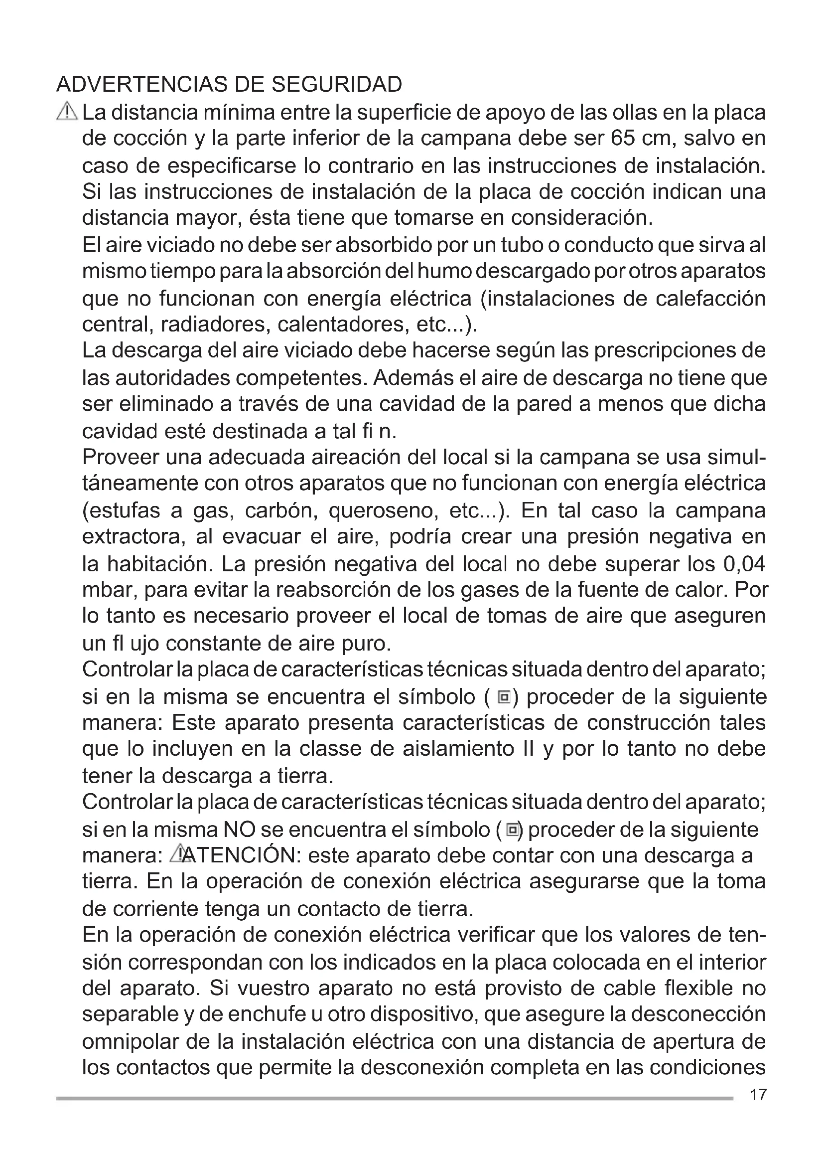 La distancia mínima entre la superfi cie de apoyo de las ollas en la placa de cocción y la parte inferior de la campana debe ser 65 cm, salvo en caso de especifi carse lo contrario en las instrucciones de instalación. Si las instrucciones de instalación de la placa de cocción indican una distancia mayor, ésta tiene que tomarse en consideración. El aire viciado no debe ser absorbido por un tubo o conducto que sirva al mismo tiempo para la absorción del humo descargado por otros aparatos que no funcionan con energía eléctrica (instalaciones de calefacción central, radiadores, calentadores, etc...). La descarga del aire viciado debe hacerse según las prescripciones de las autoridades competentes. Además el aire de descarga no tiene que ser eliminado a través de una cavidad de la pared a menos que dicha cavidad esté destinada a tal fi n. Proveer una adecuada aireación del local si la campana se usa simul- táneamente con otros aparatos que no funcionan con energía eléctrica (estufas a gas, carbón, queroseno, etc...). En tal caso la campana extractora, al evacuar el aire, podría crear una presión negativa en la habitación. La presión negativa del local no debe superar los 0,04 mbar, para evitar la reabsorción de los gases de la fuente de calor. Por lo tanto es necesario proveer el local de tomas de aire que aseguren un fl ujo constante de aire puro. Controlar la placa de características técnicas situada dentro del aparato; si en la misma se encuentra el símbolo ( ) proceder de la siguiente manera: Este aparato presenta características de construcción tales que lo incluyen en la classe de aislamiento II y por lo tanto no debe tener la descarga a tierra. Controlar la placa de características técnicas situada dentro del aparato; si en la misma NO se encuentra el símbolo ( ) proceder de la siguiente manera: ATENCIÓN: este aparato debe contar con una descarga a tierra. En la operación de conexión eléctrica asegurarse que la toma de corriente tenga un contacto de tierra. En la operación de conexión eléctrica verifi car que los valores de ten- sión correspondan con los indicados en la placa colocada en el interior del aparato. Si vuestro aparato no está provisto de cable fl exible no separable y de enchufe u otro dispositivo, que asegure la desconección omnipolar de la instalación eléctrica con una distancia de apertura de los contactos que permite la desconexión completa en las condiciones18 de la categoría de sobretensión III, dicha dispositivos de separación de la red deben ser incluidos en la fi ja en la fuente de alimentación en conformidad con las normas de instalación. Si su aparato está provisto de cable de alimentación y enchufe, deberá ser dispuesto de manera que el enchufe quede accesible. Antes de proceder a cualquier operación de limpieza o de mantenimiento es necesario desconectar el aparato. Si el cable de alimentación está dañado, debe ser sustituido por el mismo fabricante o por el servicio de asistencia técnica, o de todos modos por una persona que posea una cualifi cación similar, de modo de prevenir cualquier tipo de riesgo. Advertencia: Si no se instalan los tornillos o dispositivos de fi jación de acuerdo con estas instrucciones puede resultar en riesgos eléctricos. La instalación se debe realizar siguiendo estas instrucciones y por personal profesionalmente califi cado. Evitar el uso de materiales o sustancias infl amables cerca del aparato. Prohibido fl amblear directamente bajo la campana. En el caso de freír tener suma atención al peligro de incendio que con- stituyen el aceite y las grasas. Particularmente peligroso por su infl ama- bilidad es el aceite ya usado. No usar parrillas eléctricas descubiertas. Para evitar un posible riesgo de incendio, atenerse a las instrucciones indicadas respecto a la limpieza de los fi ltros antigrasa y a la eliminación de eventuales depósitos de grasa sobre el aparato. La campana puede ser utilizado por los niños menores de 8 años de edad y las personas con capacidades físicas, sensoriales o mentales reducidas, o bien con poca experiencia o conocimiento necesarios, siempre bajo la supervisión o después de la misma han sido instruidos por un responsable su seguridad relacionada con el uso seguro de los equipos y la comprensión de los peligros inherentes a ella. Los niños no deben jugar con el aparato. La limpieza y el mantenimiento destinado a ser realizada por el usuario no deben ser llevadas a cabo por los niños sin supervisión. Atención: Hay partes accesibles que pueden calentarse al utilizarse con equipos de cocción. Esta campana está destinada a la instalación en cocinas para uso doméstico, dispositivos de cocción y equipos de cocina similares.19 USO ¿FILTRANTE O ASPIRADORA? La campana puede instalarse en versión aspira- dora o fi ltrante. Decida desde el principio el tipo de instalación). Para mejorar las prestaciones, aconsejamos instalar la campana en la versión aspiradora (si es posible). Versión aspiradora La campana depura el aire y lo expulsa hacia fuera a través de un conducto de extracción. Versión fi ltrante La campana depura el aire y vuelve a introducir el aire limpio en la habitación. MANTENIMIENTO Un cuidadoso mantenimiento garantiza un buen funcio-namiento y un buen rendimiento en el tiempo. La eliminación de los eventuales depósitos de grasa en el aparato debe ser efectuada periódicamente en base a la frecuencia de uso (al menos cada 2 meses). Evitar el empleo de productos abrasivos o corrosivos. Para la limpie- za externa de los aparatos pintados, servirse de un paño humedecido con agua tibia y detergente neutro; para la de los aparatos de acero, cobre o latón se aconseja el uso de productos específi c- os, siguiendo las instrucciones indicadas en los mismos. Para la limpieza interna del aparato, usar un paño o pincel embebido en alcohol etílico de quemar. Limpie los fi ltros antigrasa por lo menos cada 2 meses para evita